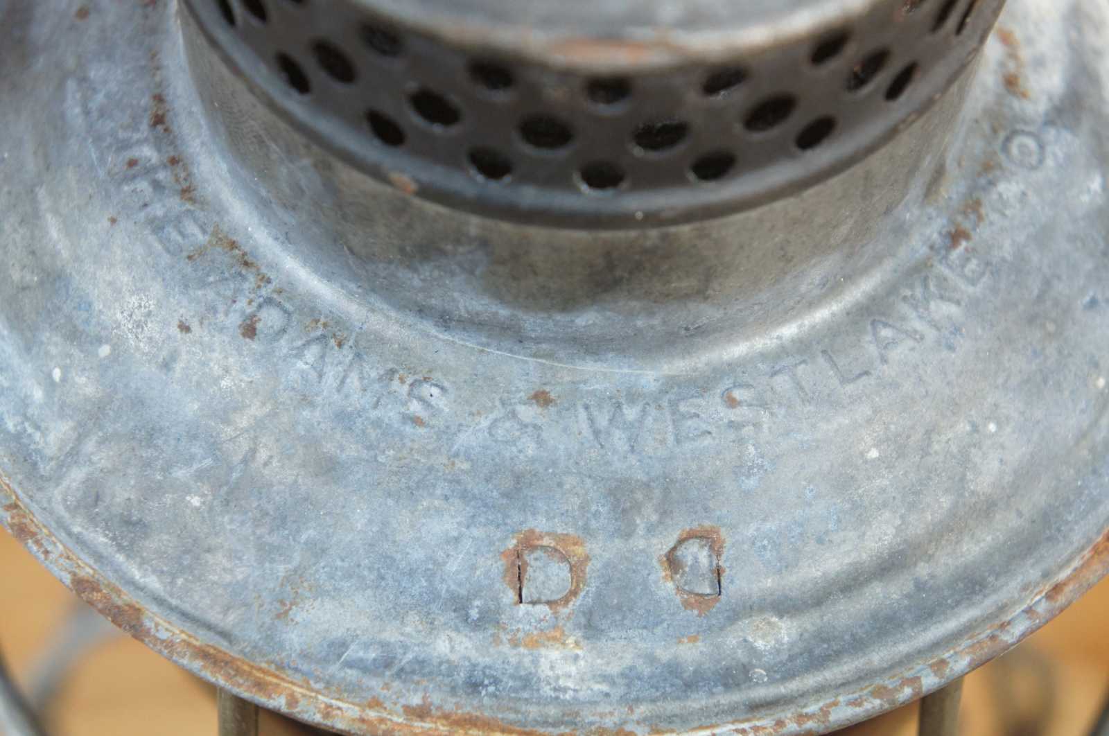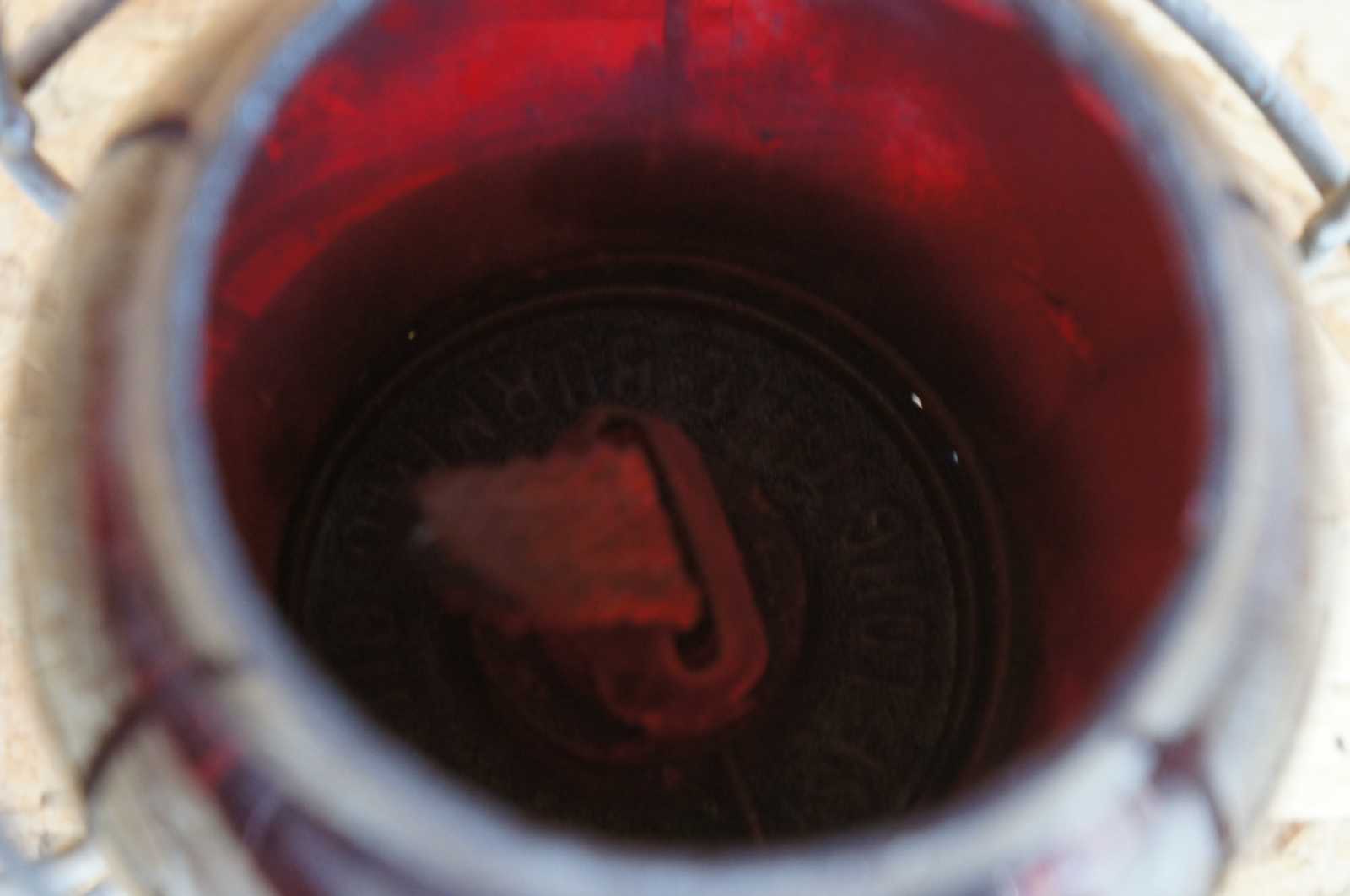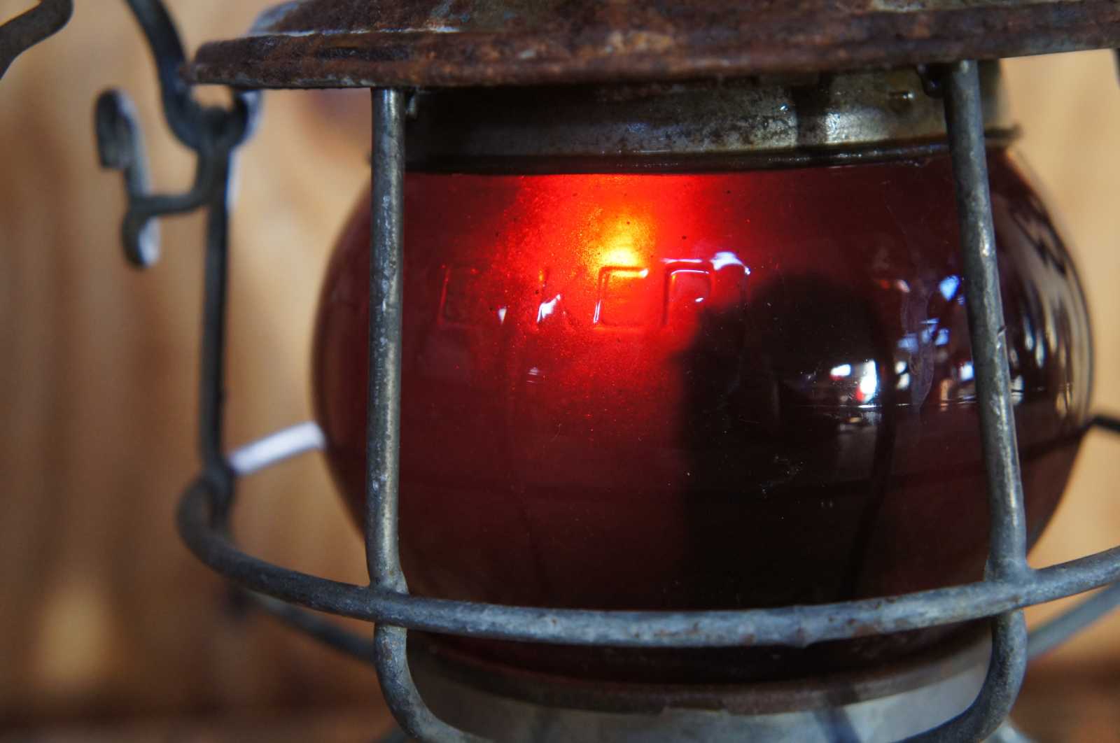 Antique Adams & Westlake Adlake oil lantern featuring ruby red globe and metal frame.