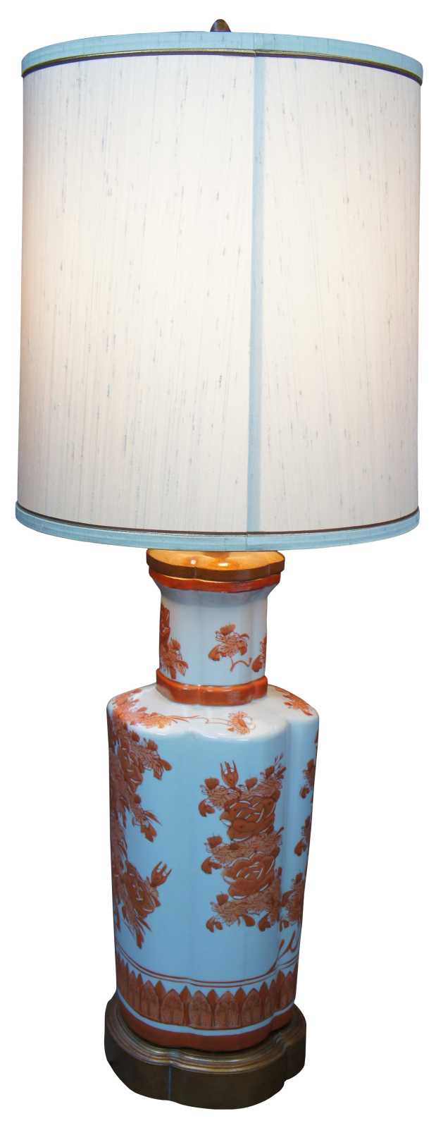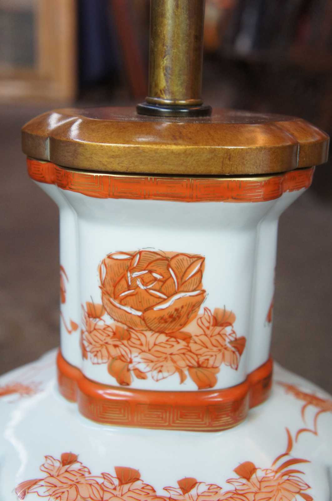 Mid Century Chinese mantel urn lamp. Made of porcelain featuring scalloped form with a coral colored field of roses and barrel shade.