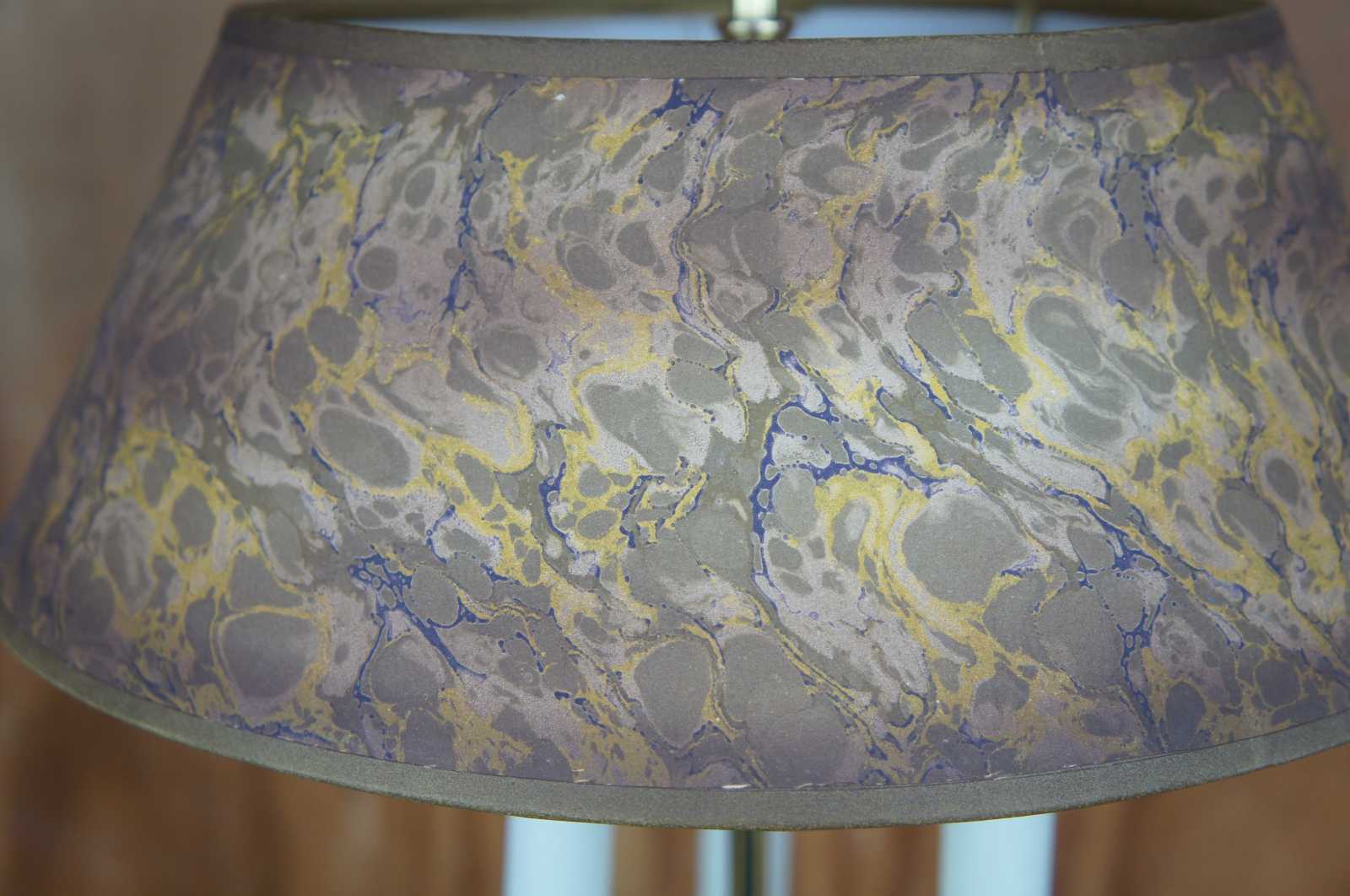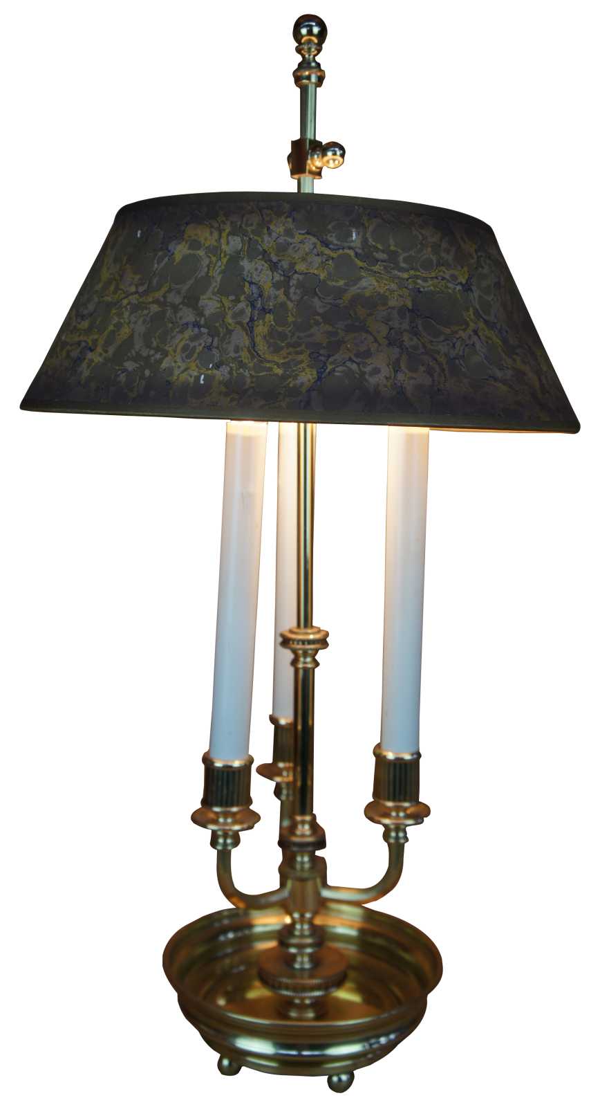 Mid century French Bouillotte table lamp. Made of brass featuring round footed circular tray base, three candlesticks lights and round marbled shade.