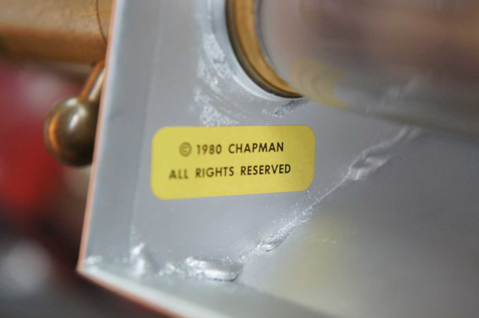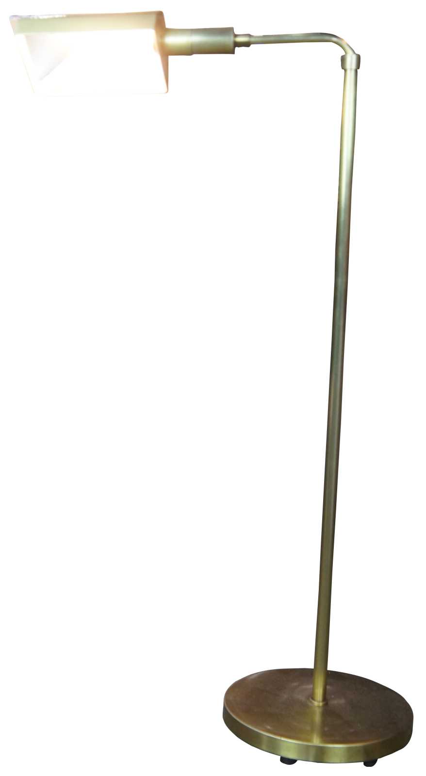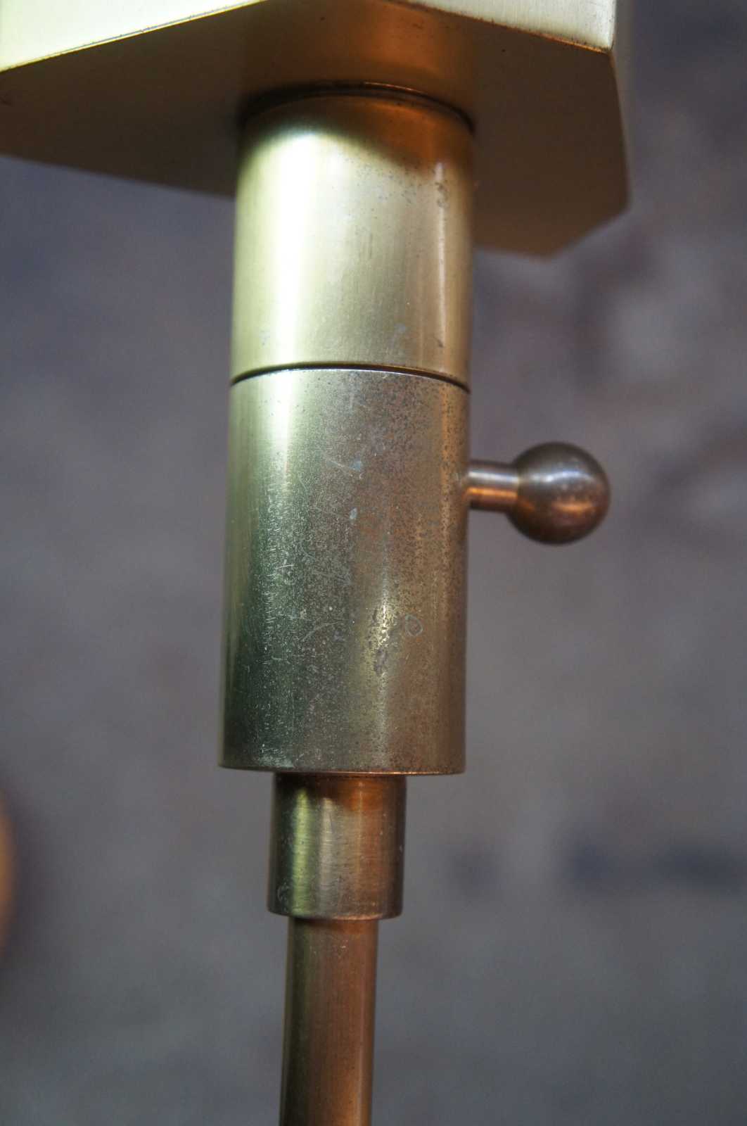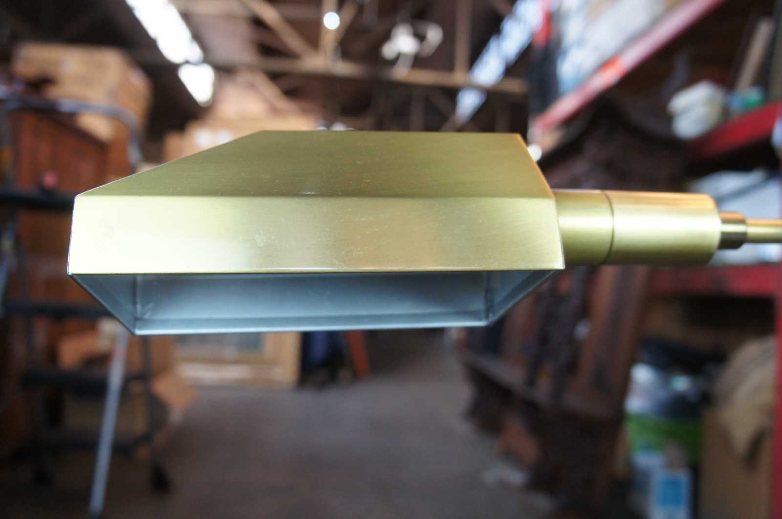 1980 Chapman Mfg Co adjustable floor lamp. Made of brass featuring round base with triangular geometric form shade.