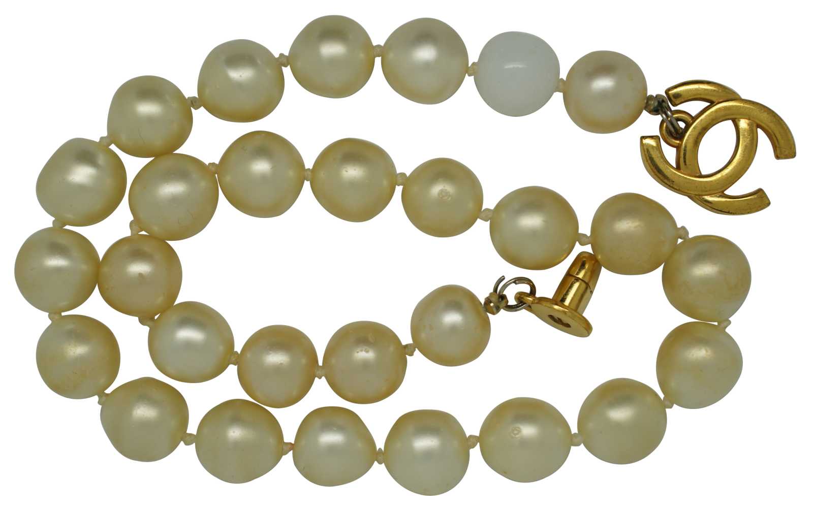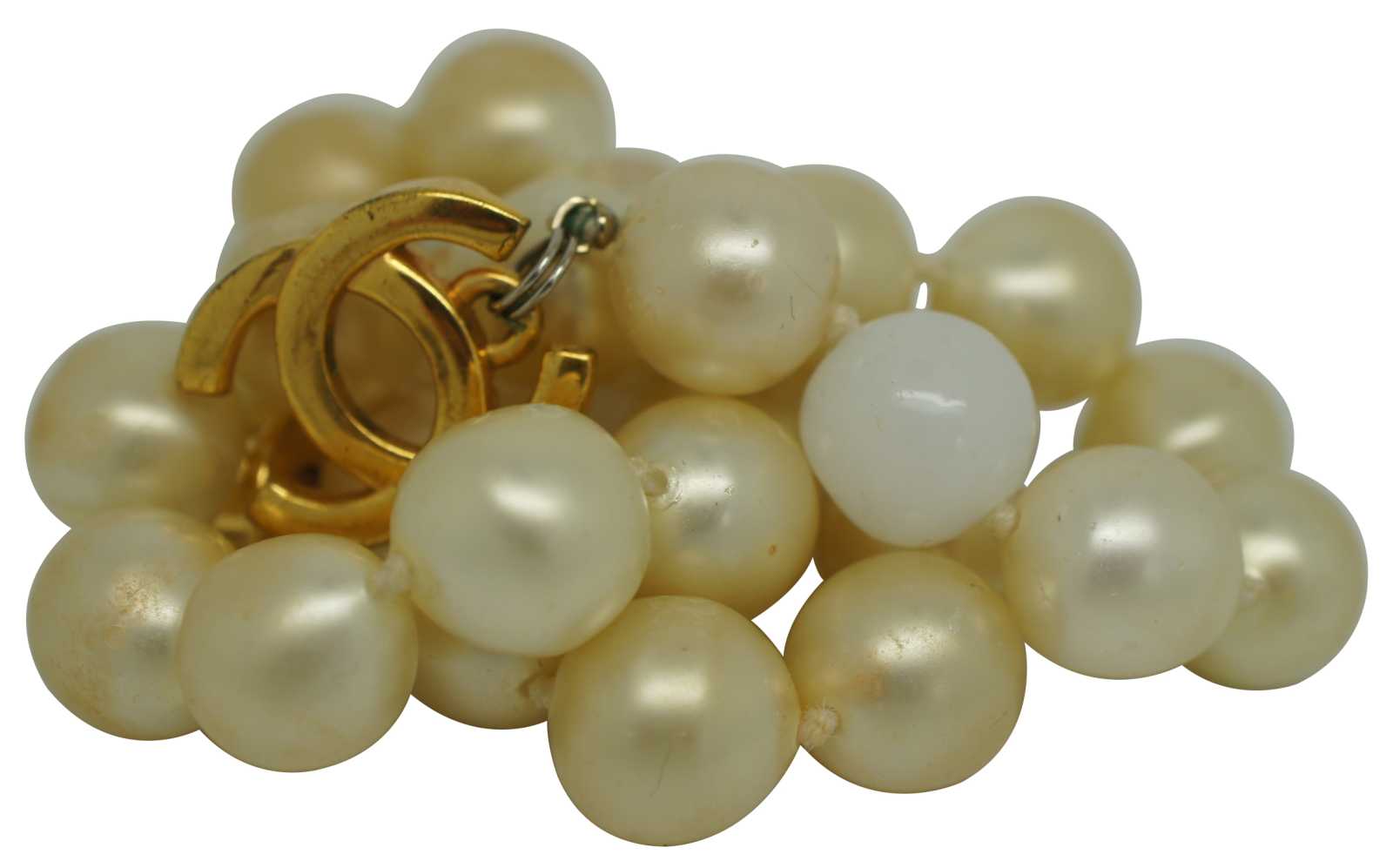 Vintage Chanel France imitation pearl necklace with gold tone interlocking-C clasp. 96P