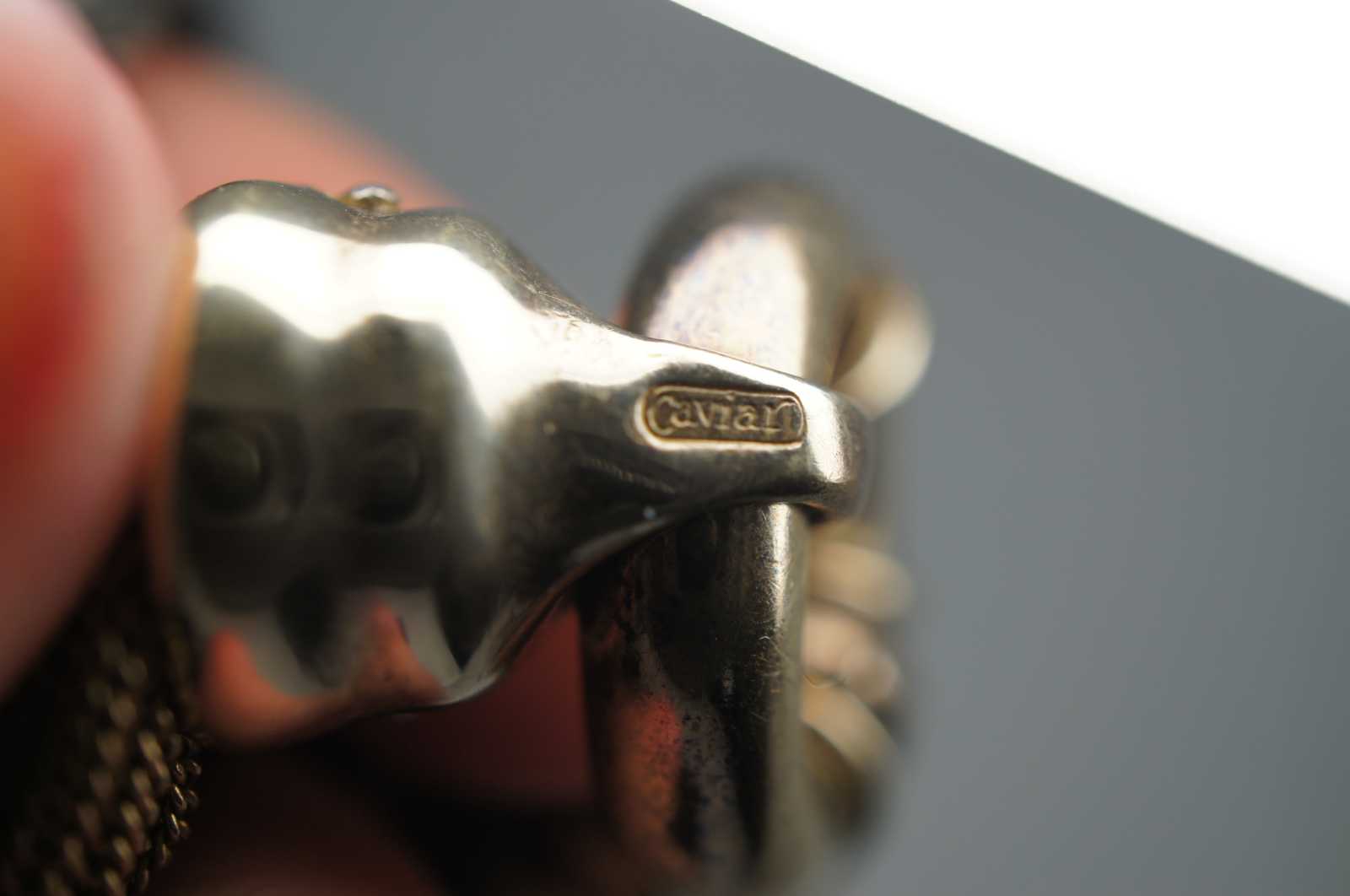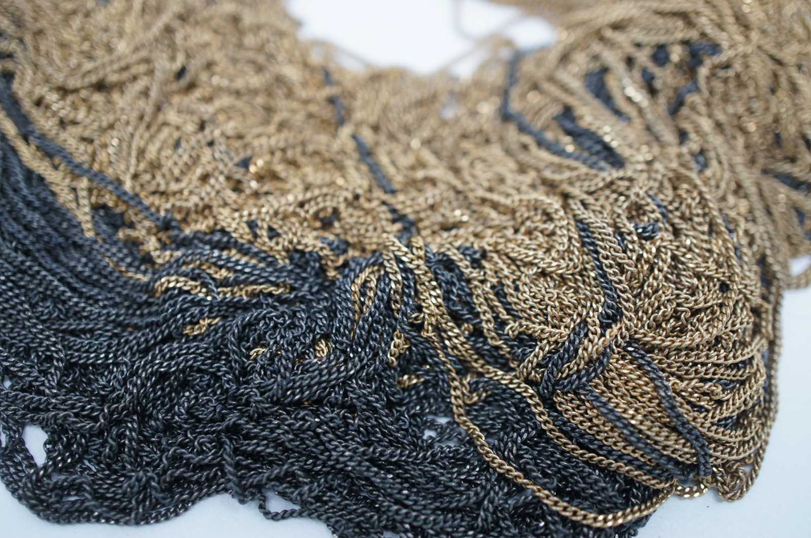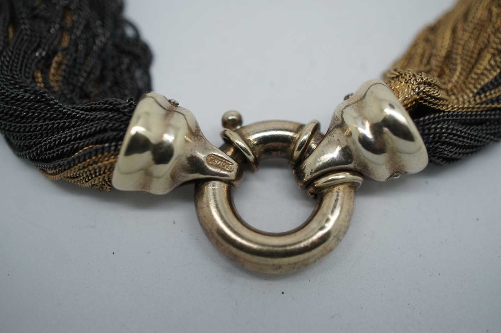 Vintage Caviar Italy sterling silver 925 choker statement necklace featuring numerous strands of slender vermeil mesh chain toned in black and gold.