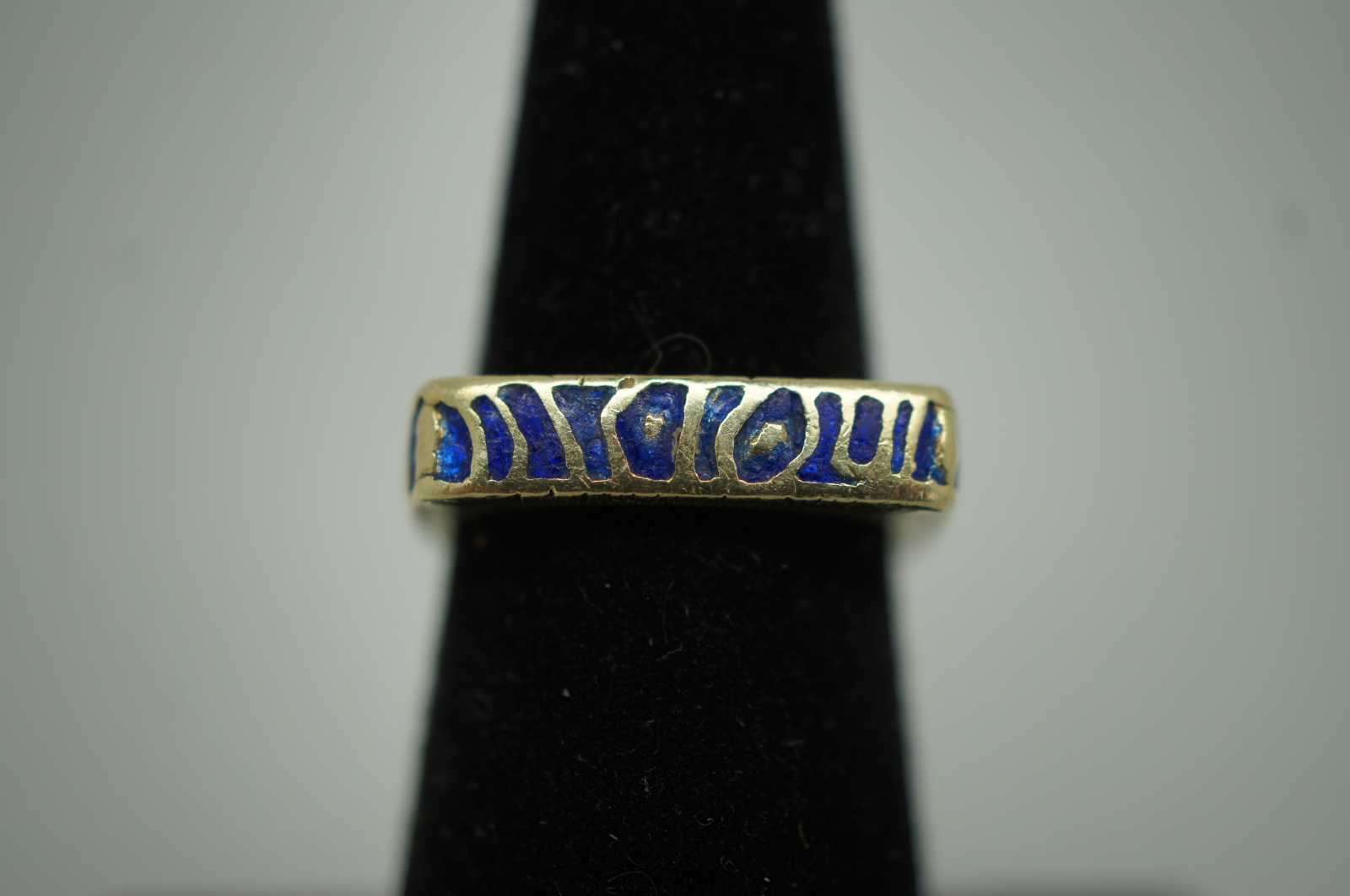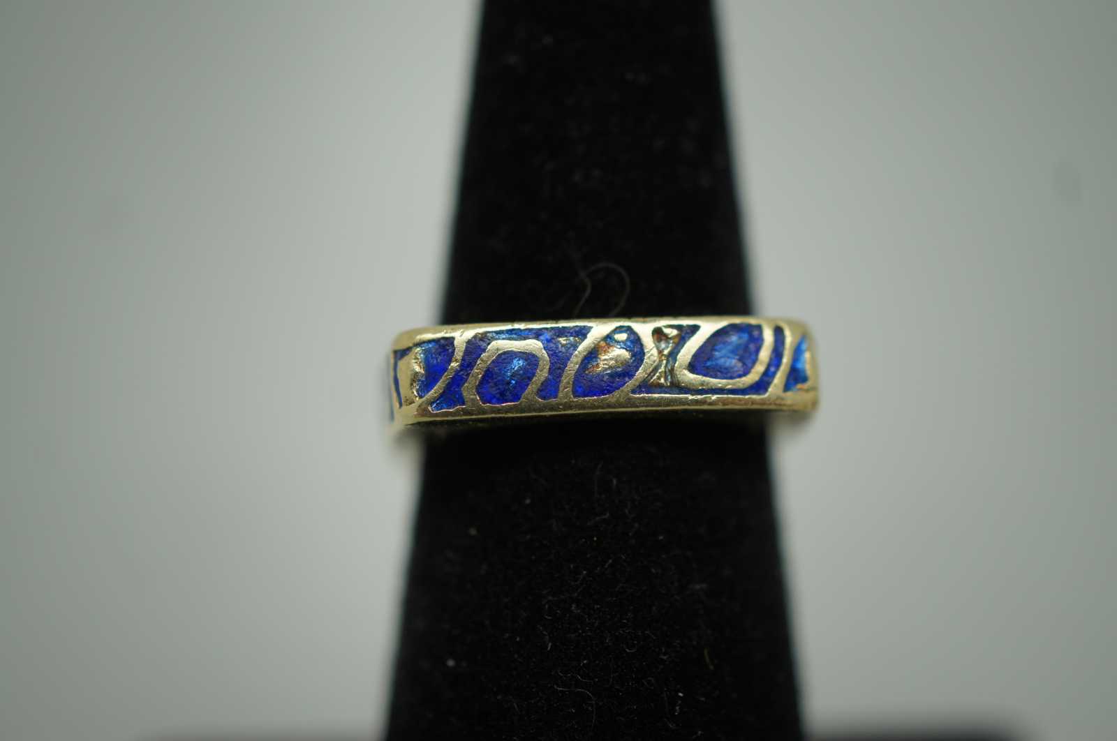 Vintage 14K yellow gold ring with squared off corners and inset with a geometric design in cobalt blue enamel.