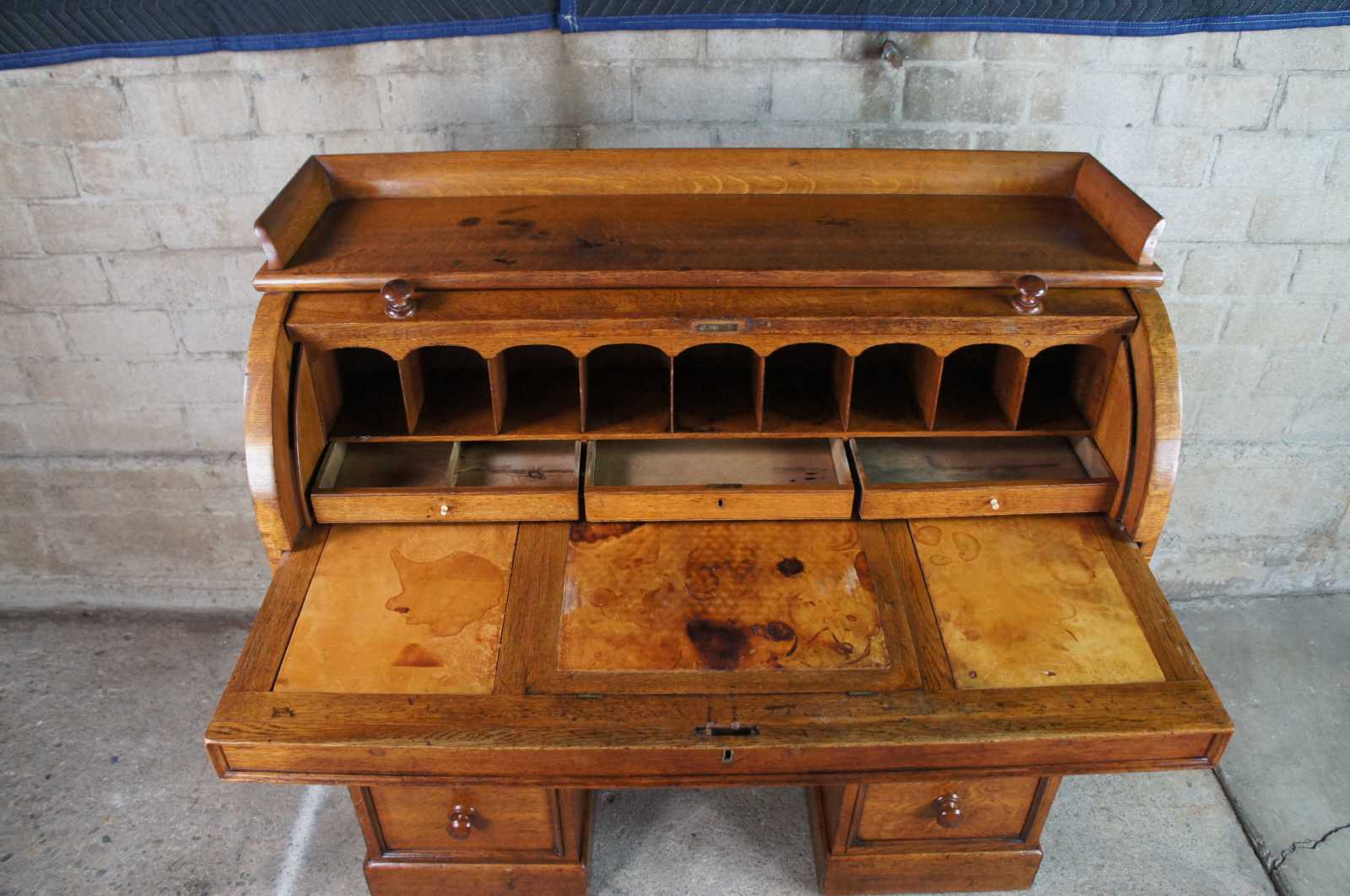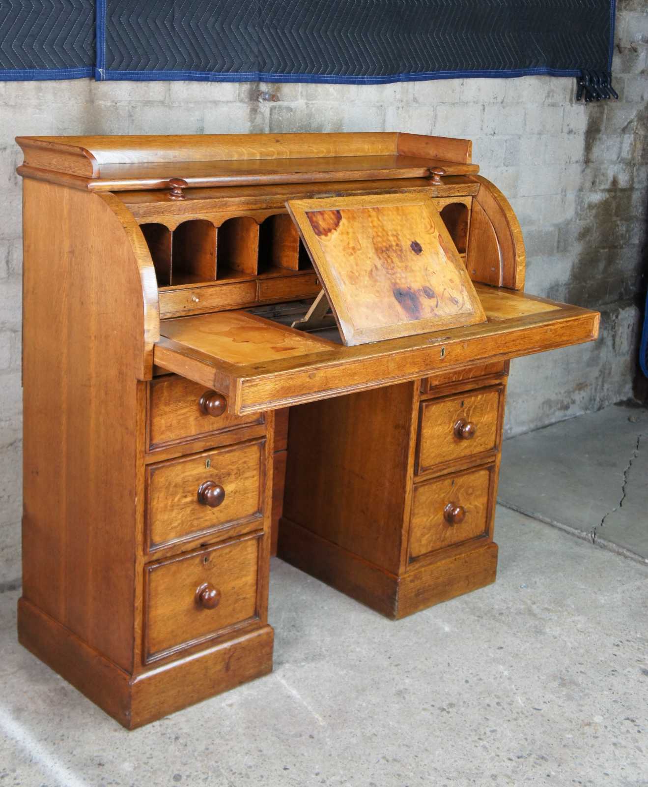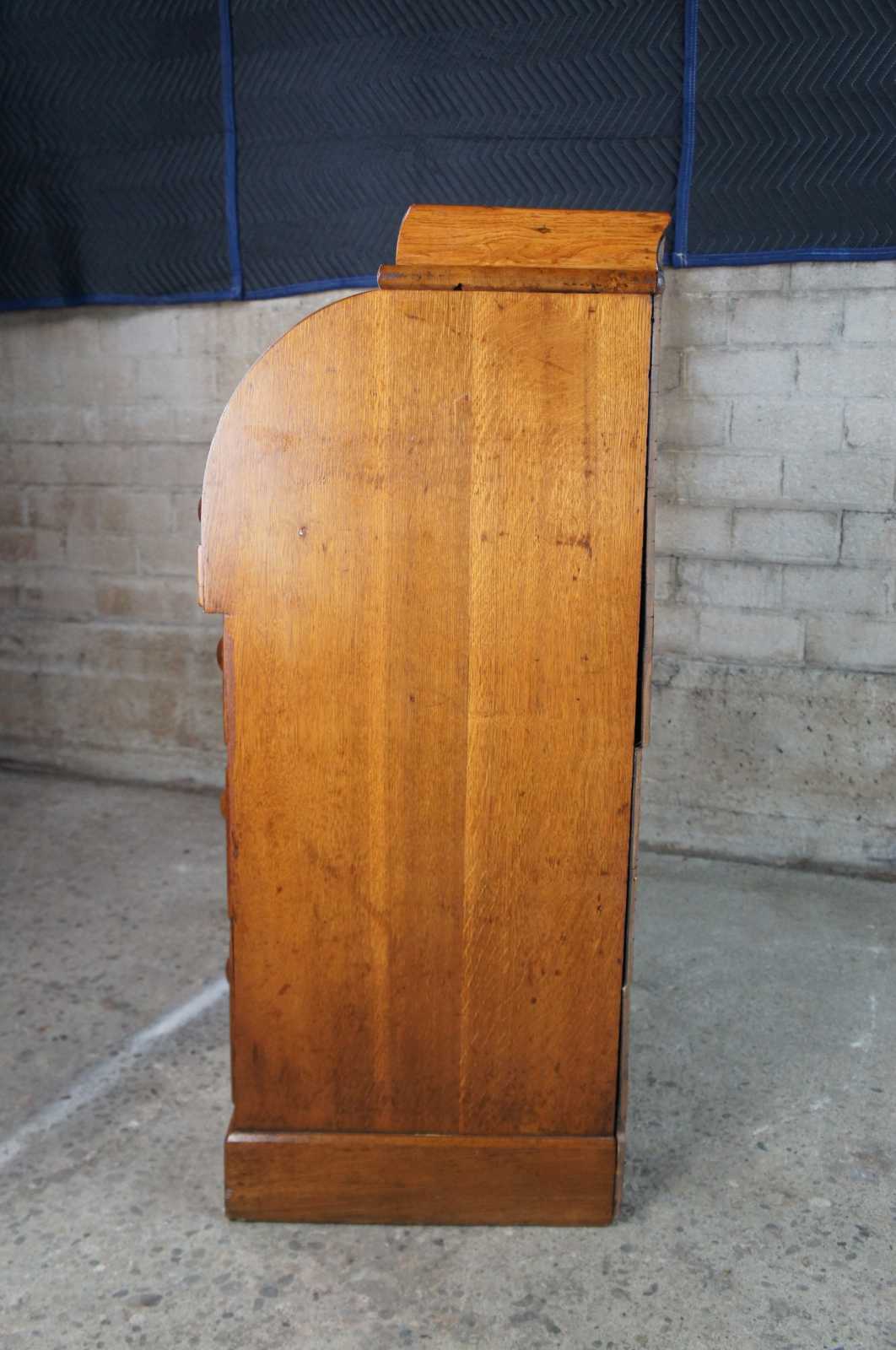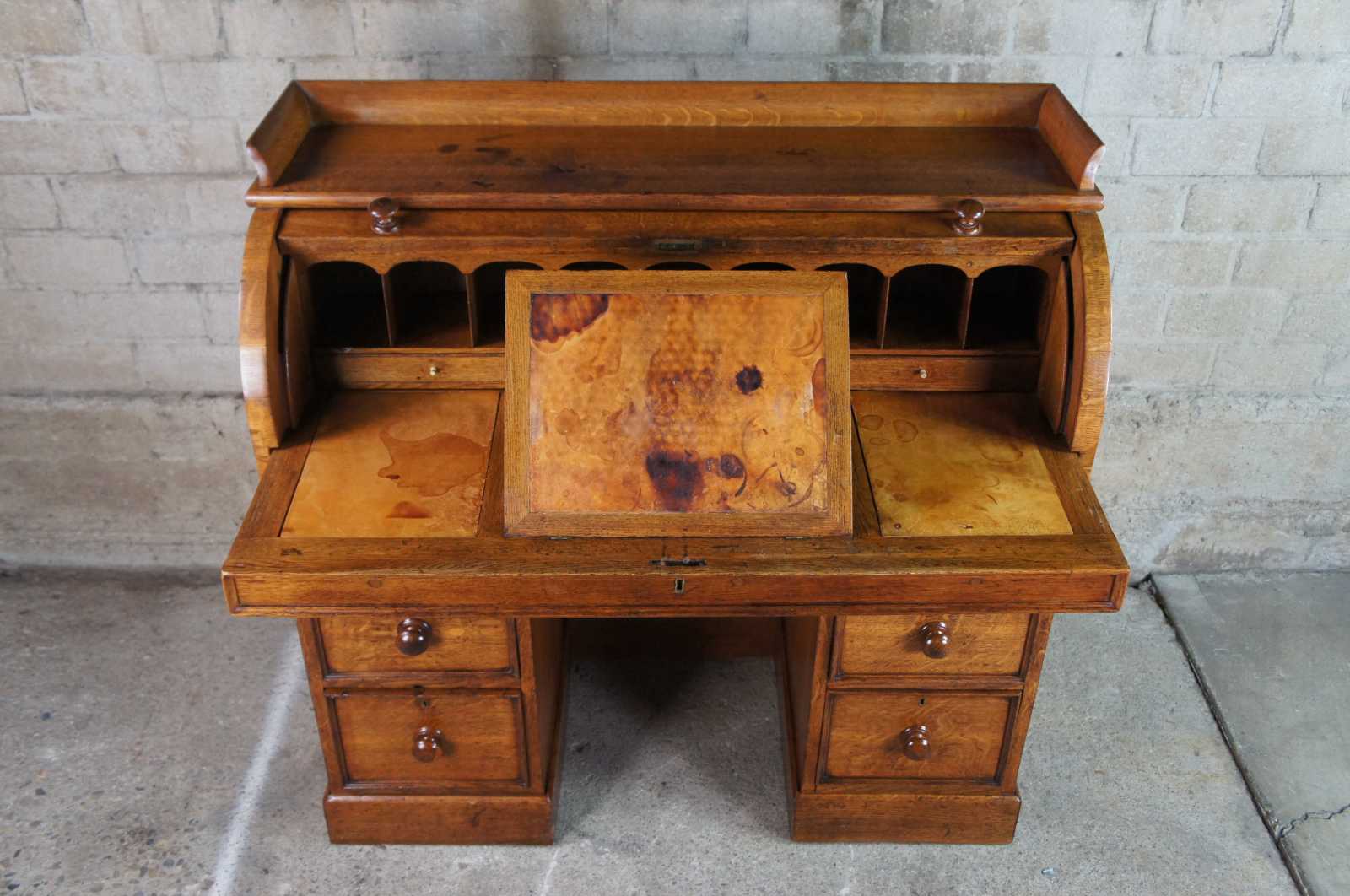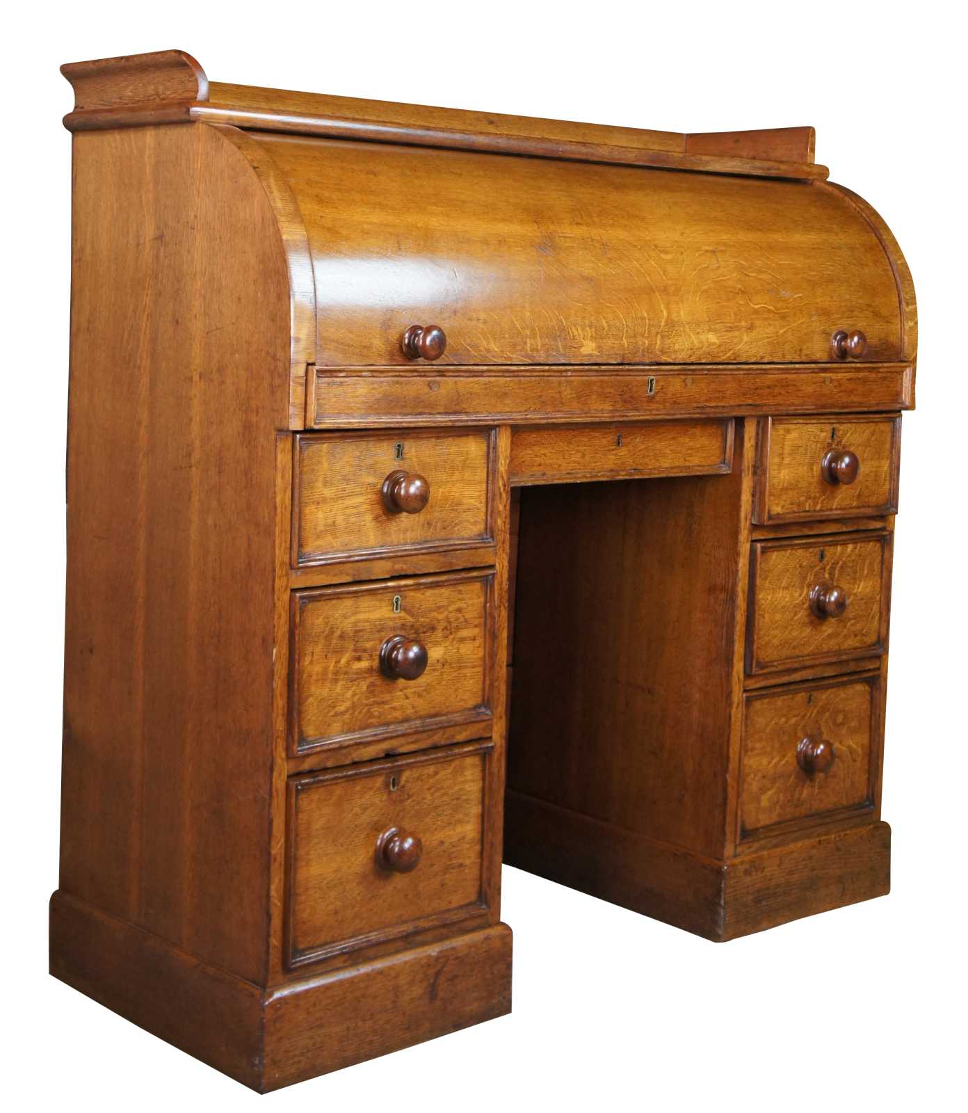 Antique 19th Century Hobbs & Co London kneehole cylider writing desk. Made of oak featuring seven drawers with roll top that opens to multiple compartments and cubbies, three more drawers, leather top slope and writing sufaces with upper gallery.