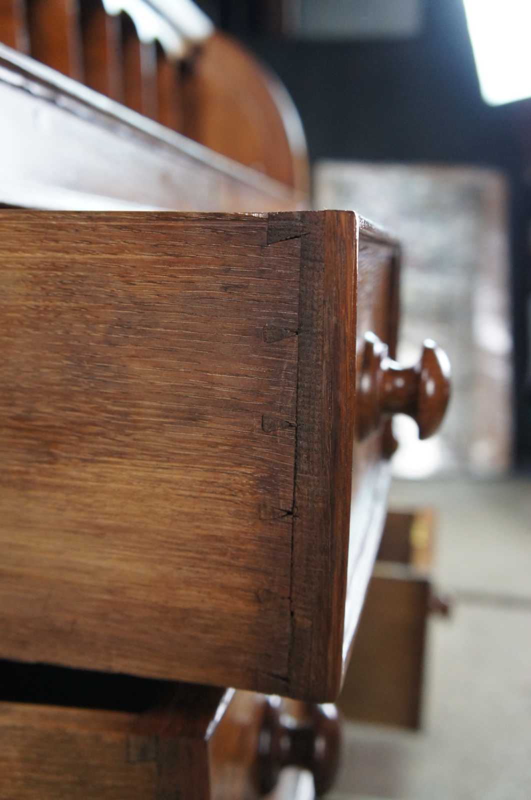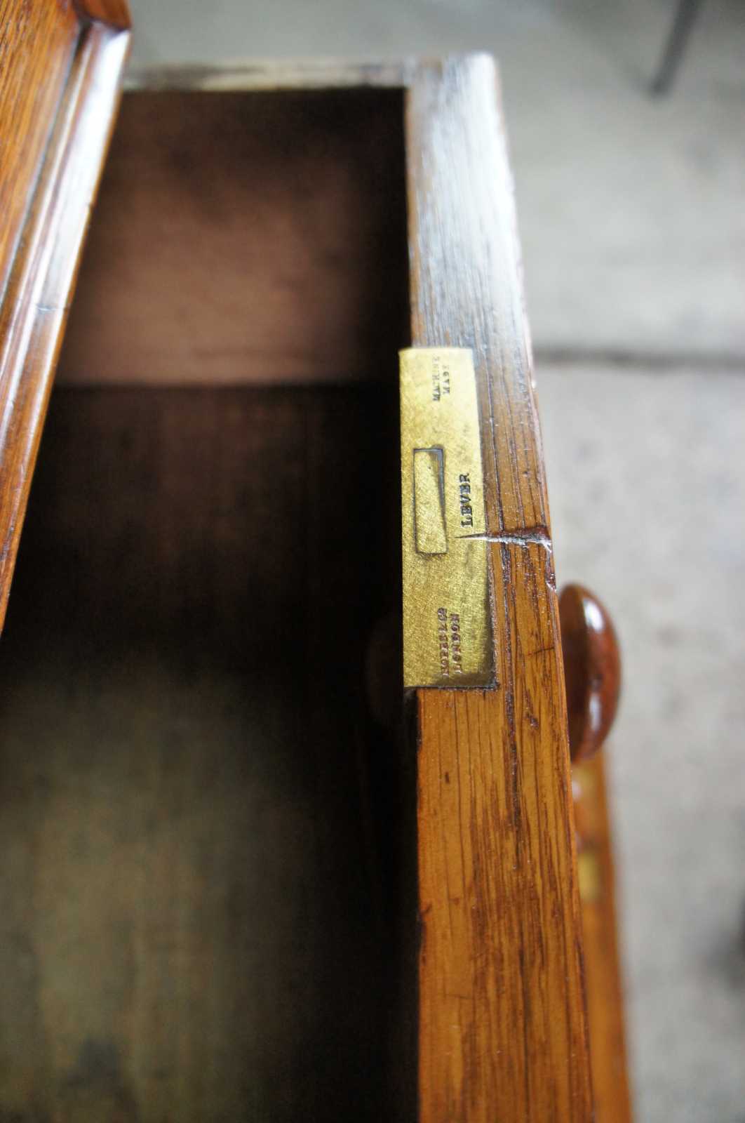 Good antique condition, wear and distressing commensurate with age and use, bowing to writing surface, staining to leather.