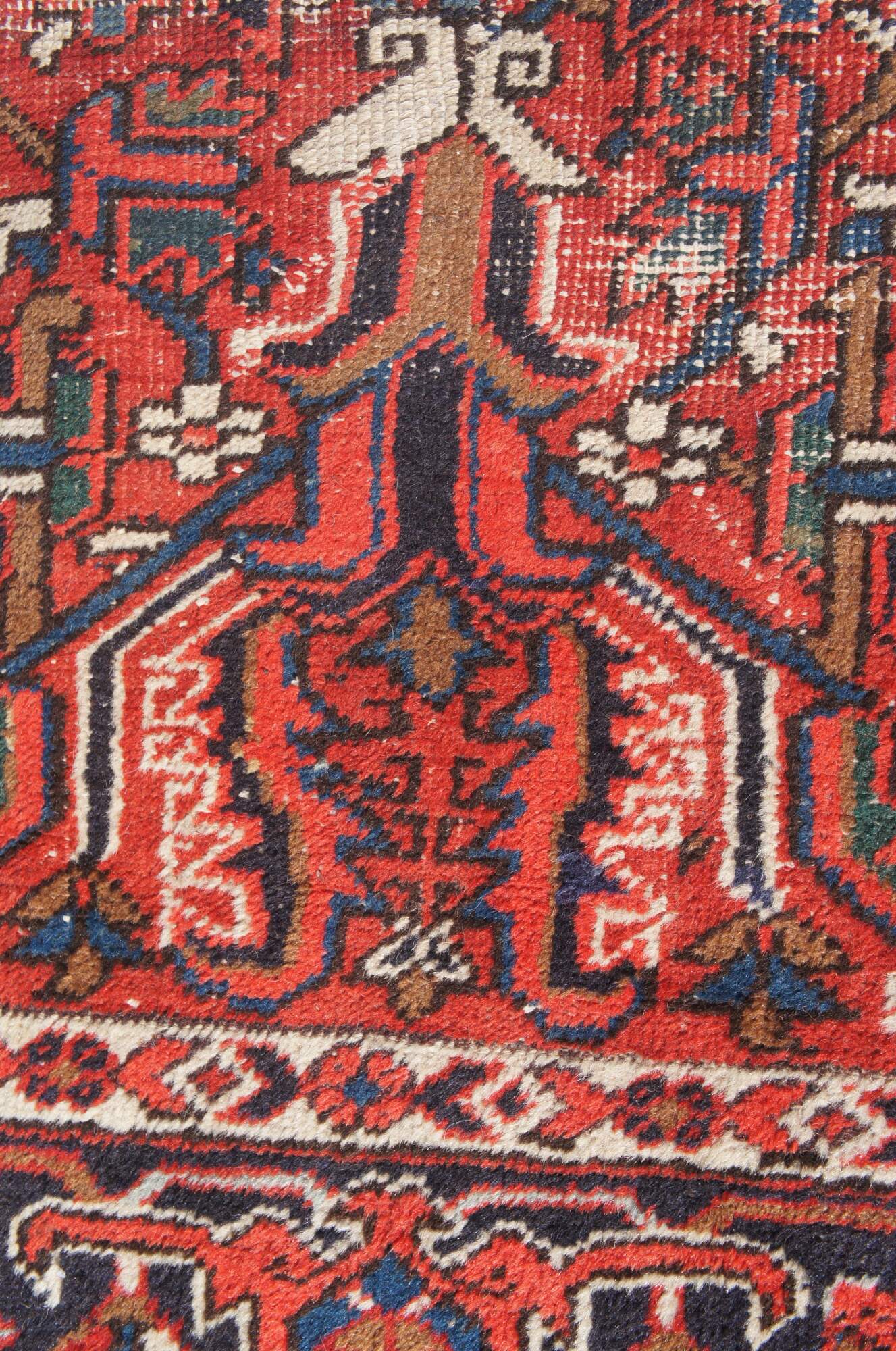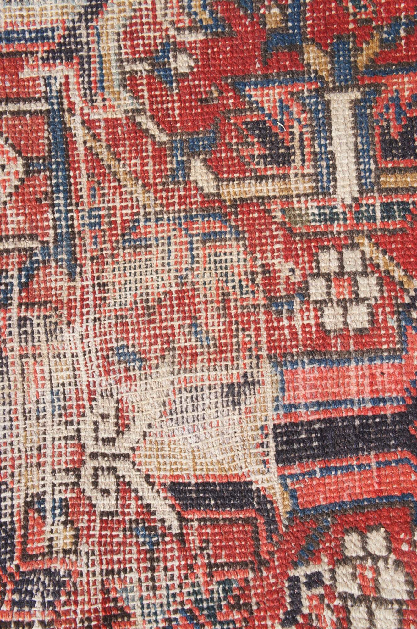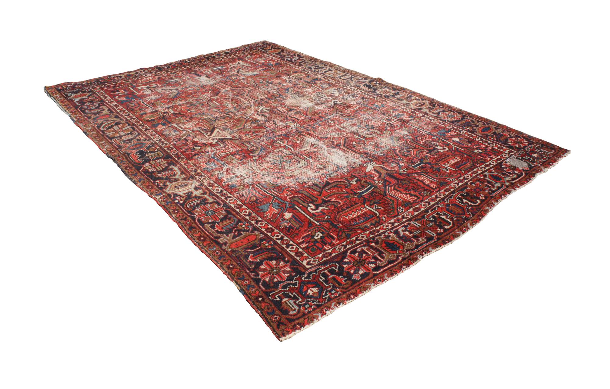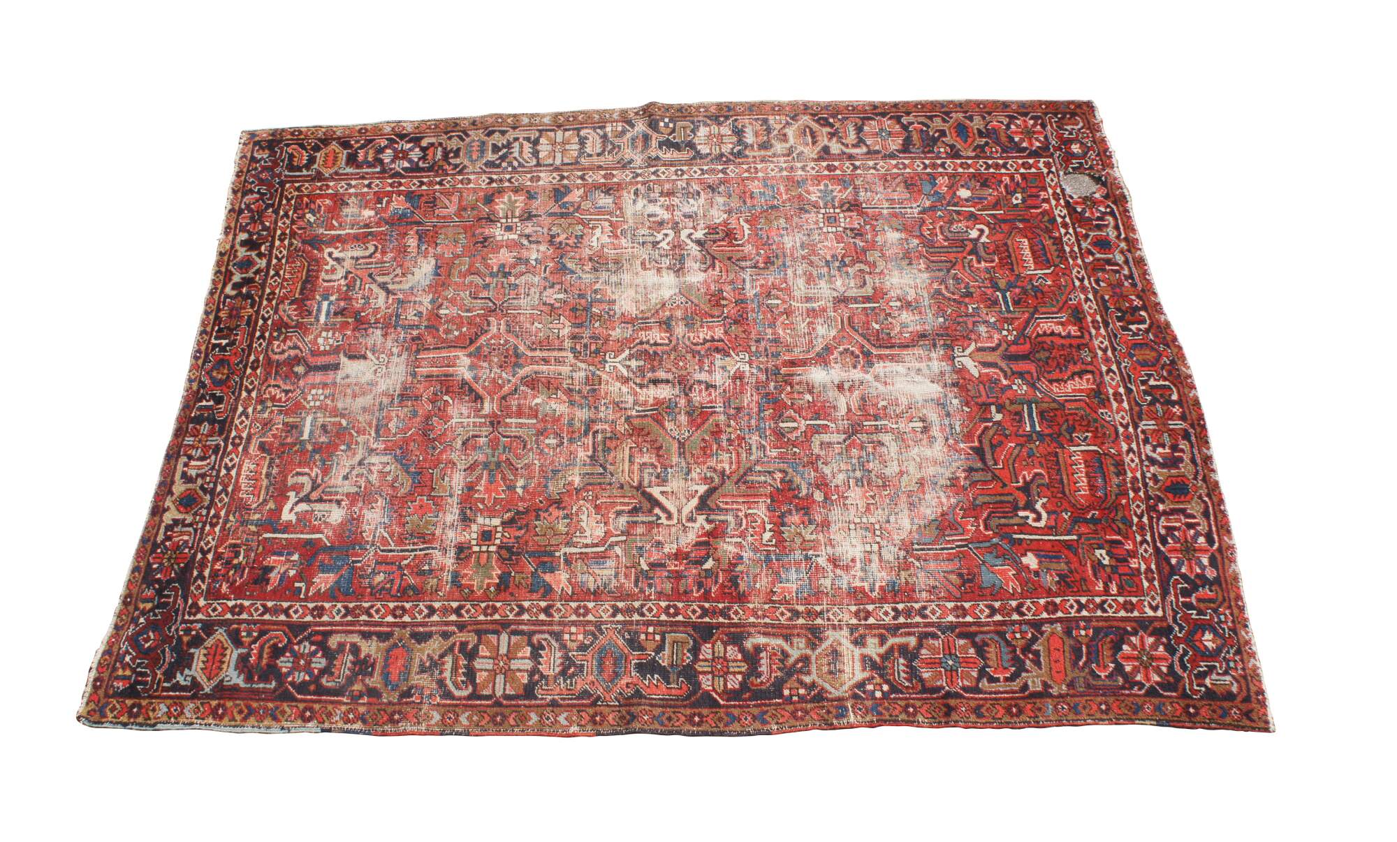Semi-Antique oriental carpet. Features traditional floral motifs in red with beige and brown accents.