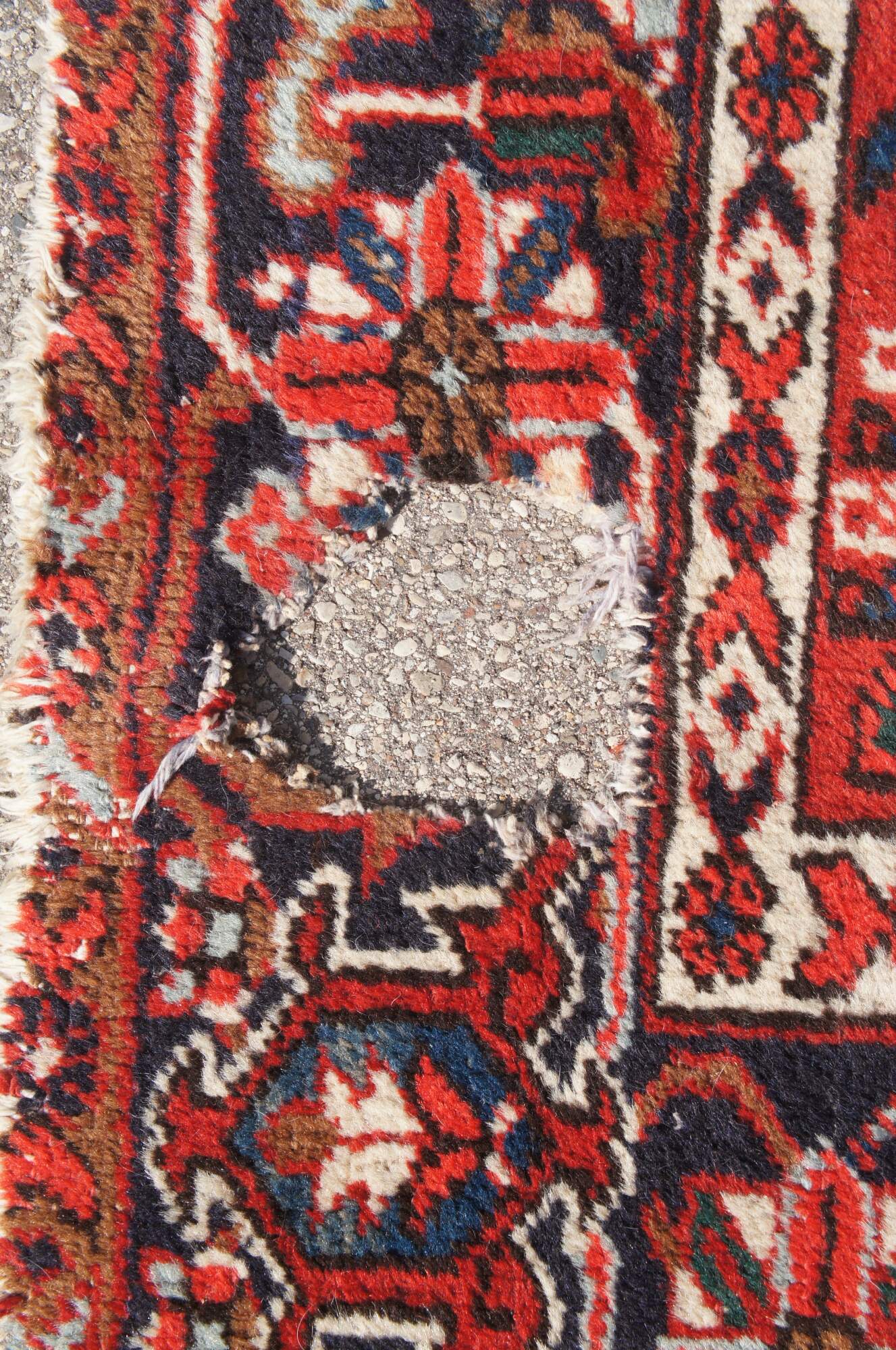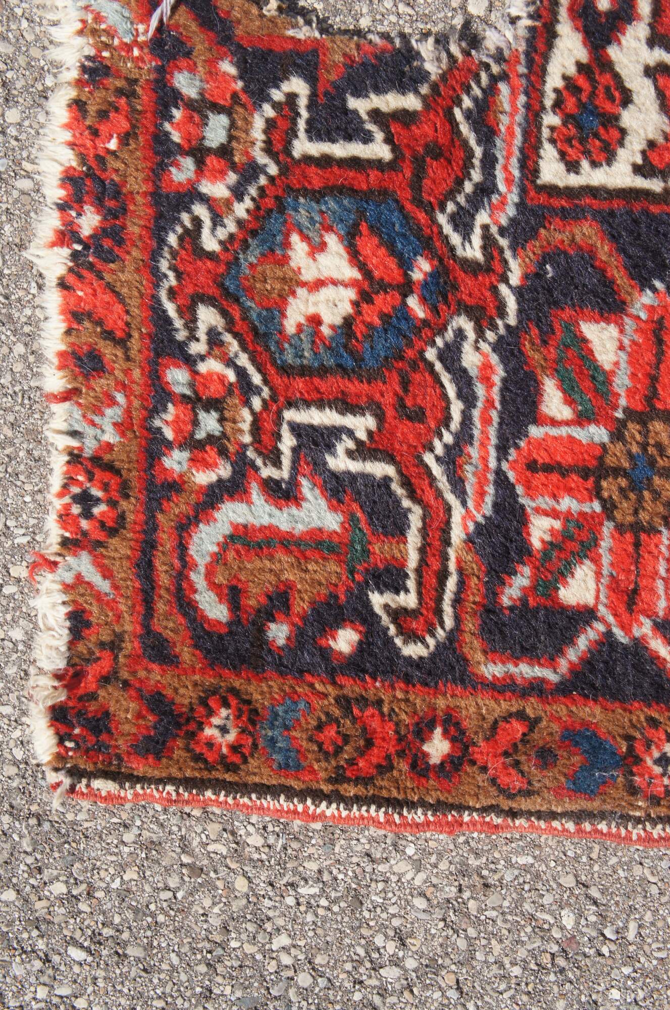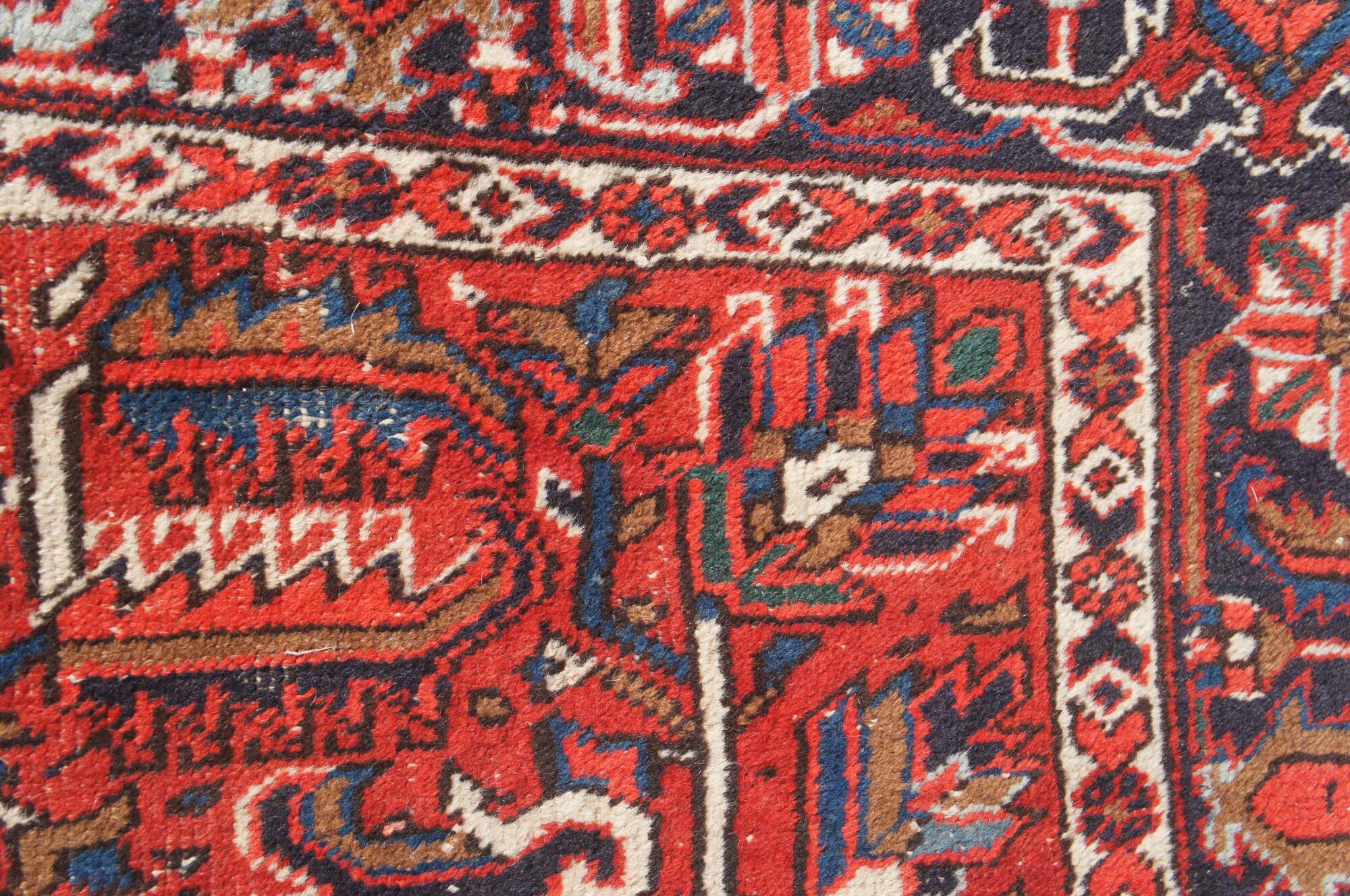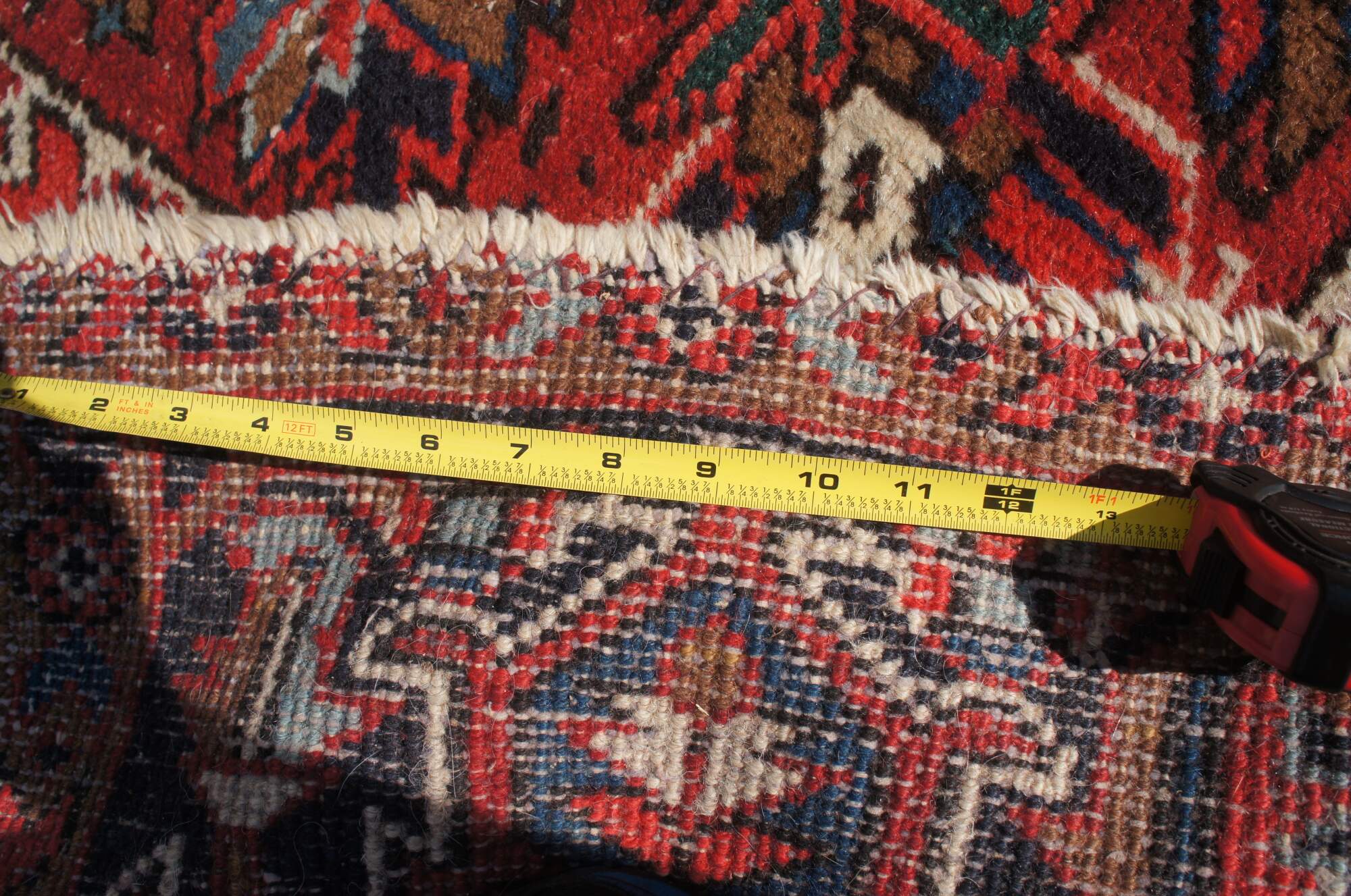 Semi-Antique oriental carpet. Features traditional floral motifs in red with beige and brown accents.