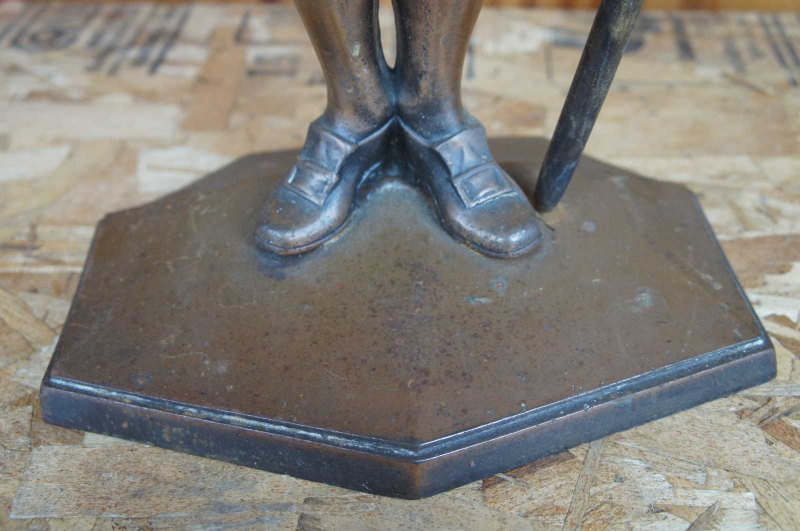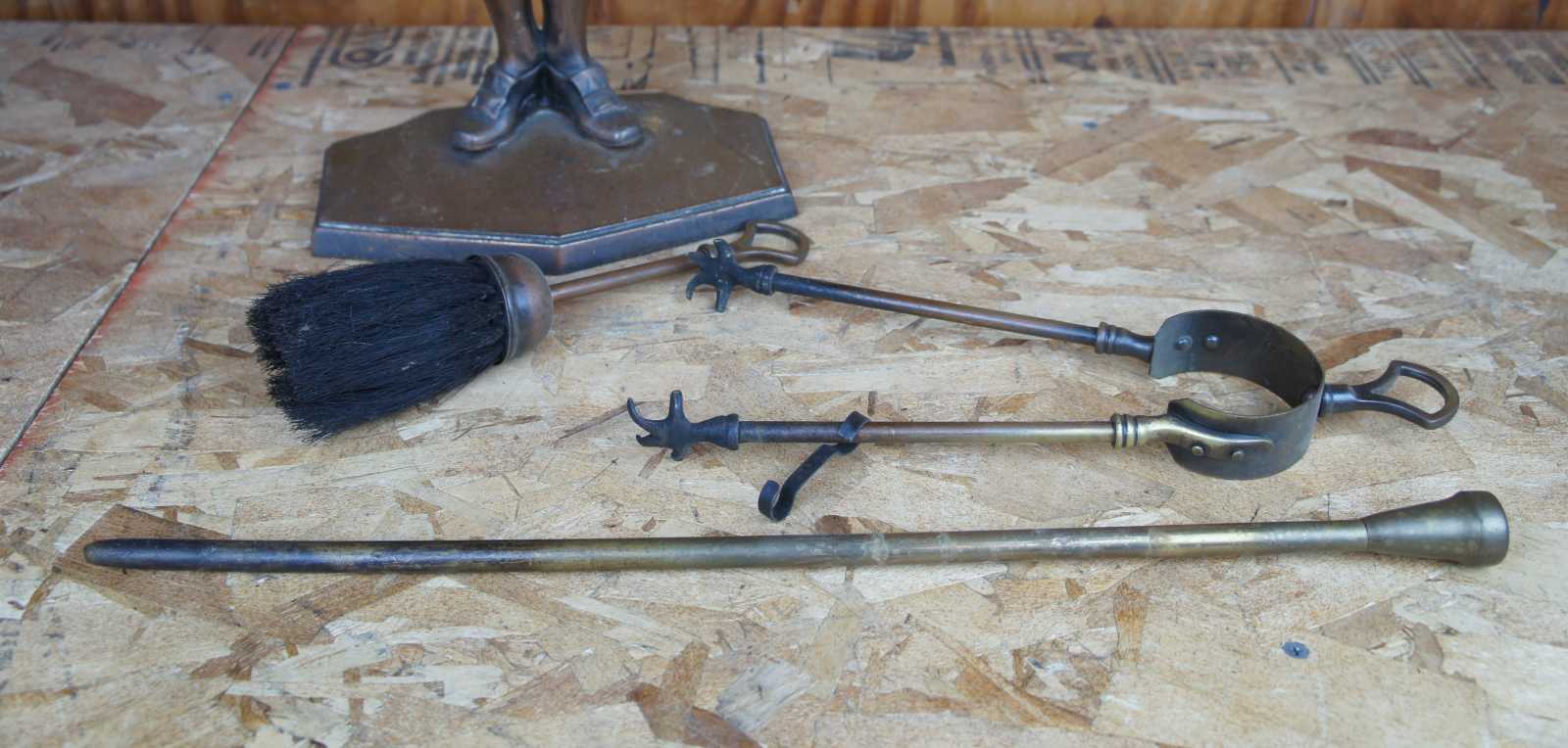 Vintage cast iron hearthware fire tool set featuring a colonial / Renaissance dressed man. Poker, tongs, brush and stand.