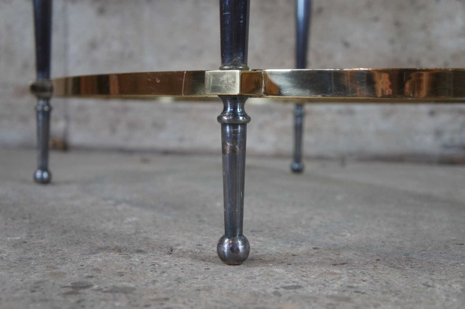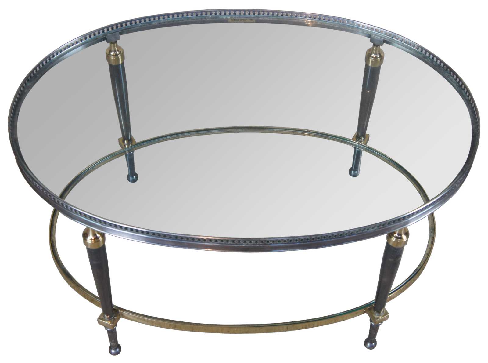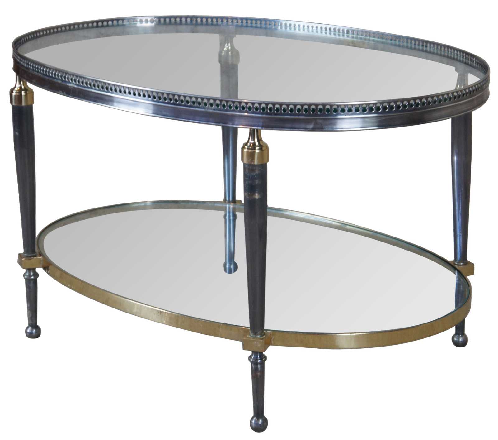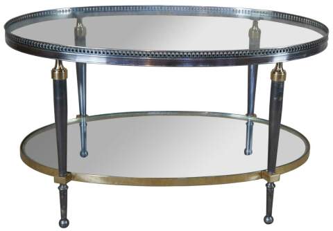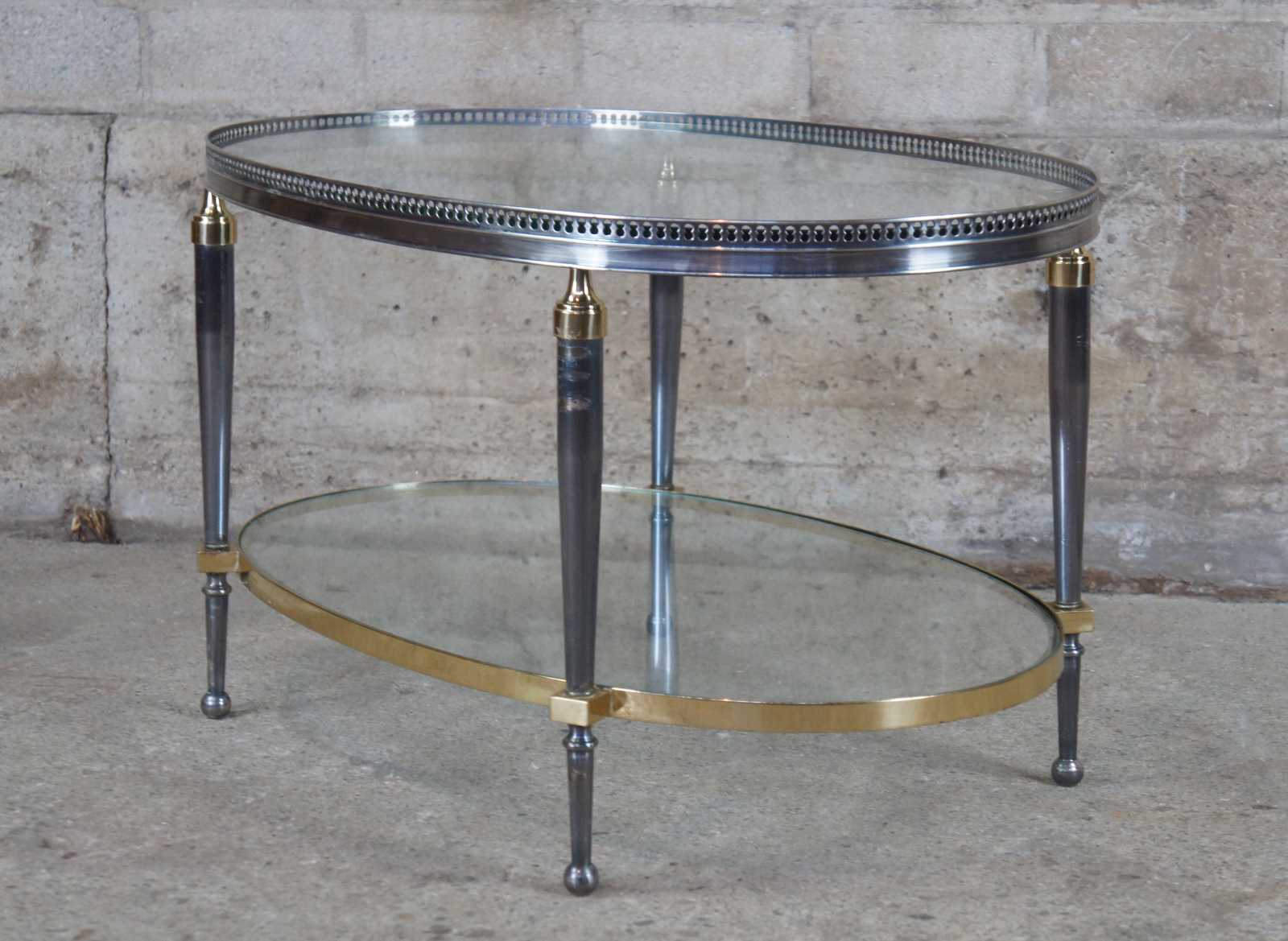 Late 20th Century oval form coffee table by Trouvailles Inc of Watertown, Ma. Made from steel and brass with glass inserts. Features a pierced gallery and tapered legs leading to ball feet.