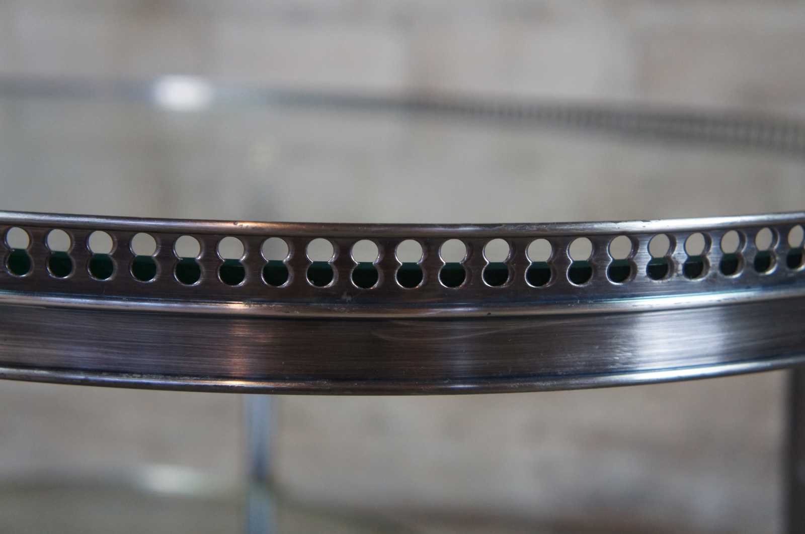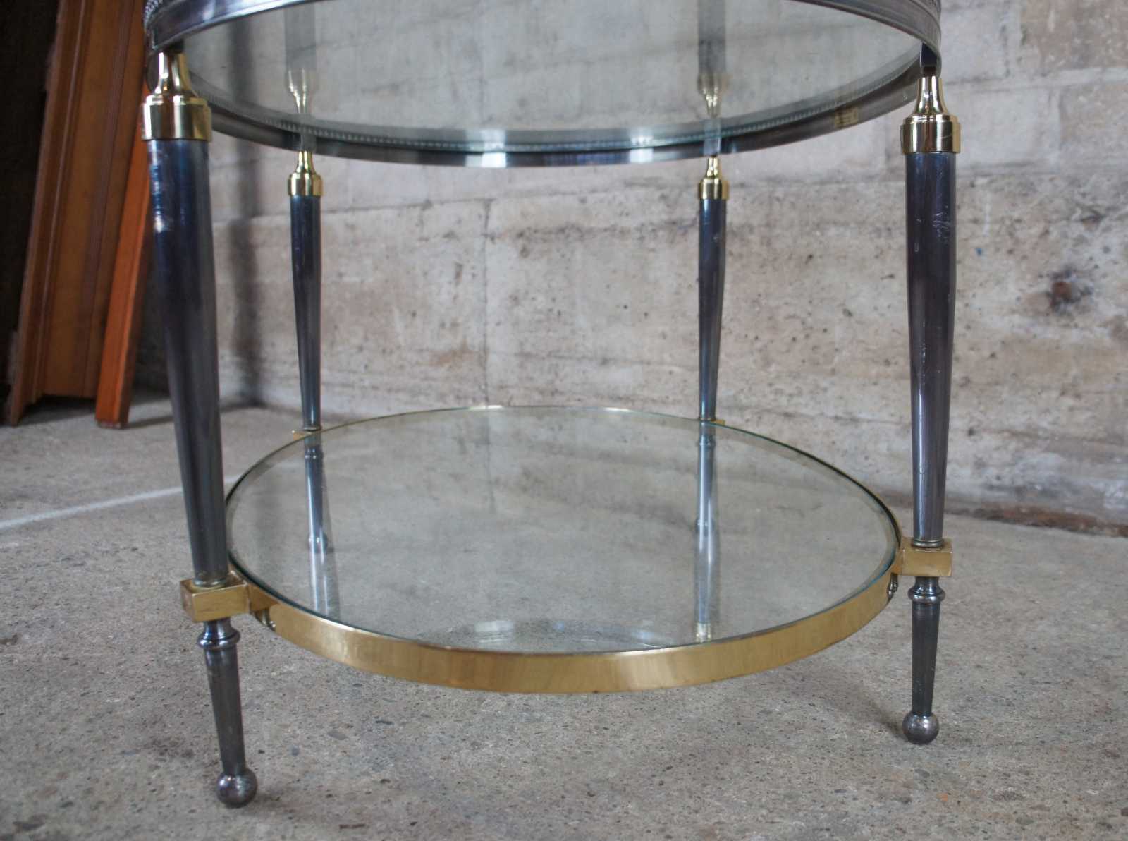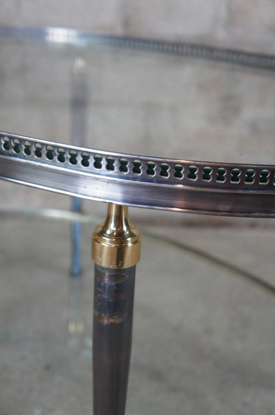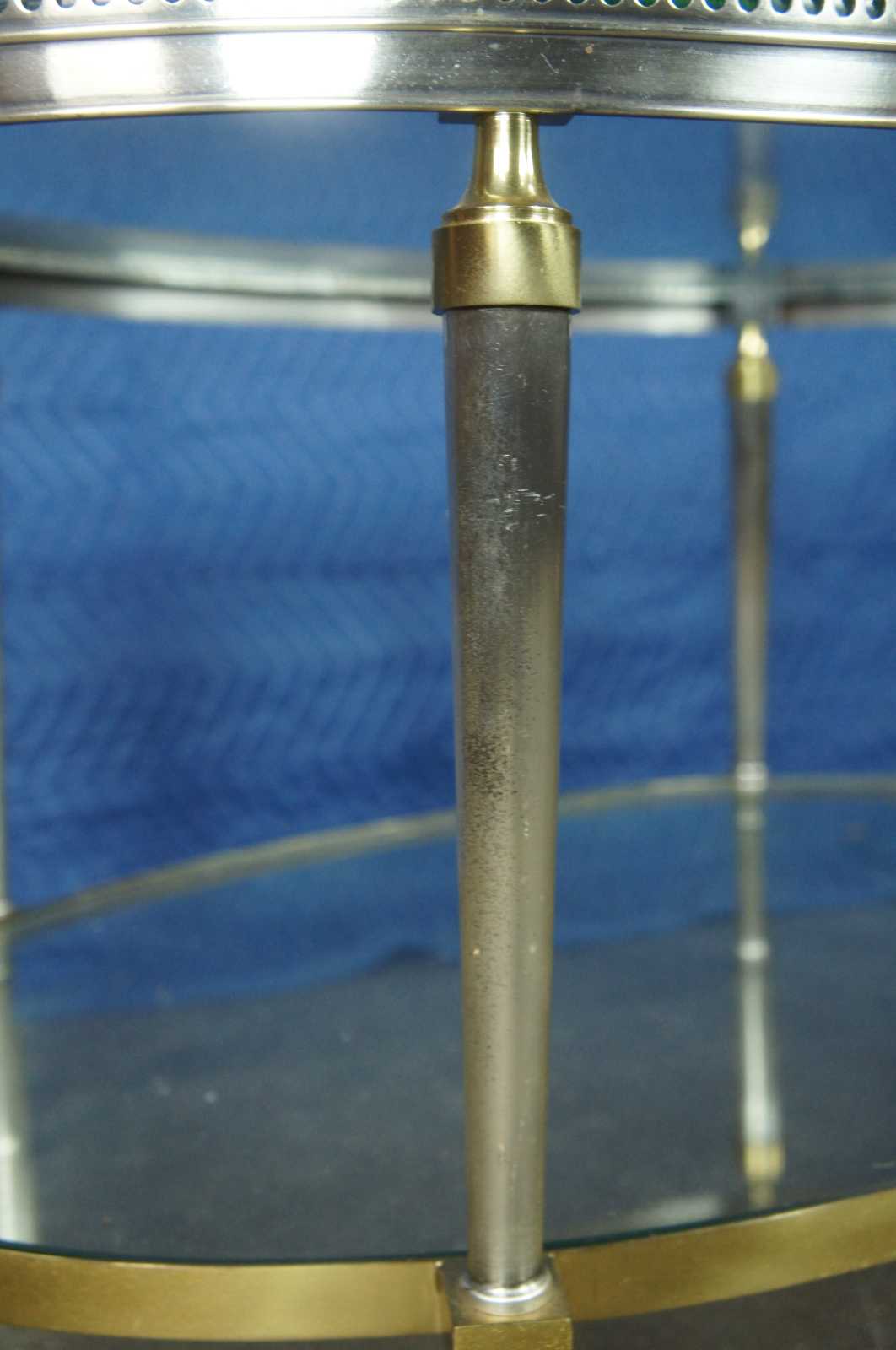 Late 20th Century oval form coffee table by Trouvailles Inc of Watertown, Ma. Made from steel and brass with glass inserts. Features a pierced gallery and tapered legs leading to ball feet.