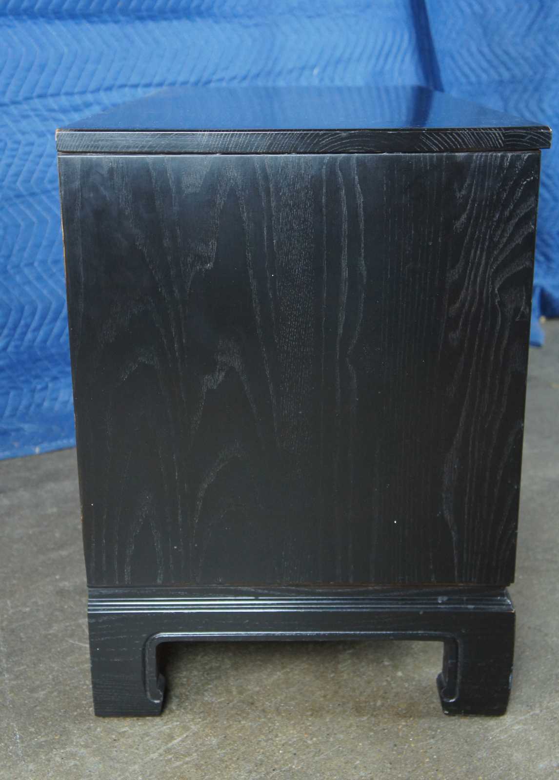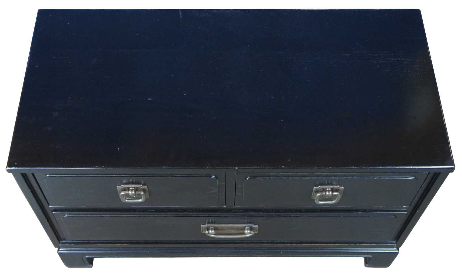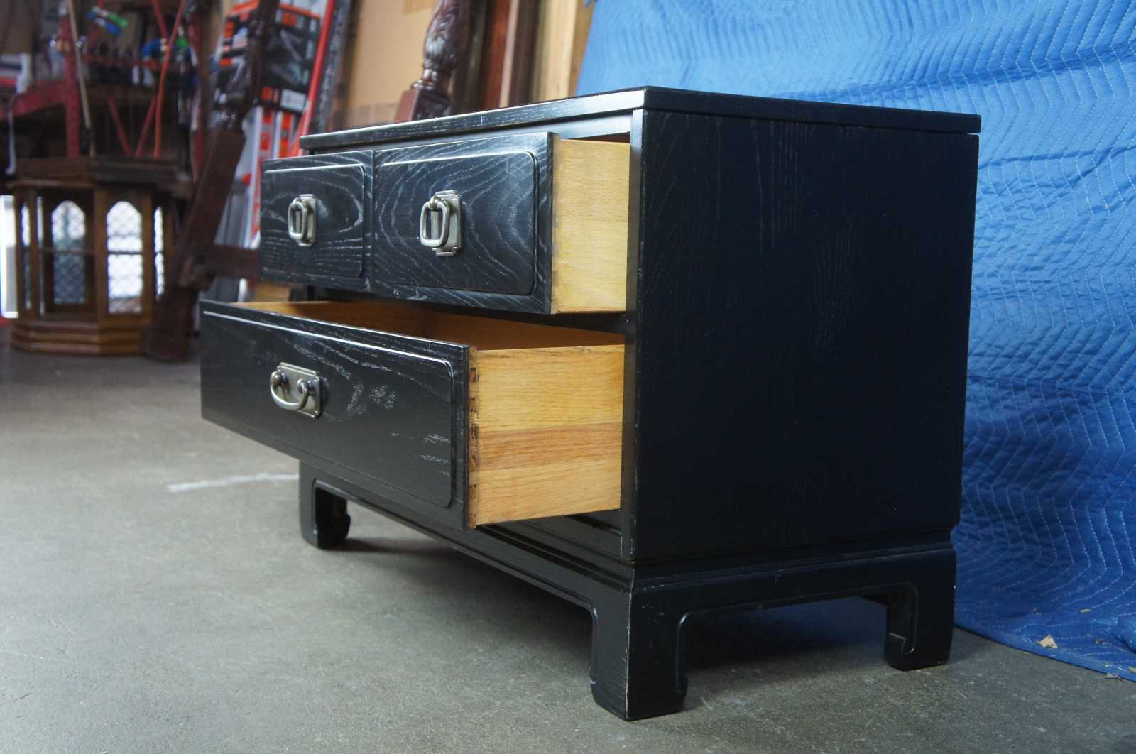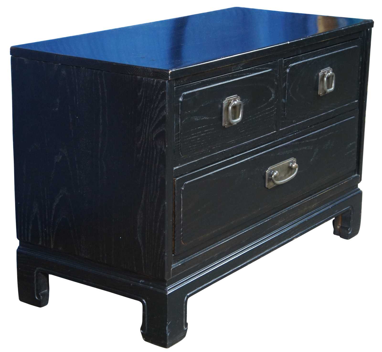 Vintage Davis Cabinet Company low chest of drawers / dresser / nightstand / TV console. Made of ebonized cerused oak featuring rectangular form with asian styling and three drawers with brass hardware.