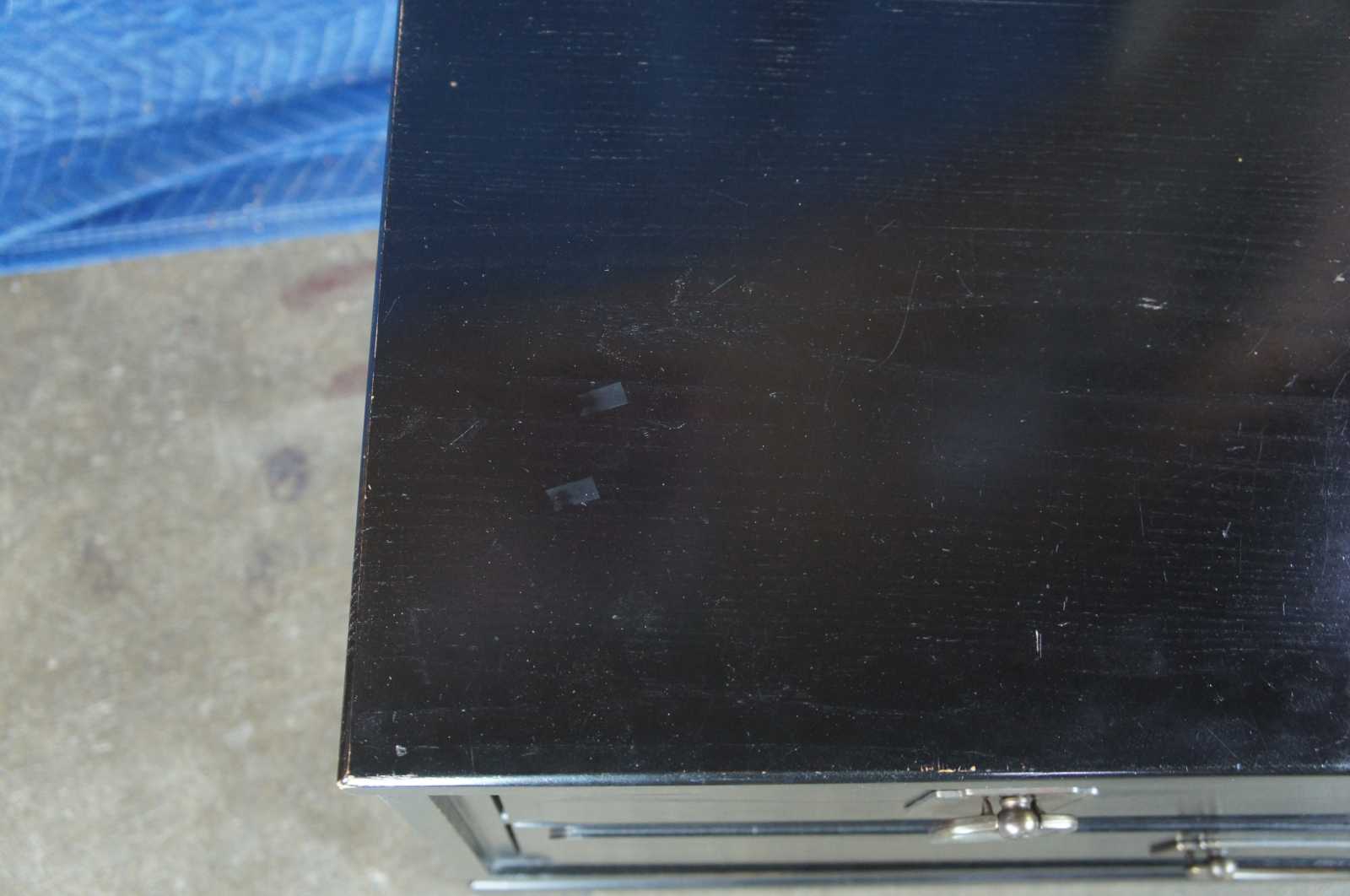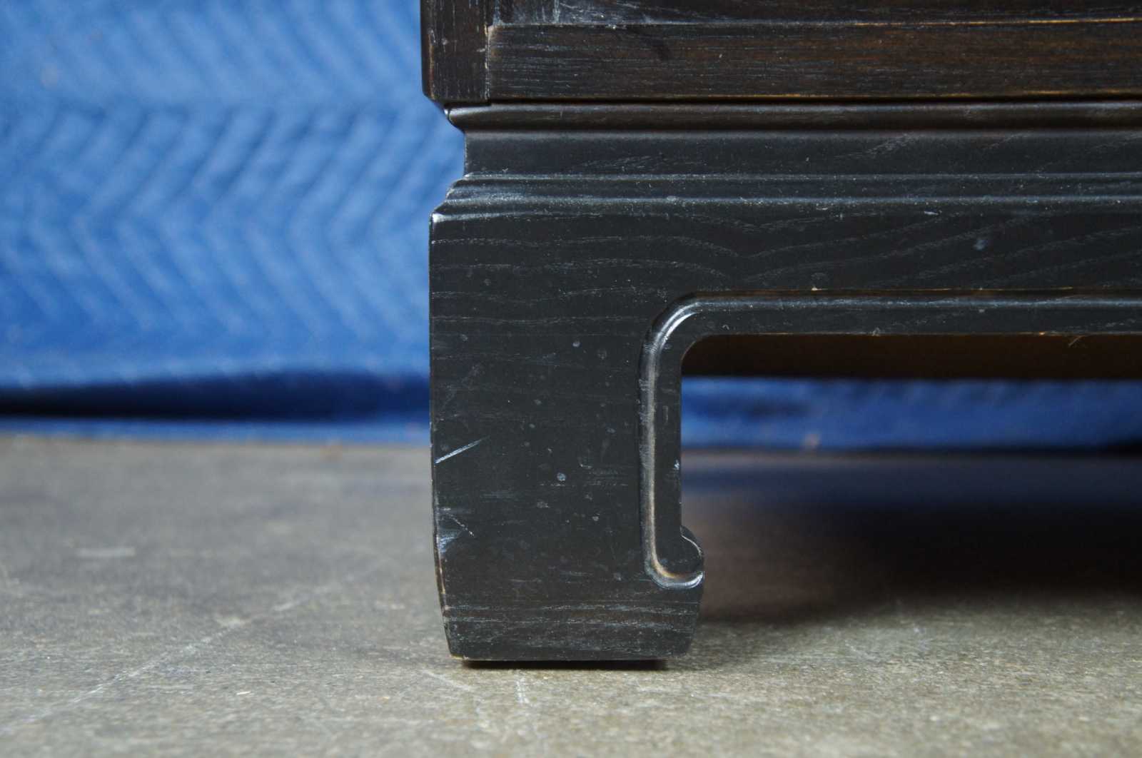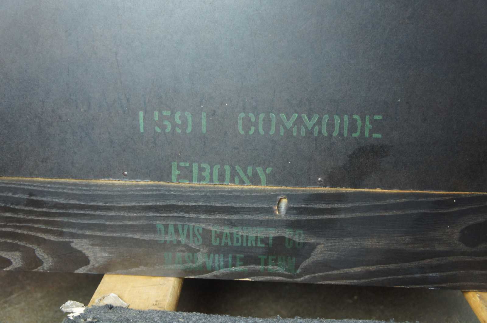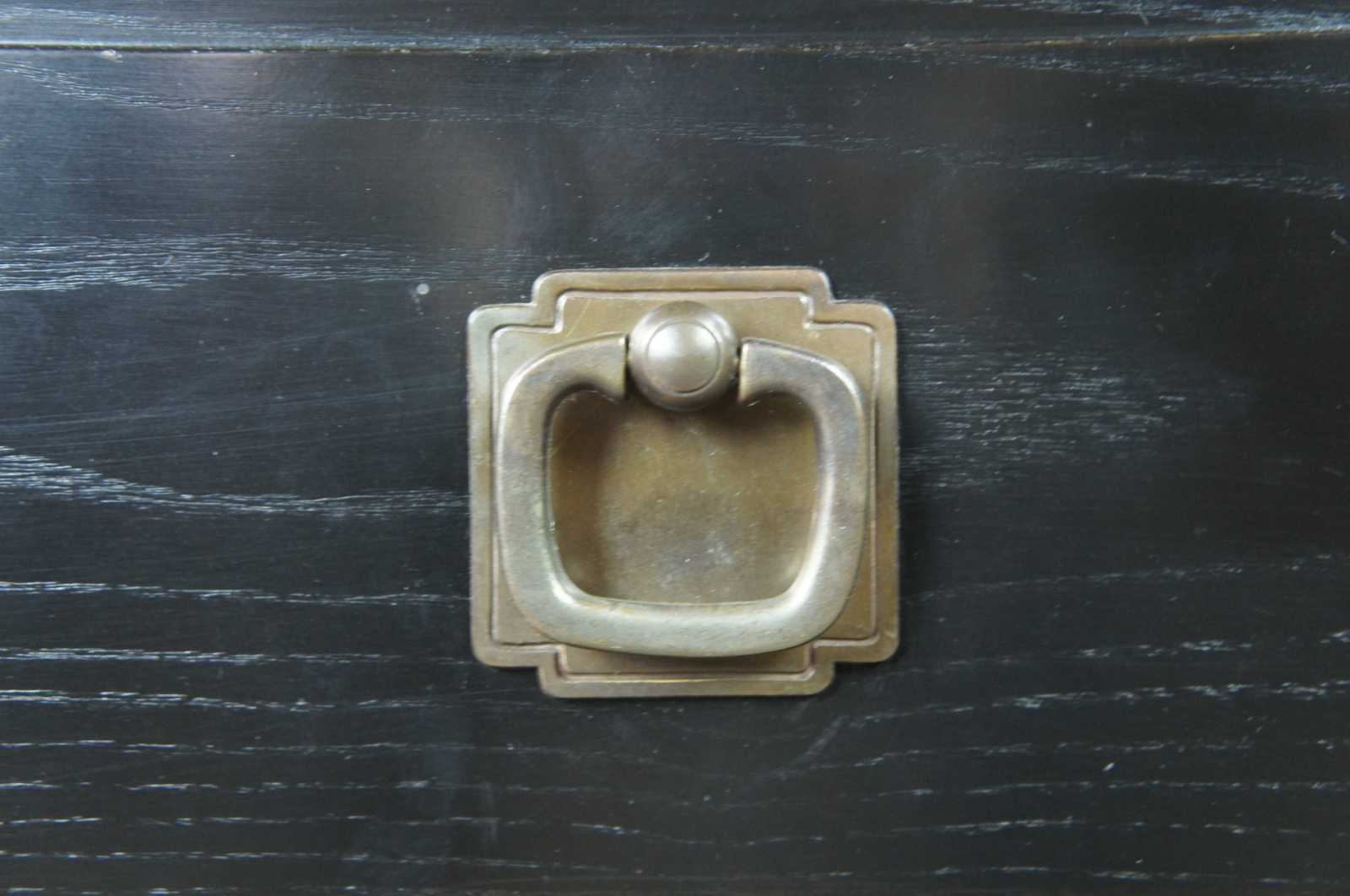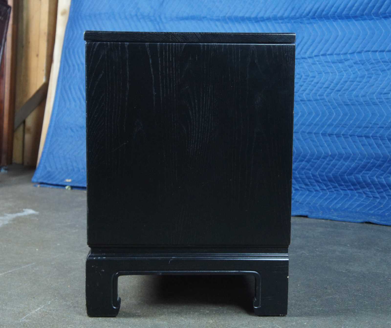 Vintage Davis Cabinet Company low chest of drawers / dresser / nightstand / TV console. Made of ebonized cerused oak featuring rectangular form with asian styling and three drawers with brass hardware.