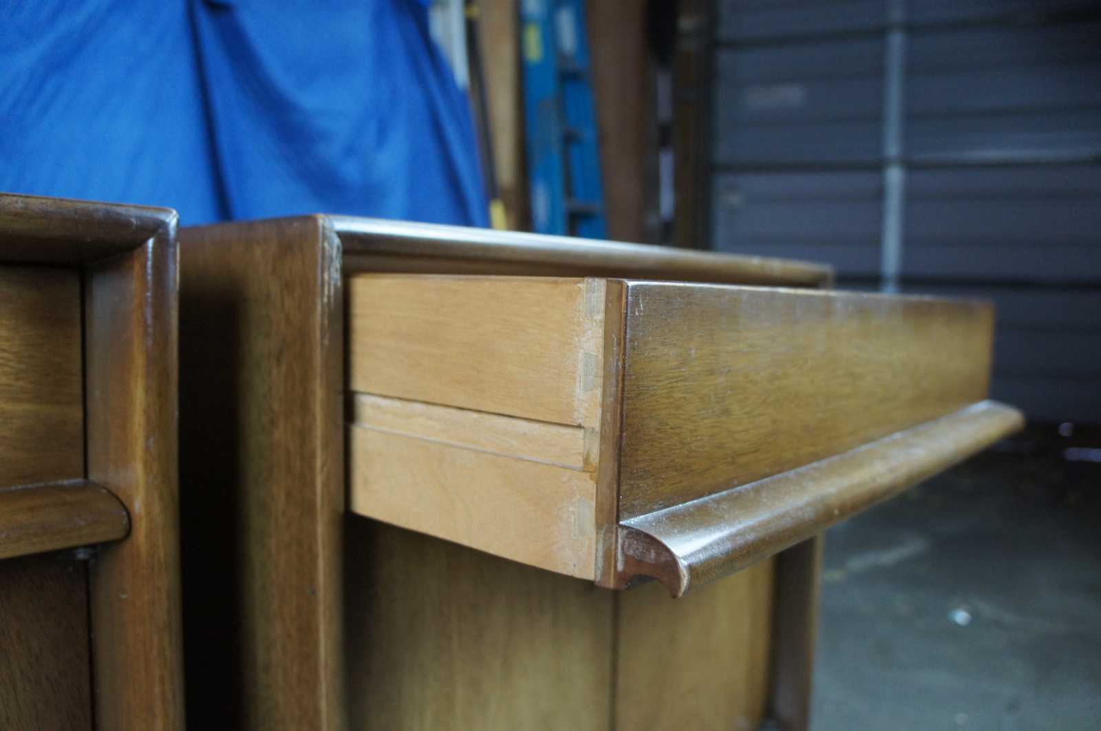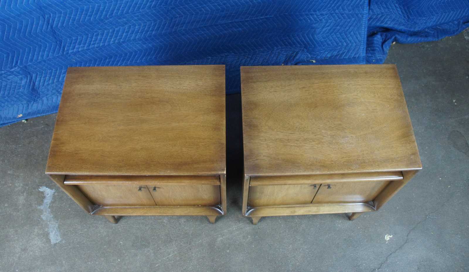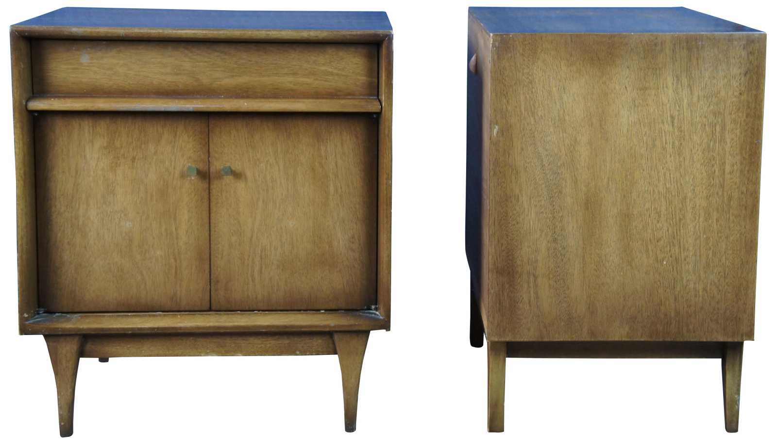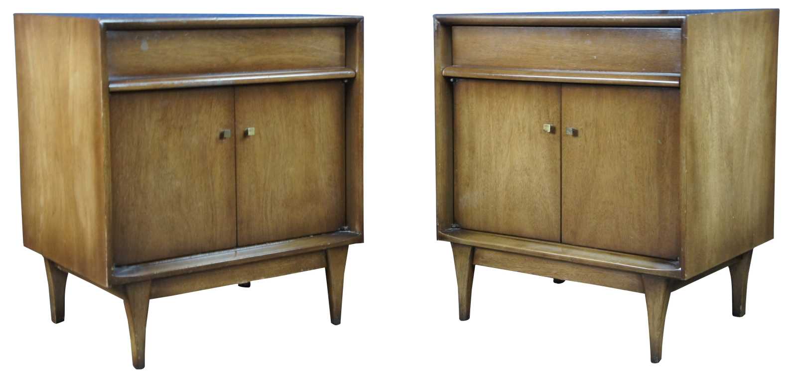 Two mid century modern side table nightstands. Made of walnut featuring cube form with one drawer and cabinet over tapered legs.