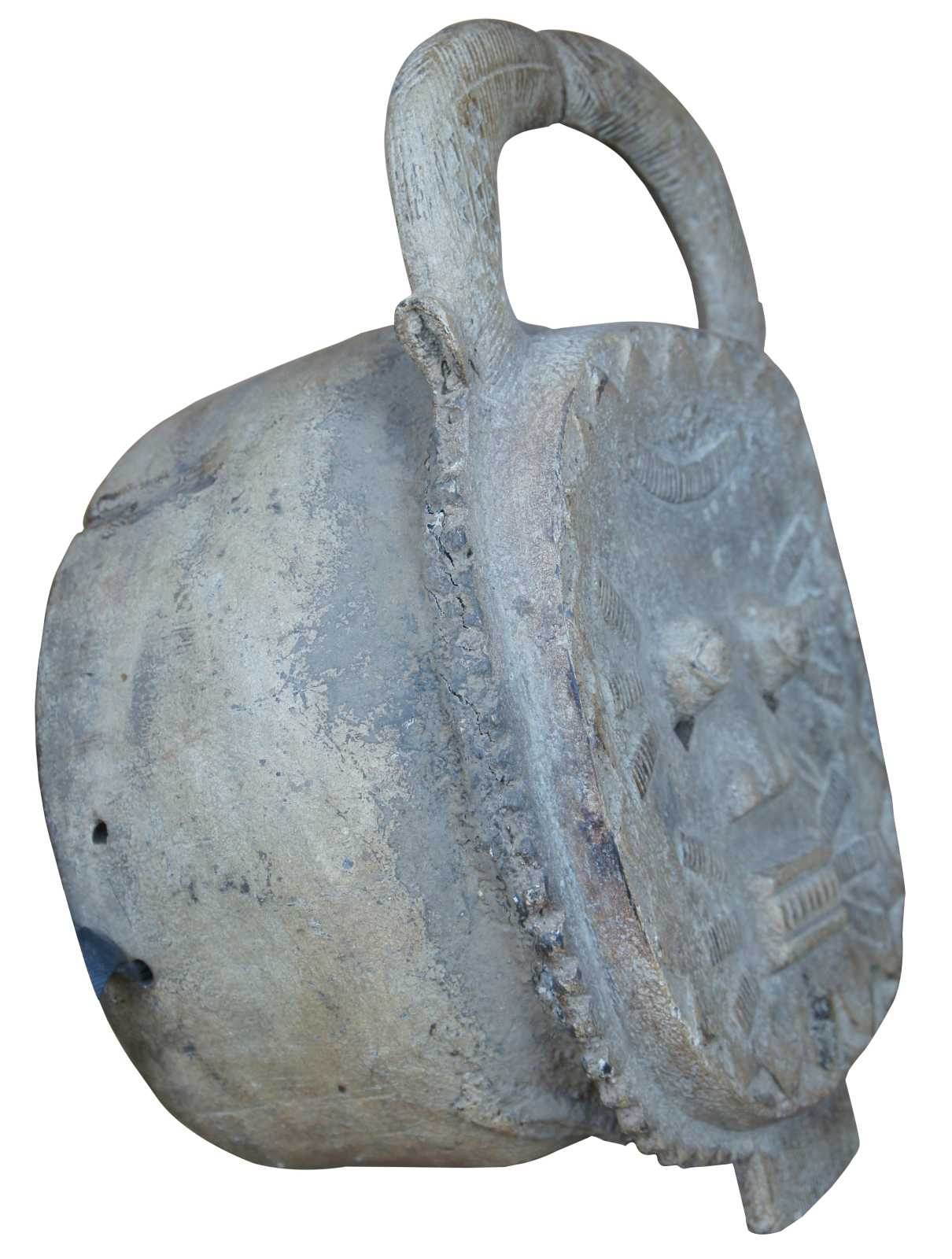 Rare antique museum quality Baule Kple Kple mask featuring an abstract circular face with animal horns. It is said that the face represents the sun and the horns represent power and strength of the buffalo. This mask was worn by junior males during religious tribal events.