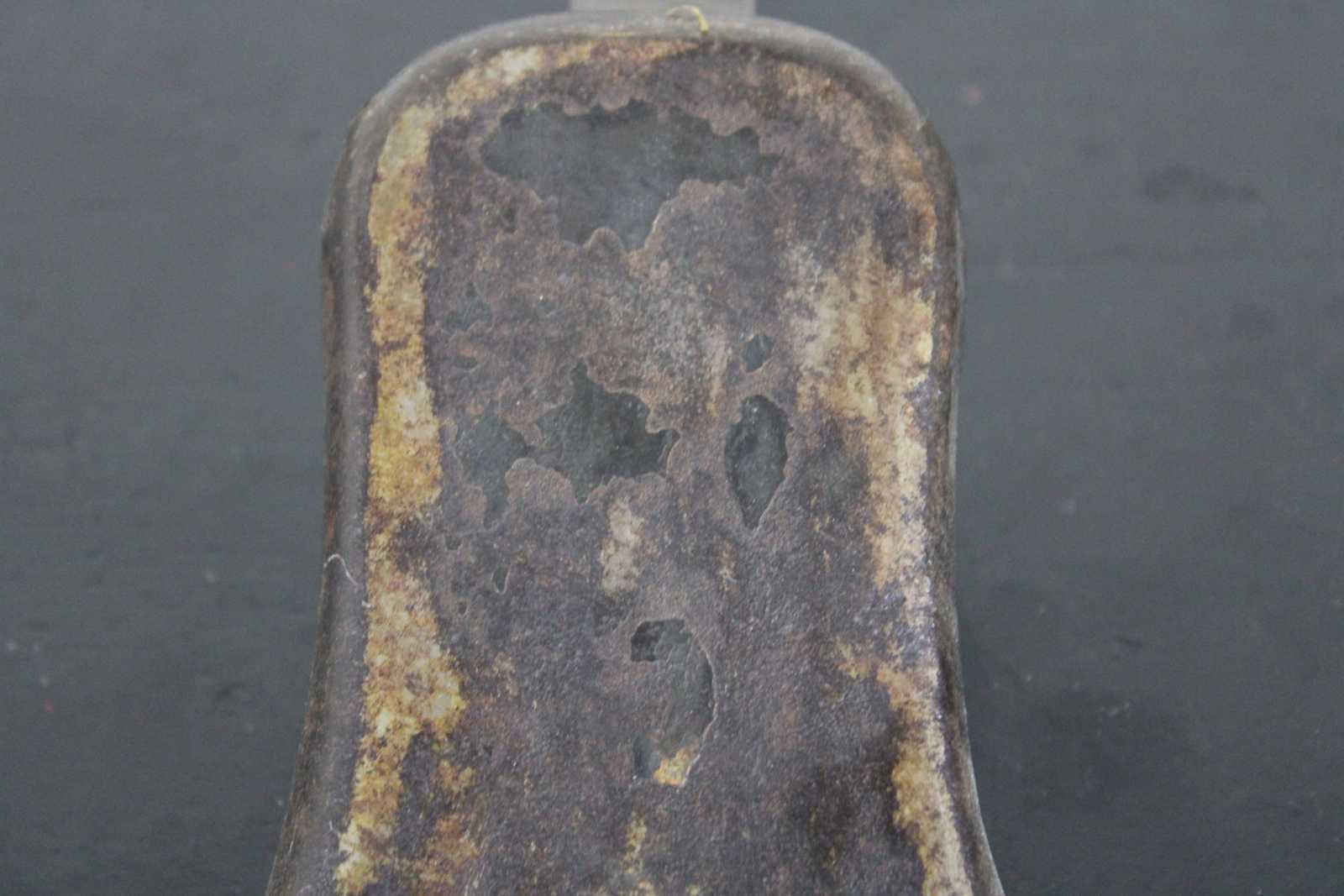 Antique primitive Early American / colonial style forged iron farmhouse fireplace tools featuring a flared shovel and six prong fork.