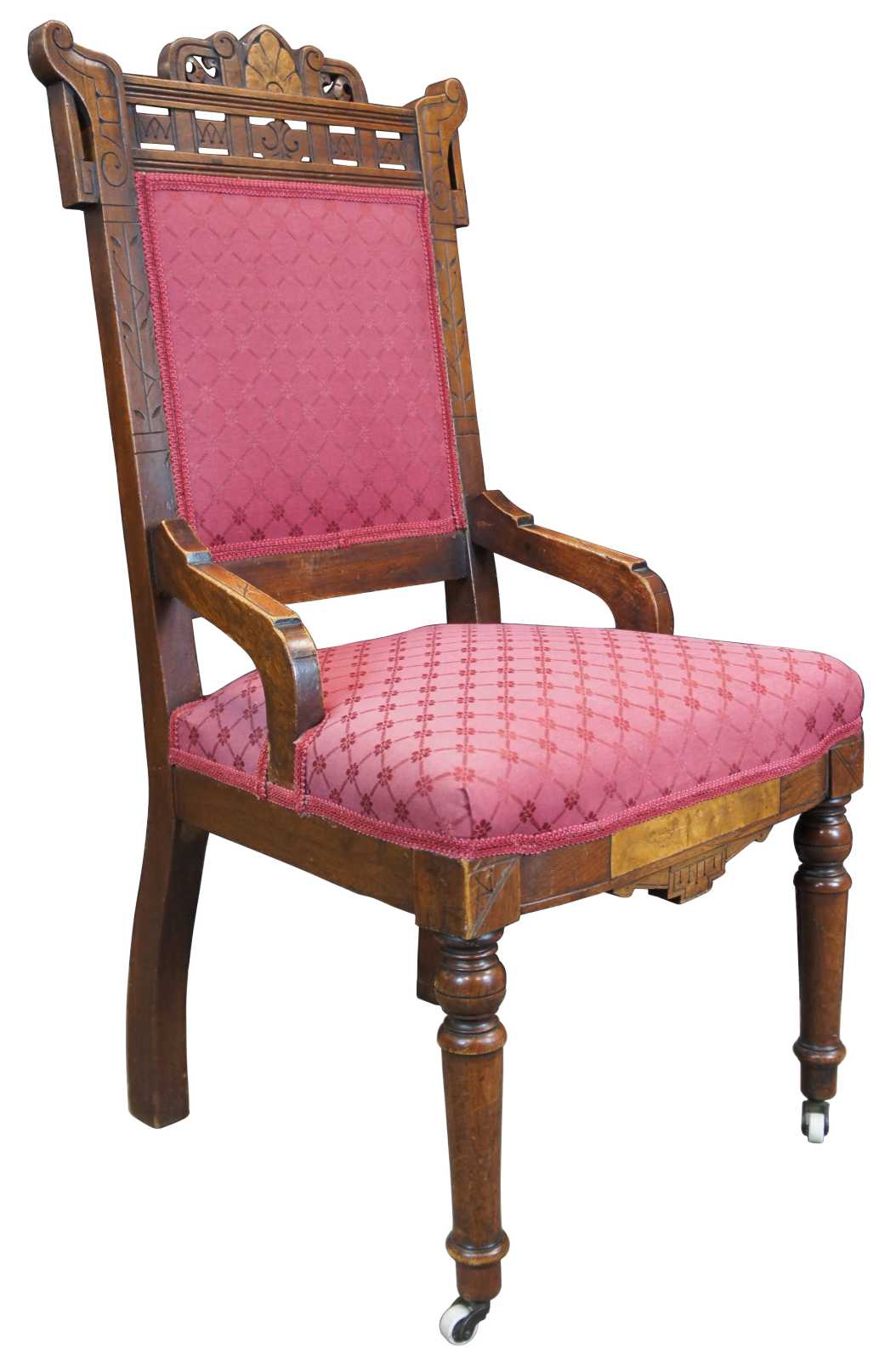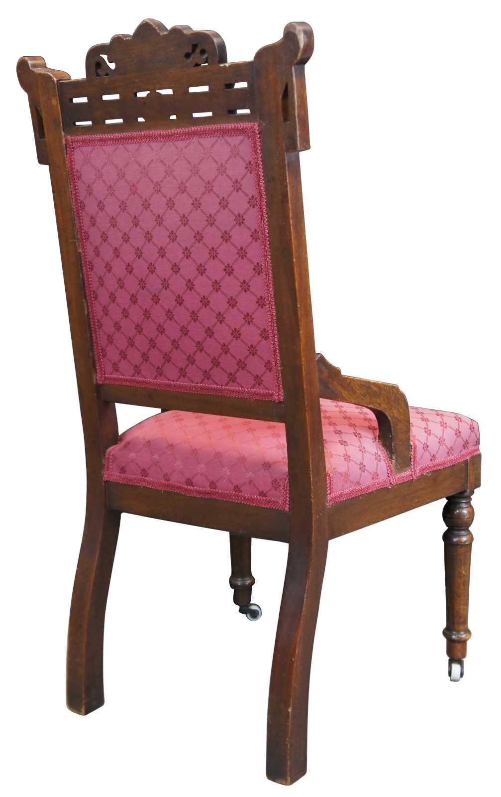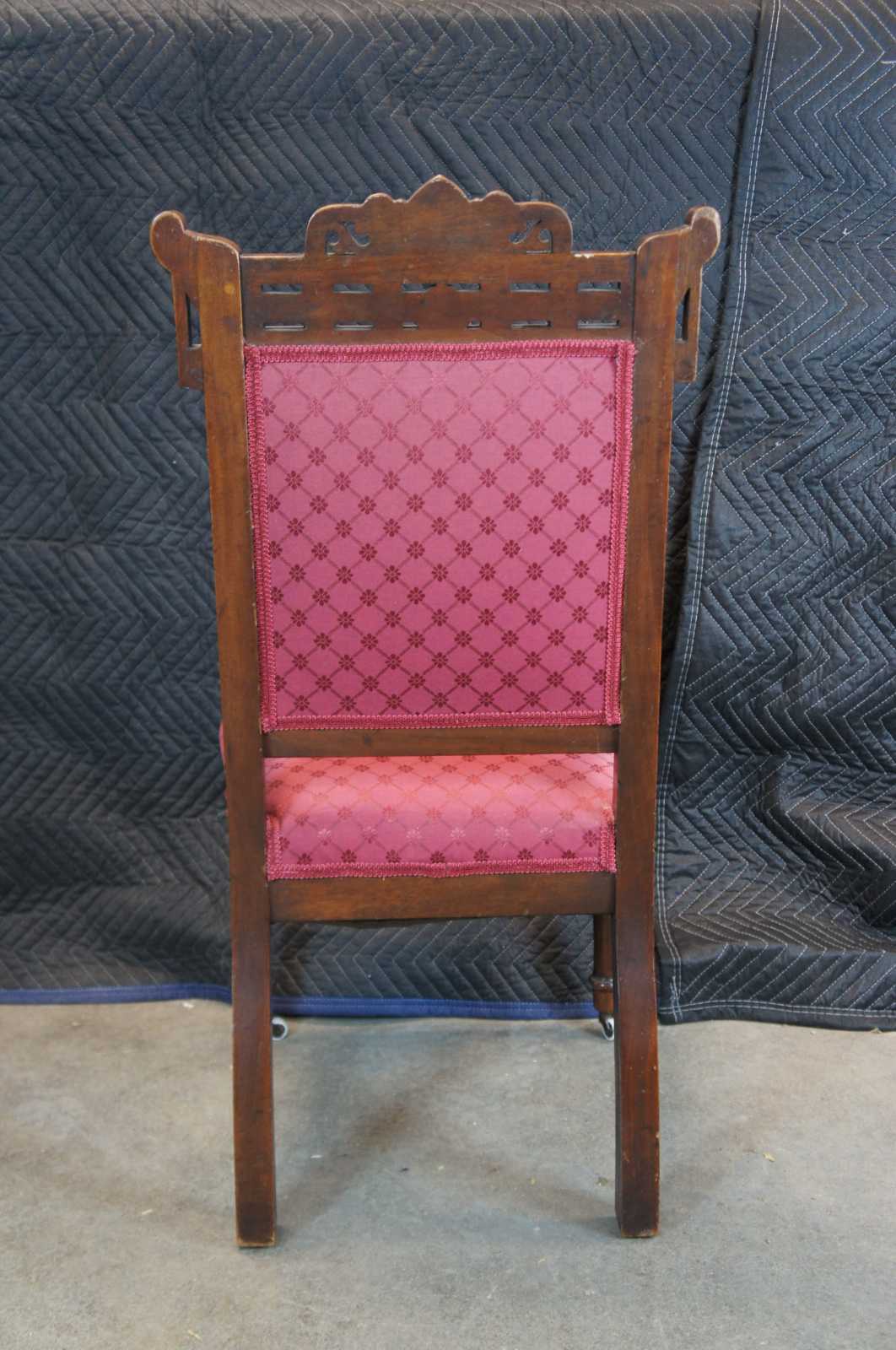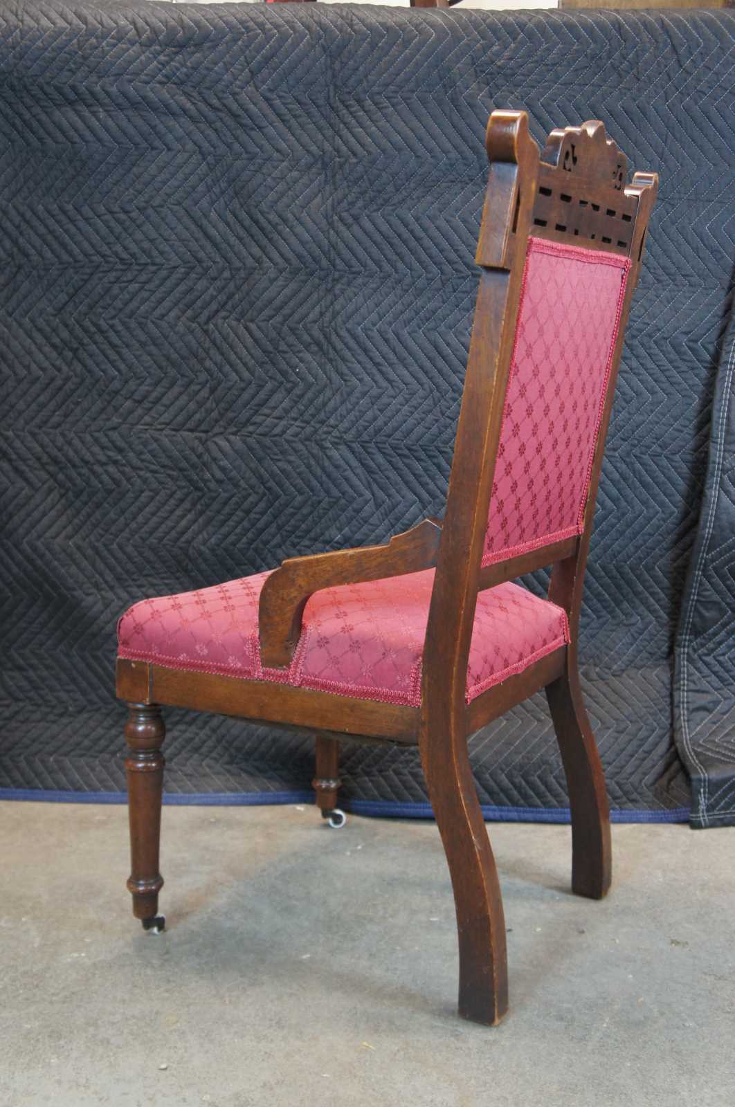 Antique Victorian Eastlake parlor / vanity or dining chair. Made of walnut featuring ornate styling with burled panels, pierced back featuring crest and turned tapered front legs with castors.