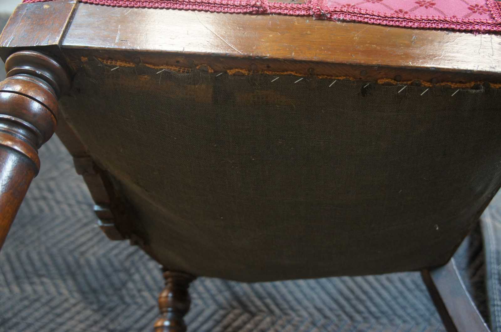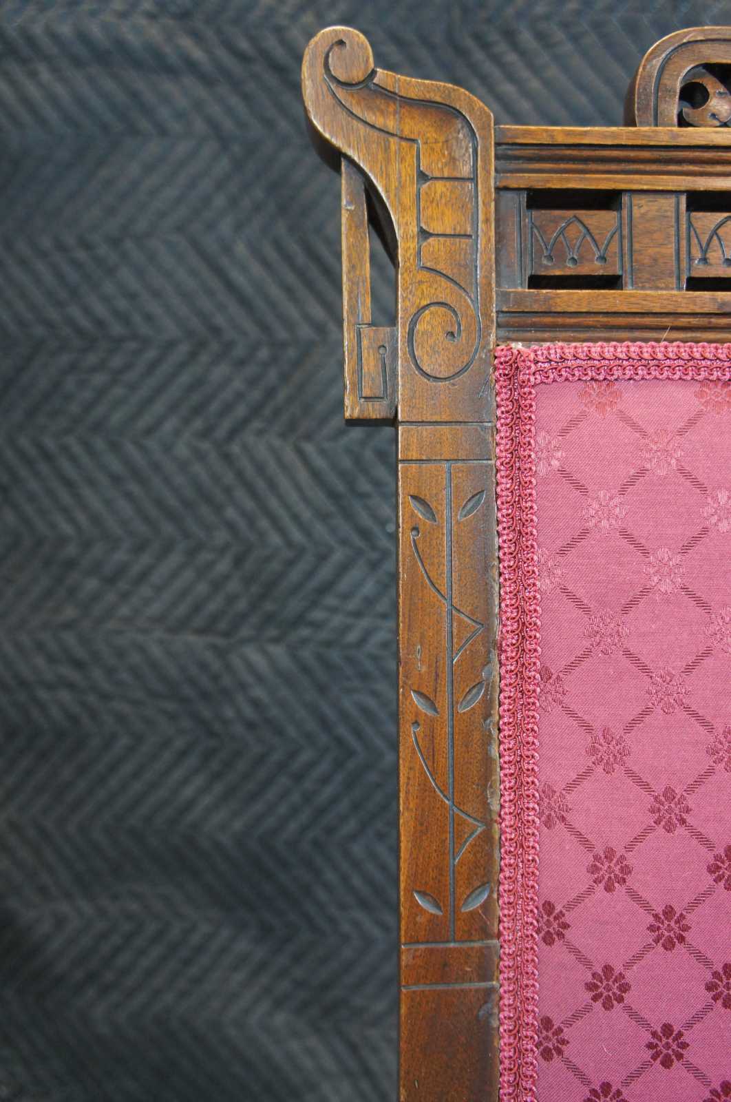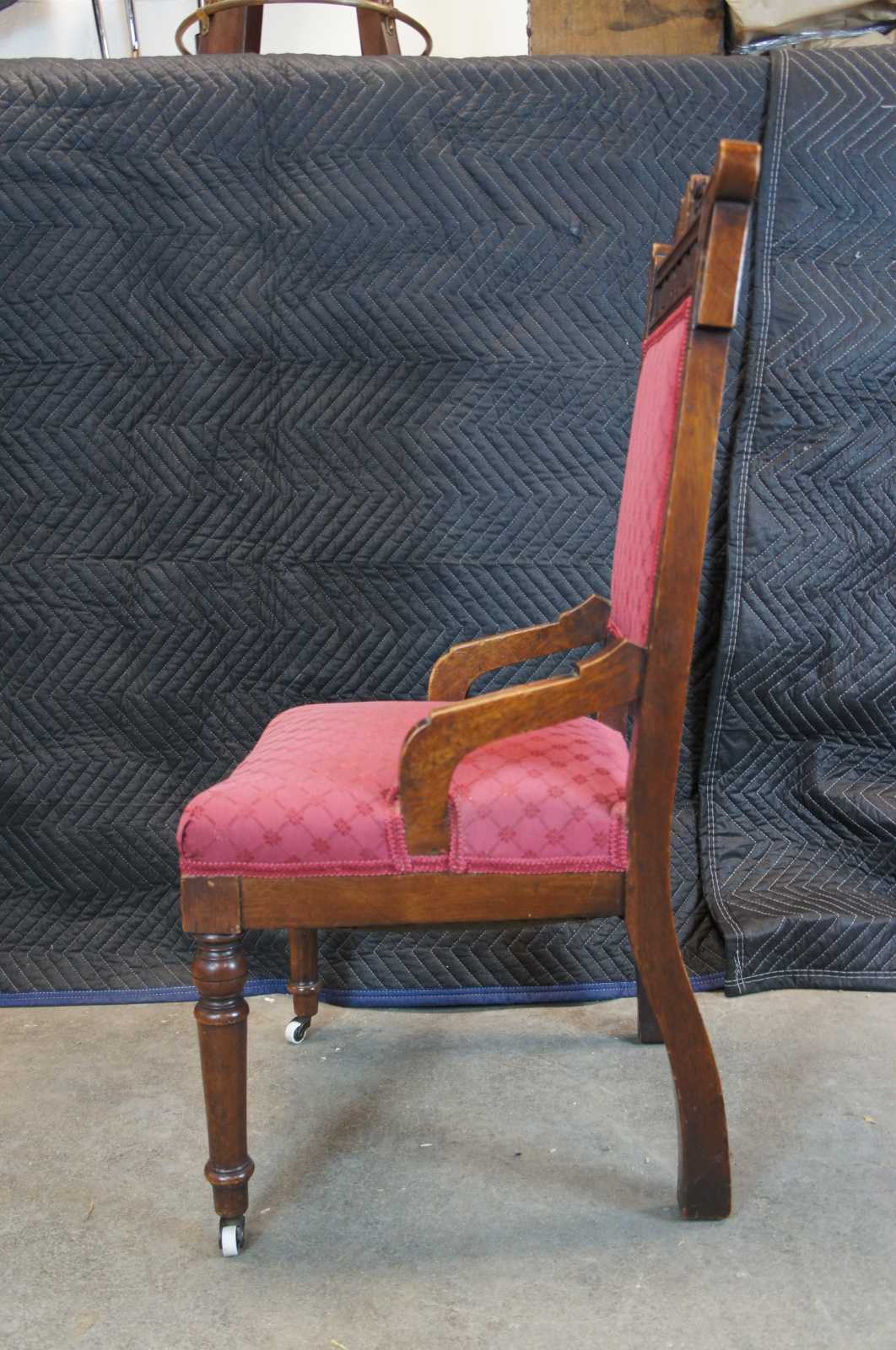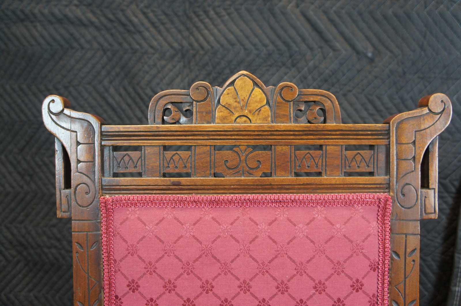 Antique Victorian Eastlake parlor / vanity or dining chair. Made of walnut featuring ornate styling with burled panels, pierced back featuring crest and turned tapered front legs with castors.