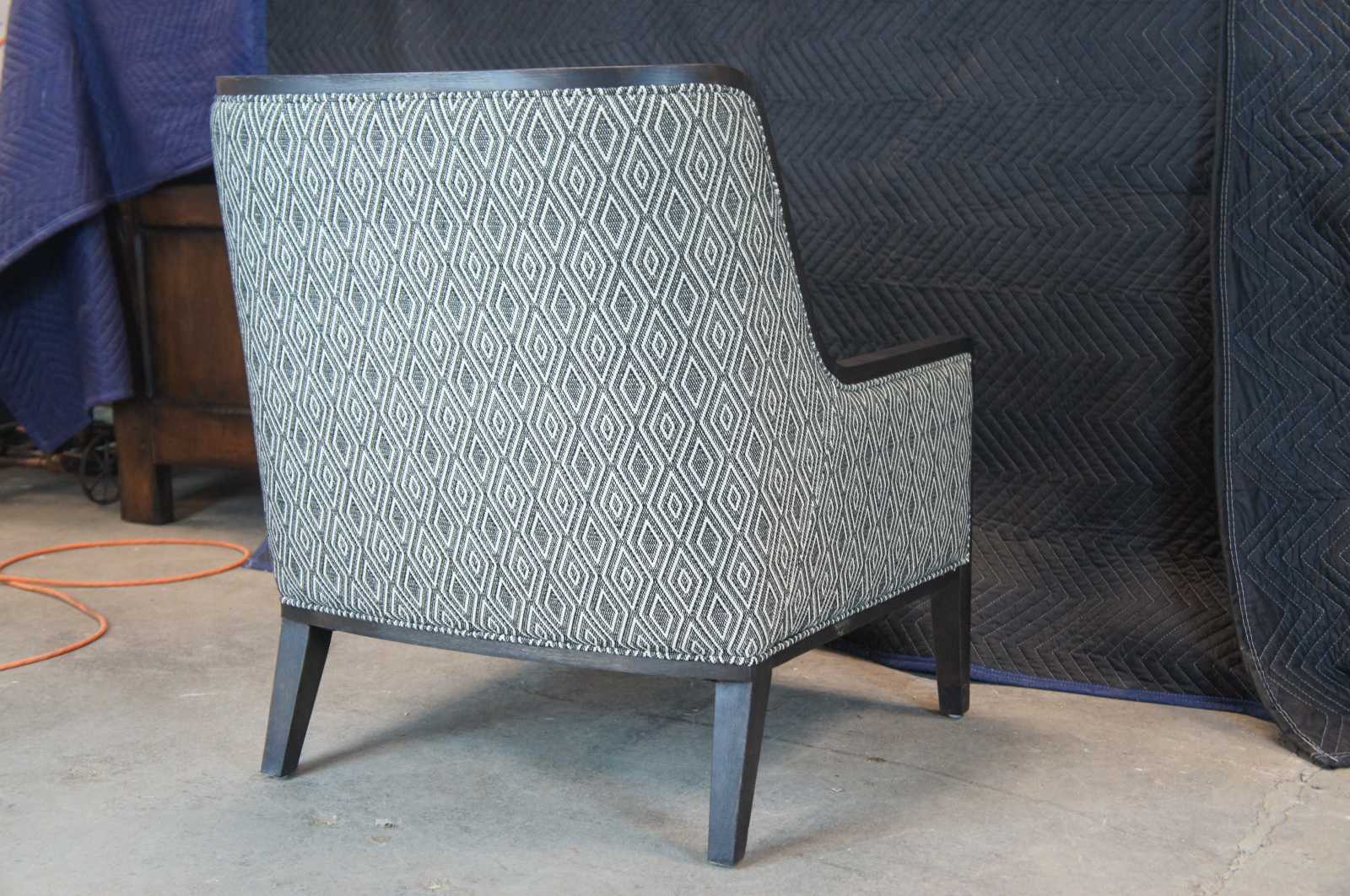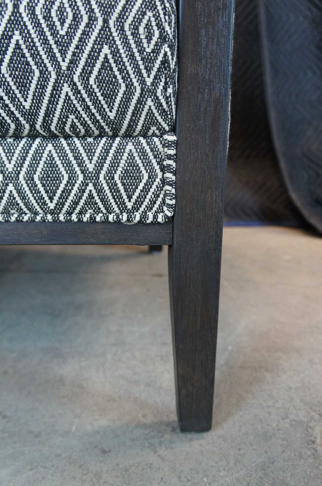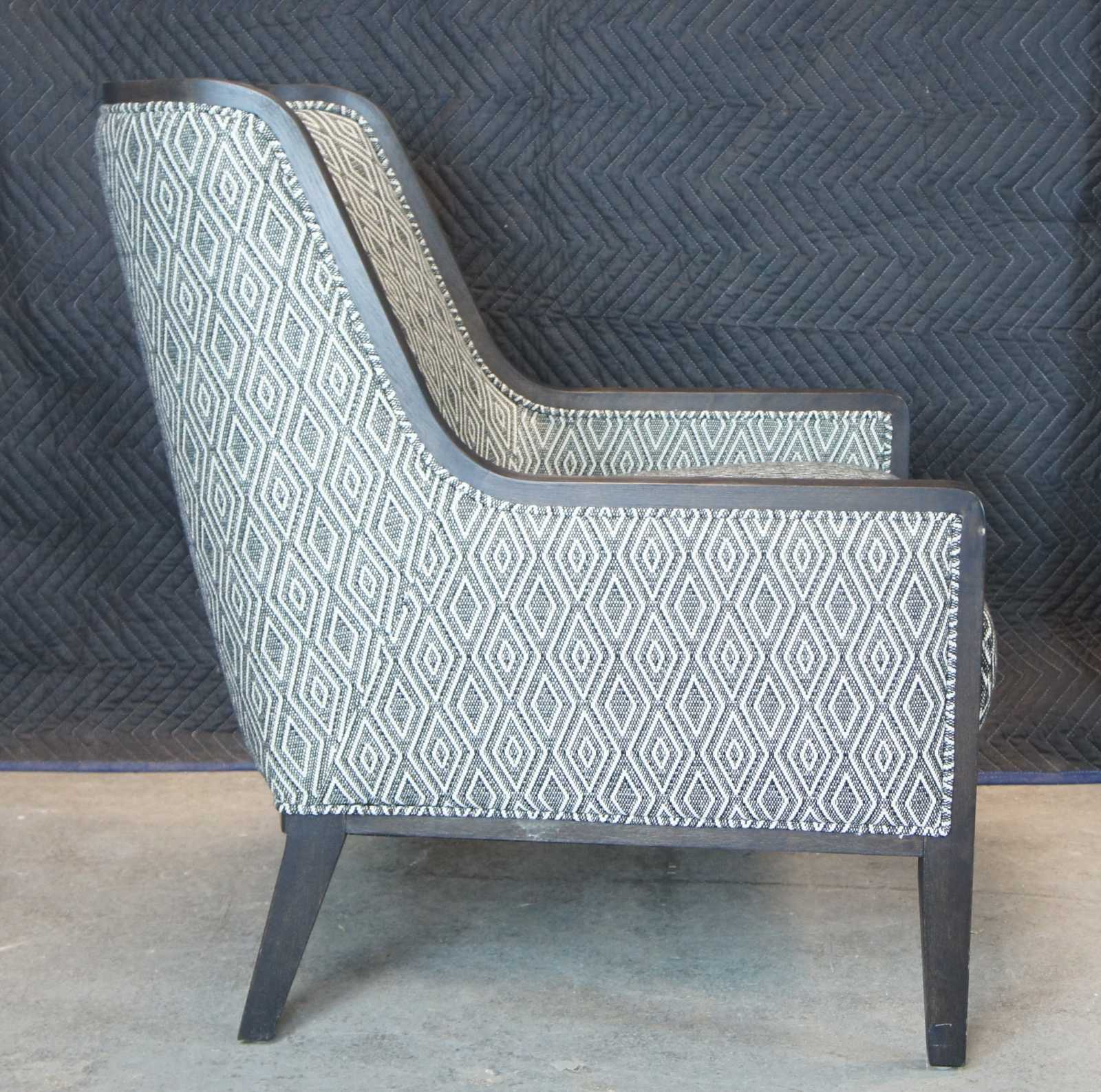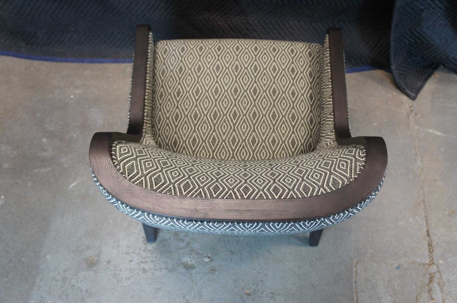Two Arhaus James Studio office, accent or library armchairs featuring a bentwood frame with rounded and sloped back and geometric repeating diamond pattern fabric. Circa 2017.