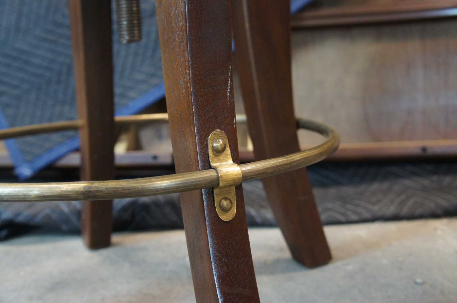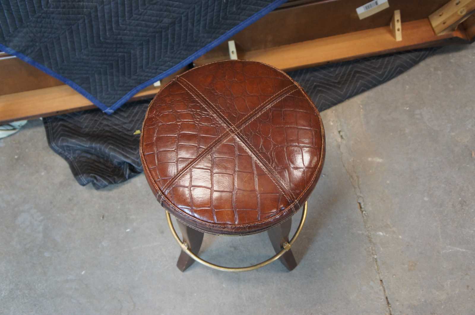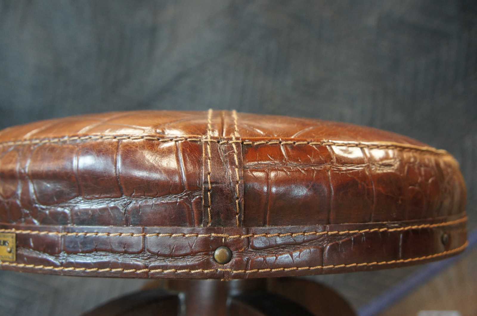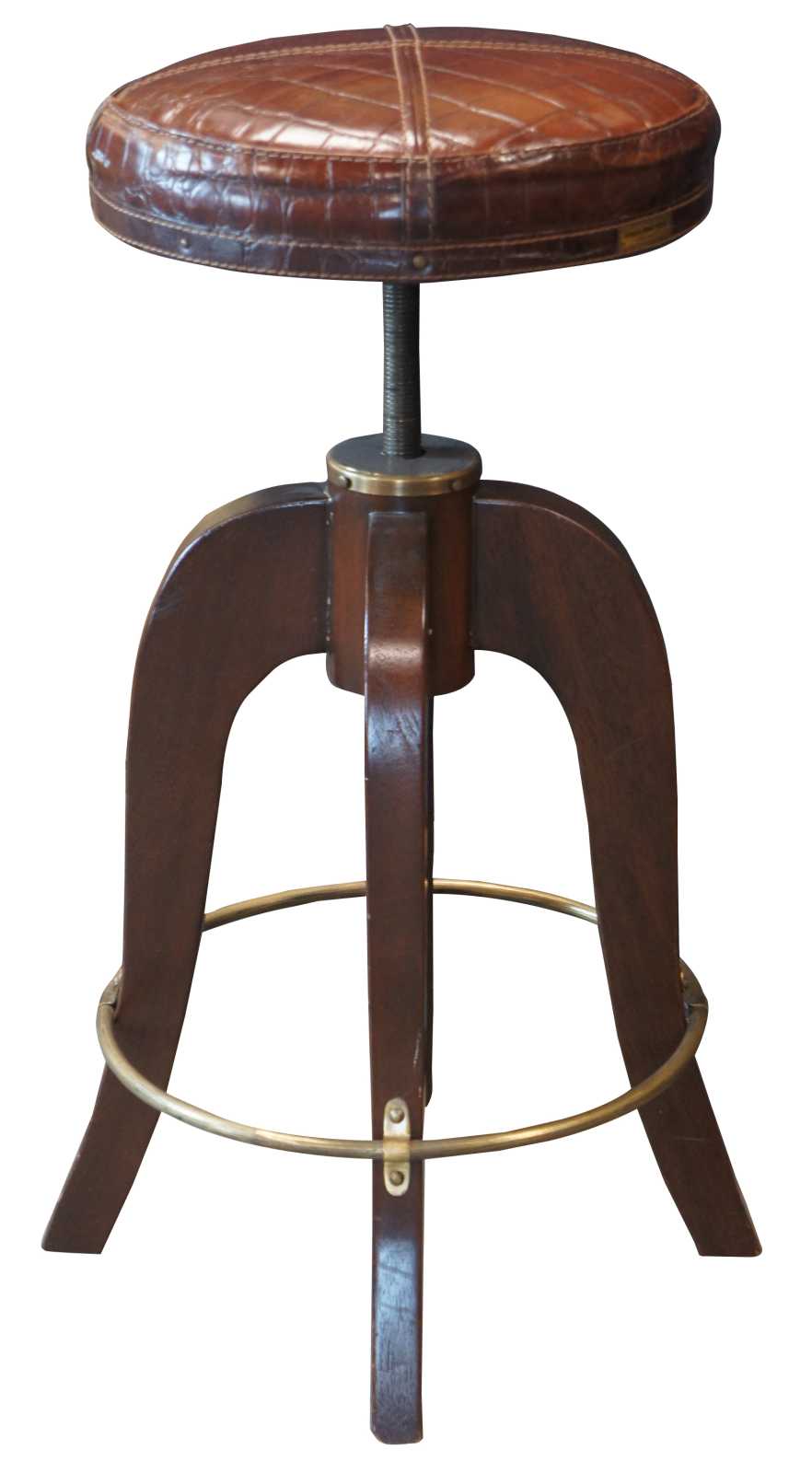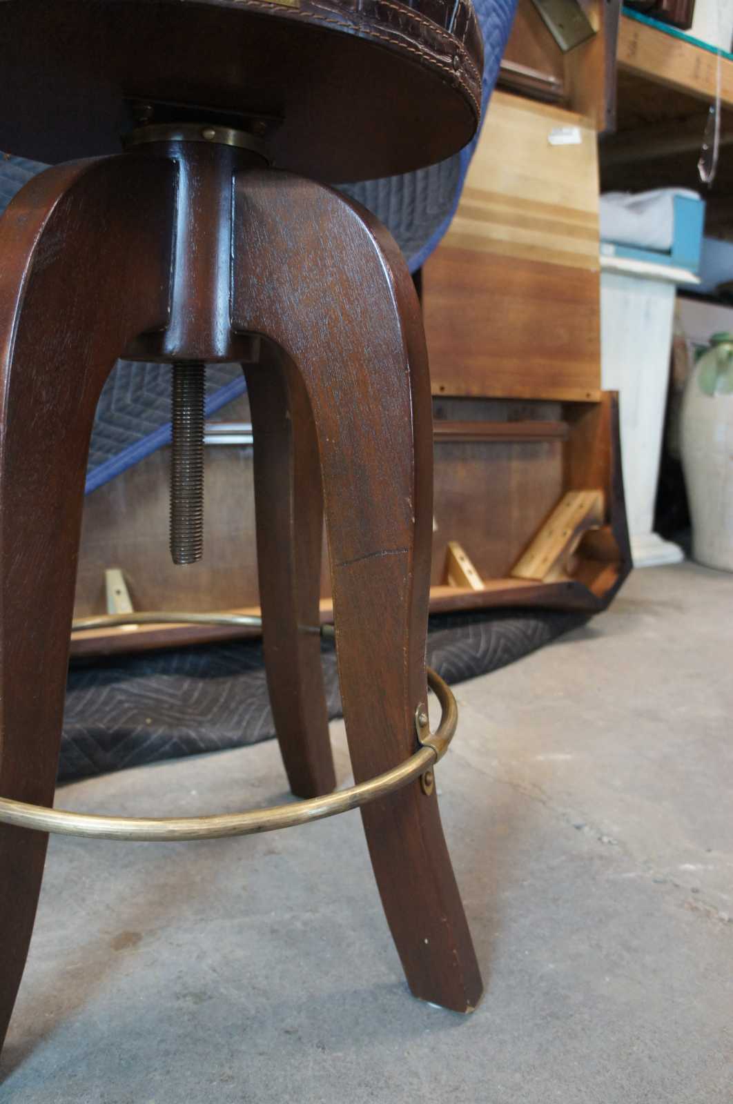 Vintage Bauer International Stiles Brothers collection campaign barstool. Made of mahogany and brass with crocodile embossed leather seat.