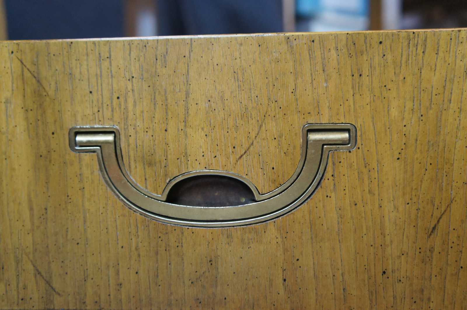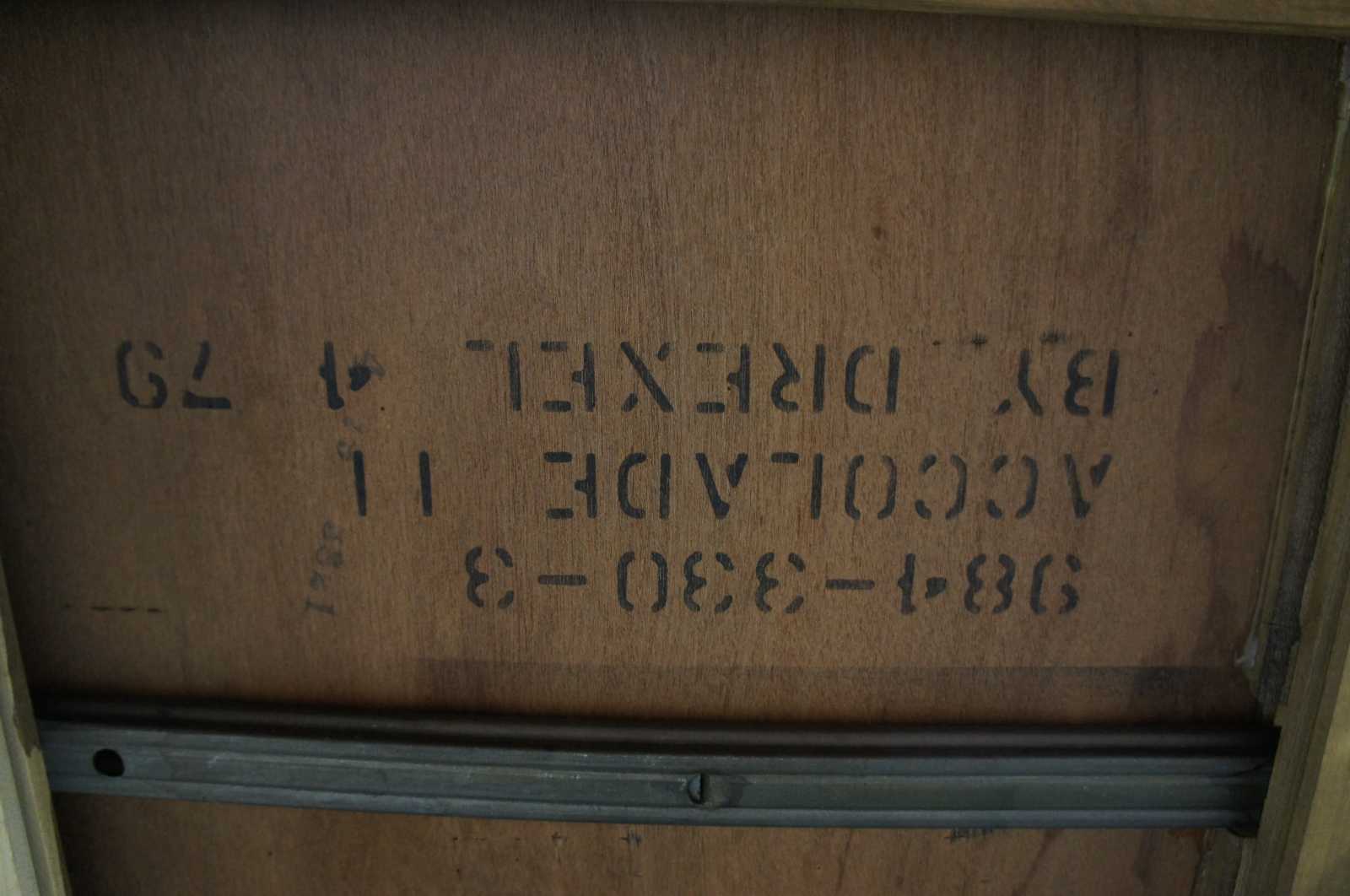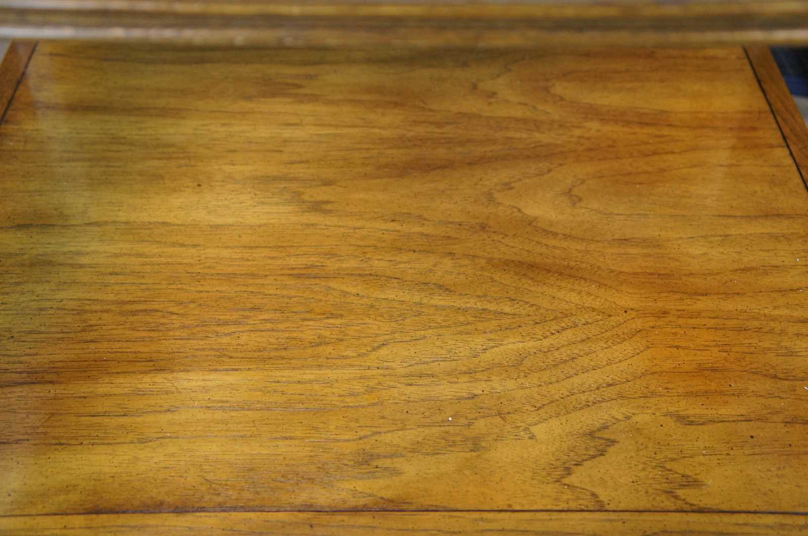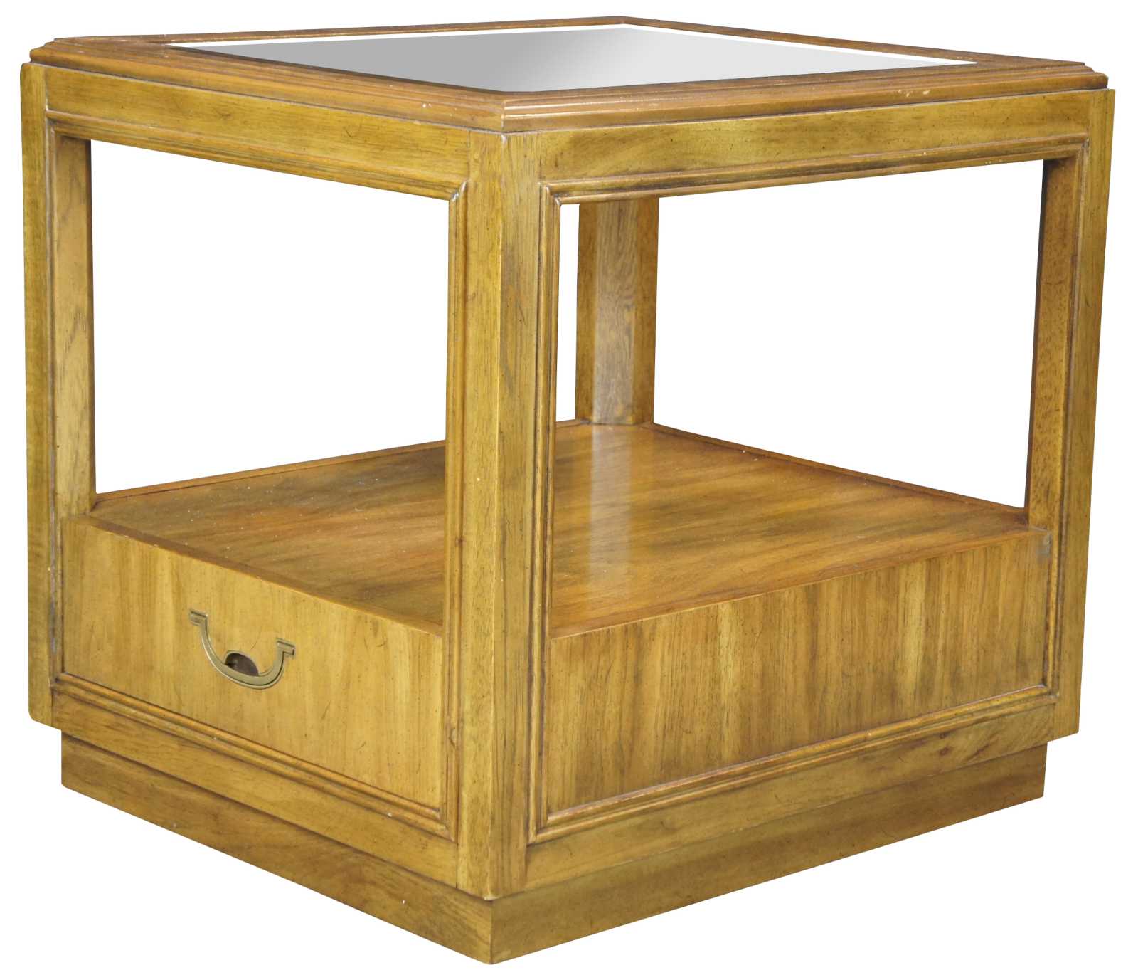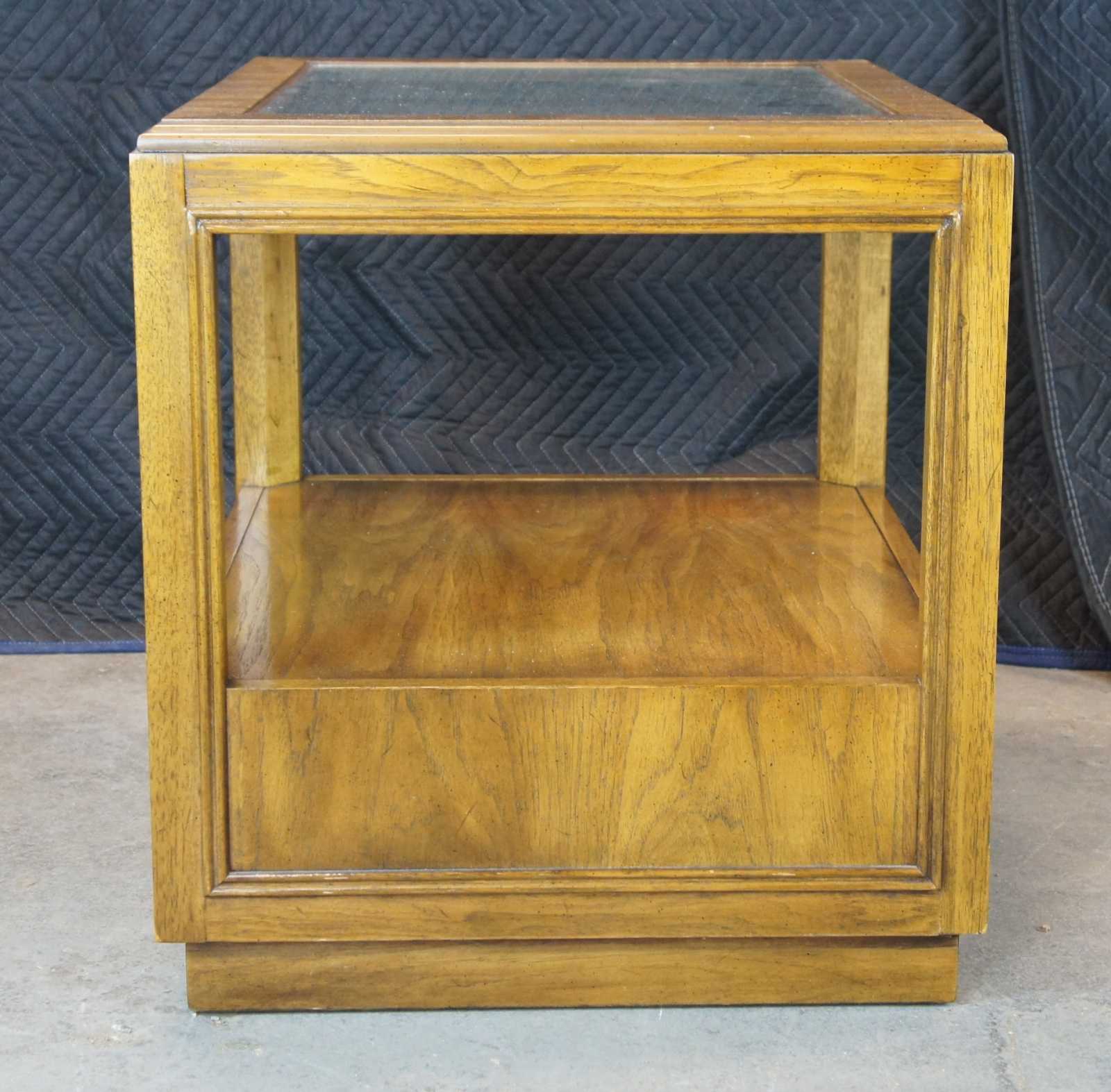 Vintage 1979 Drexel Heritage Accolade II side table. Made of walnut featuring cube shape with two tiers, glass top and storage drawer.