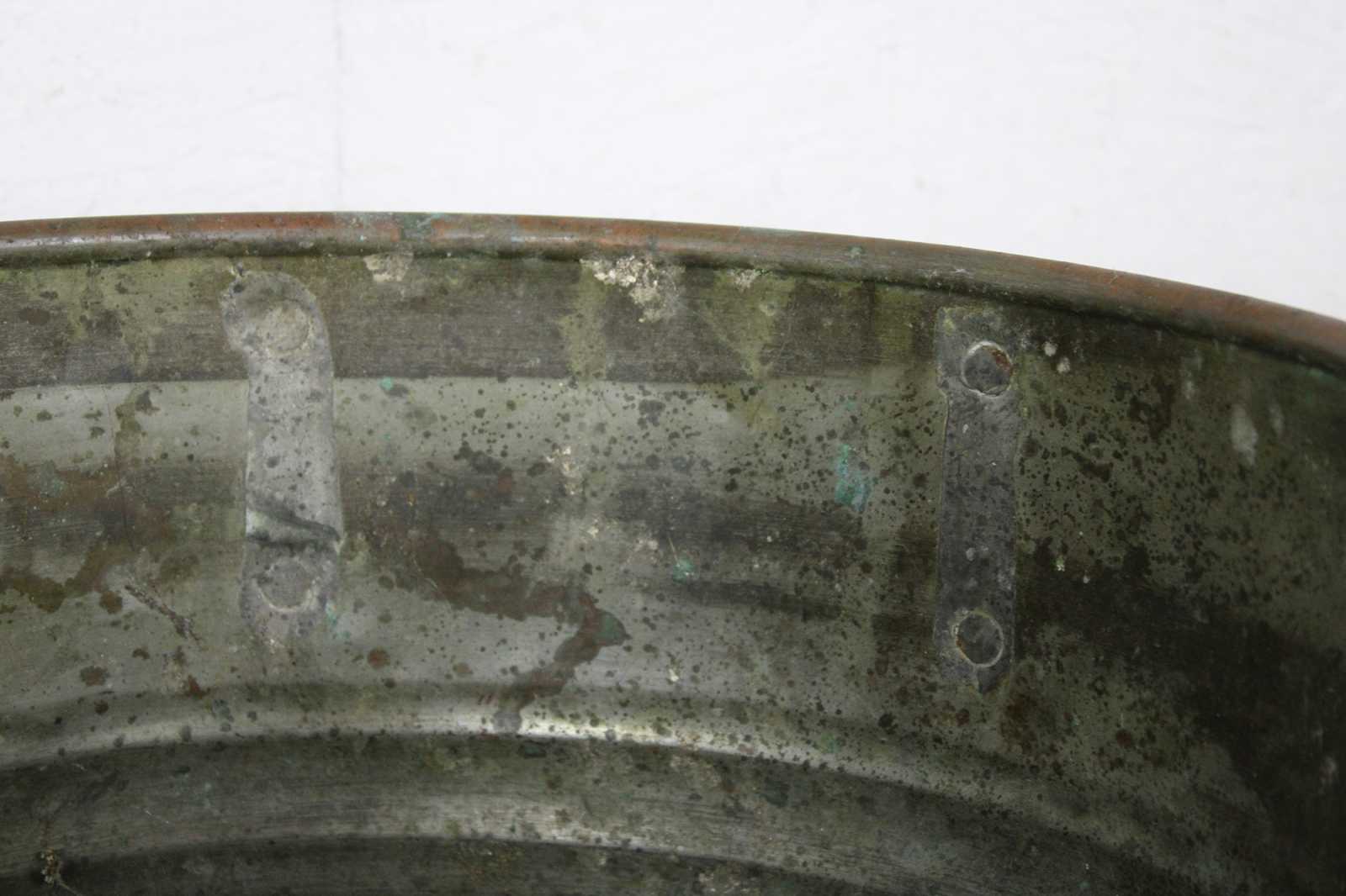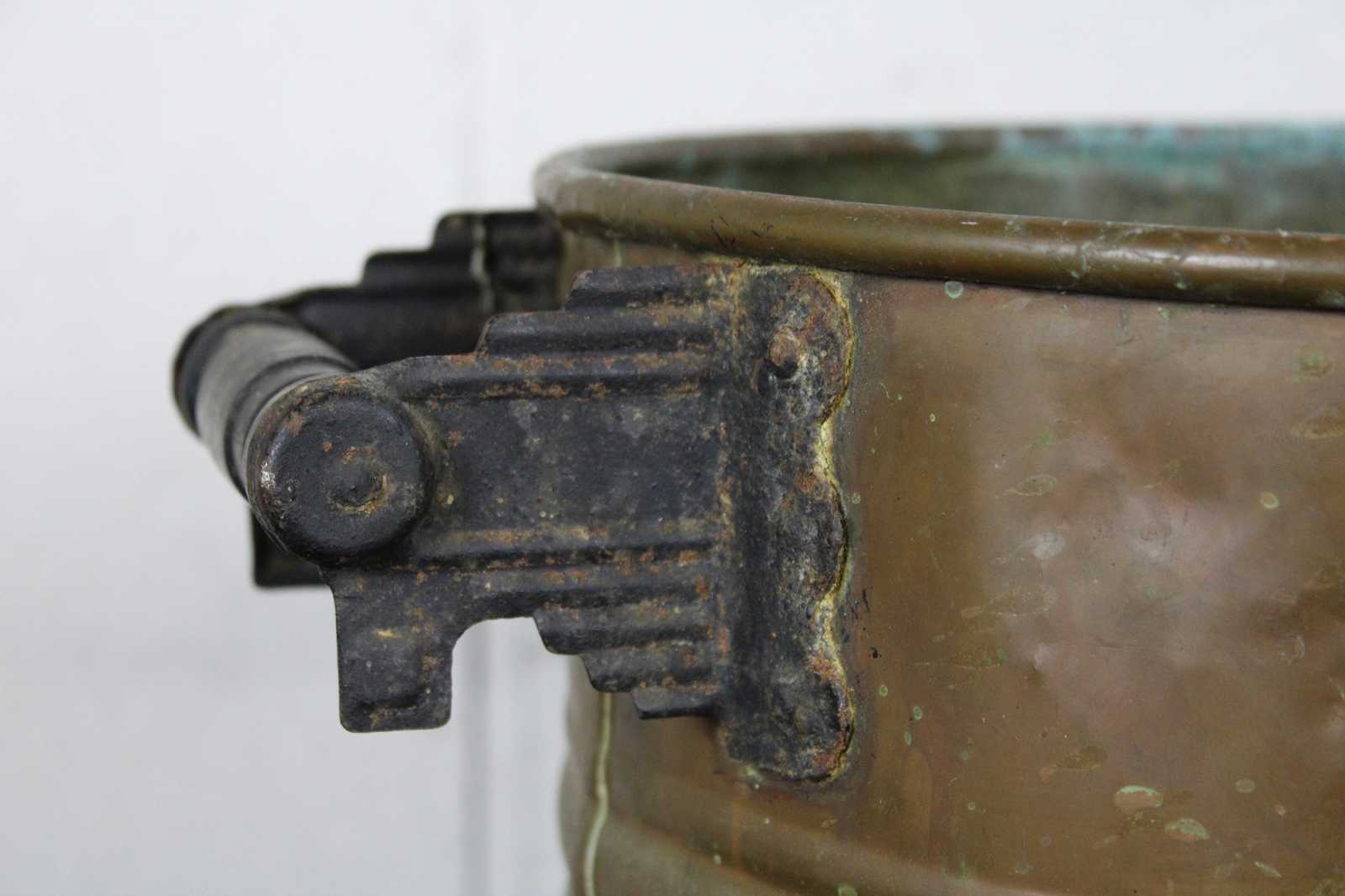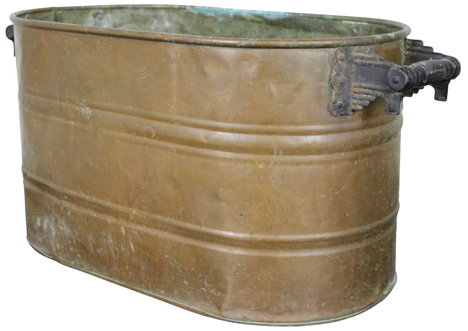 Antique copper boiler, firewood bin or wash tub with art deco style iron handles.