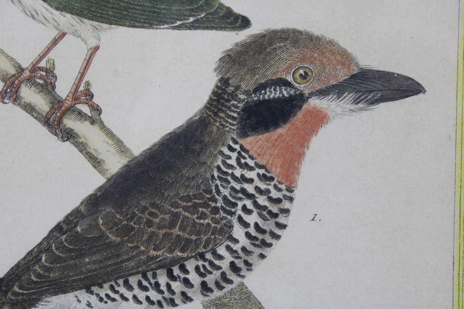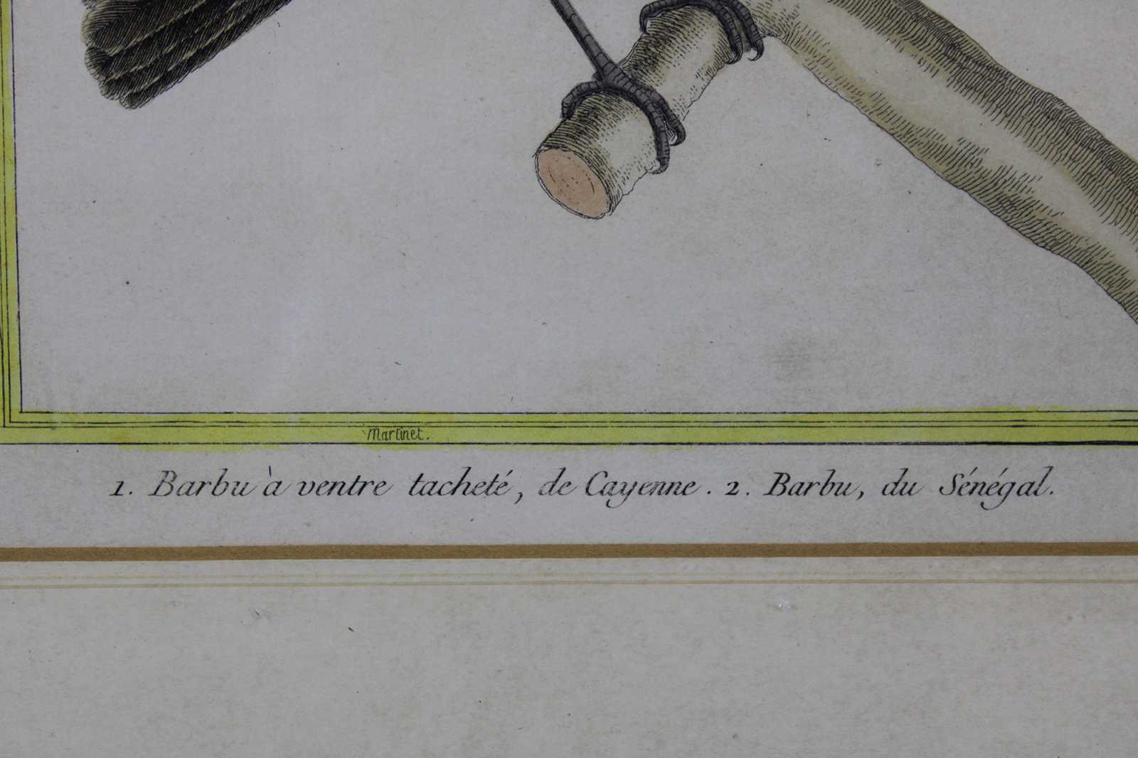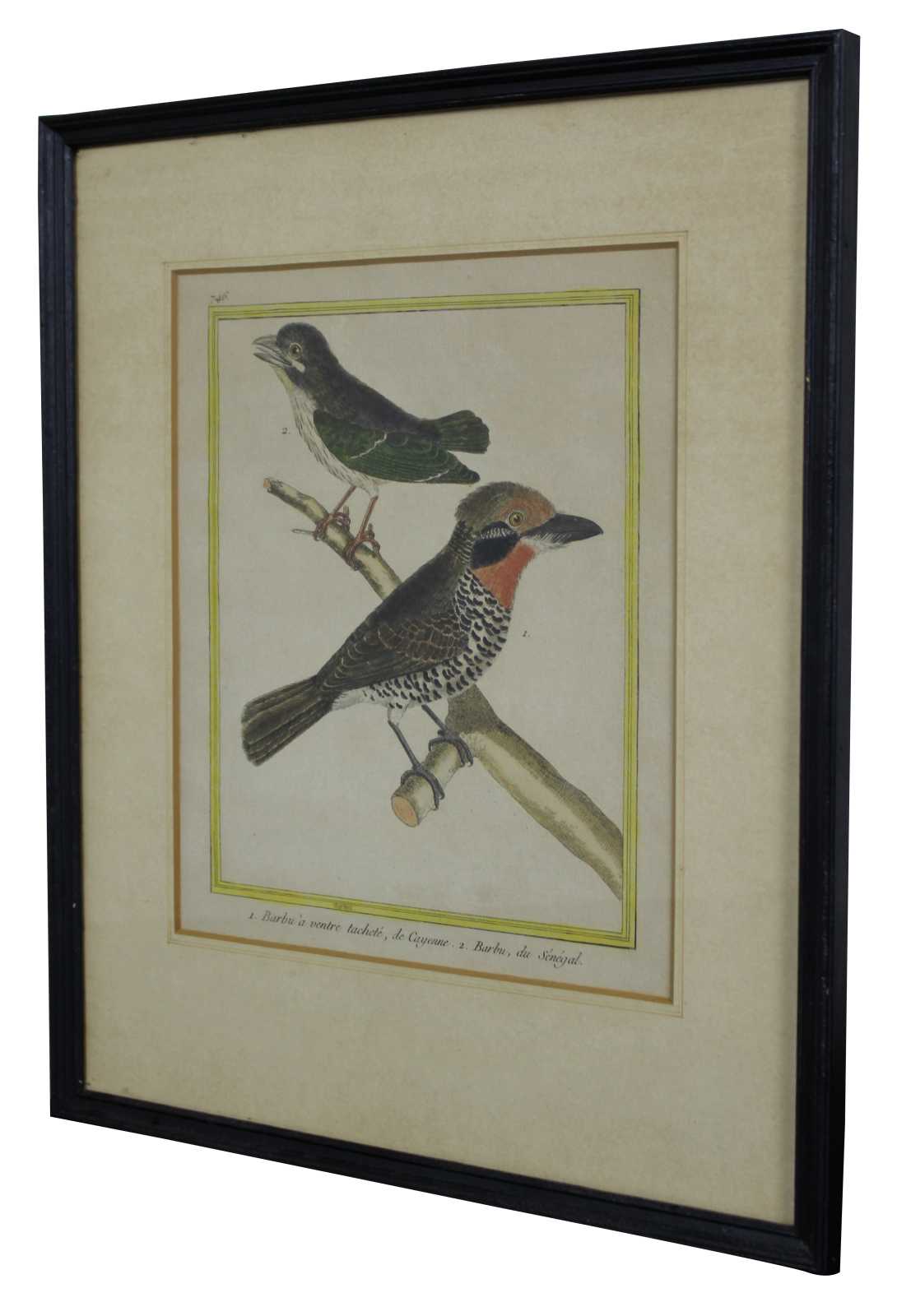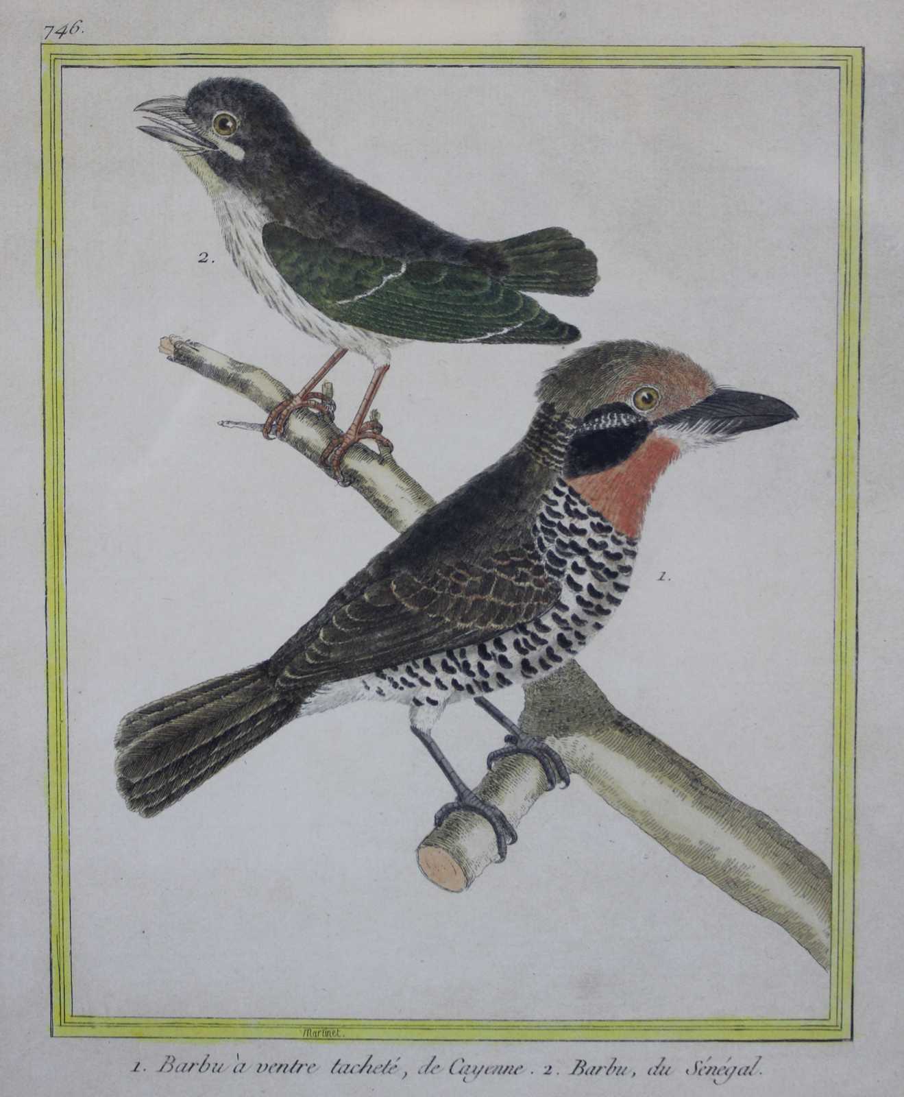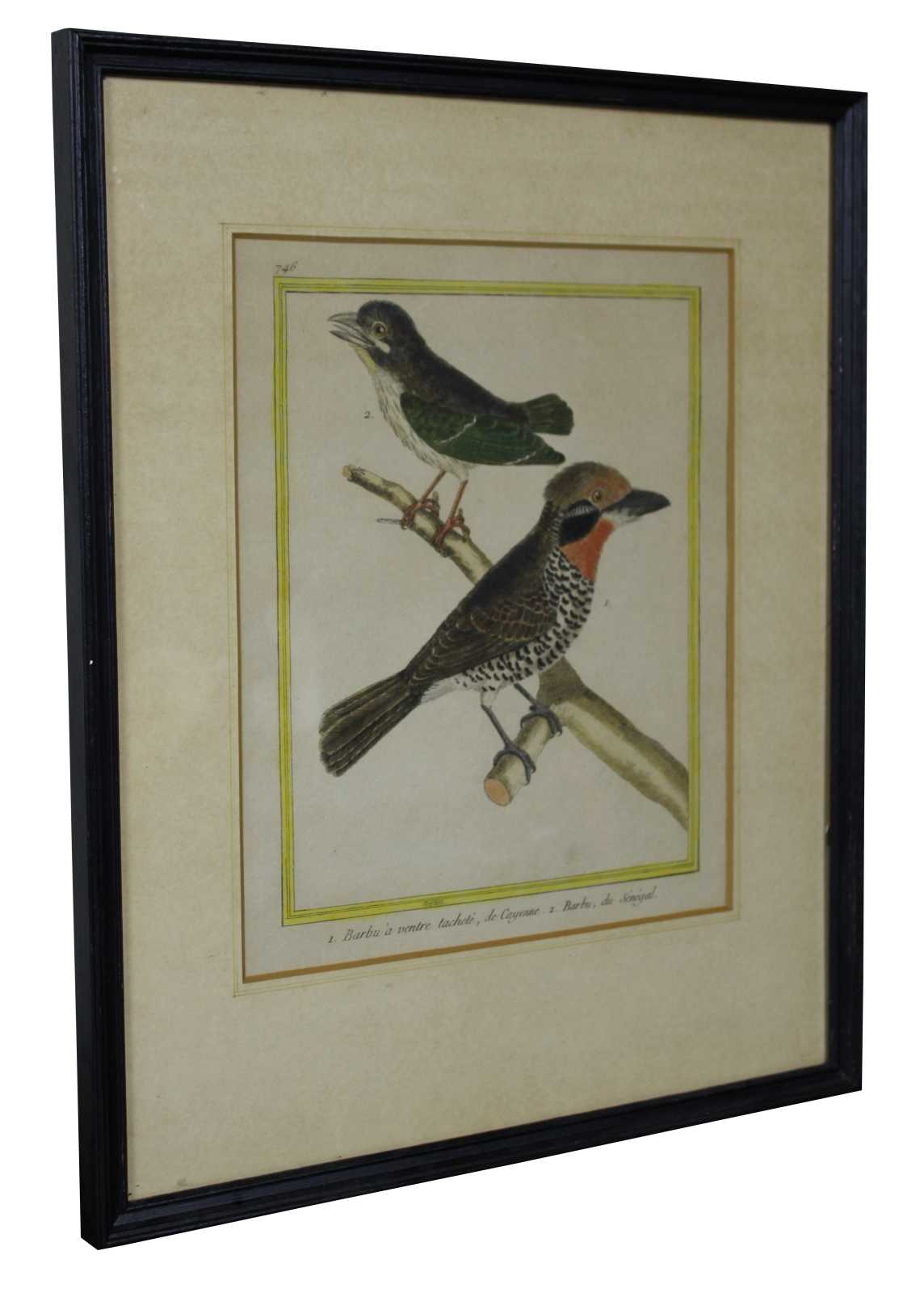 Antique 18th century hand colored copperplate engraving of a pair of tropical bearded and spotted birds by Francois Nicholas Martinet (1725-1804), Plate 746, circa 1770. “Barbu a ventre tachete, de Cayenne” and “Barbu, du Senegal”.