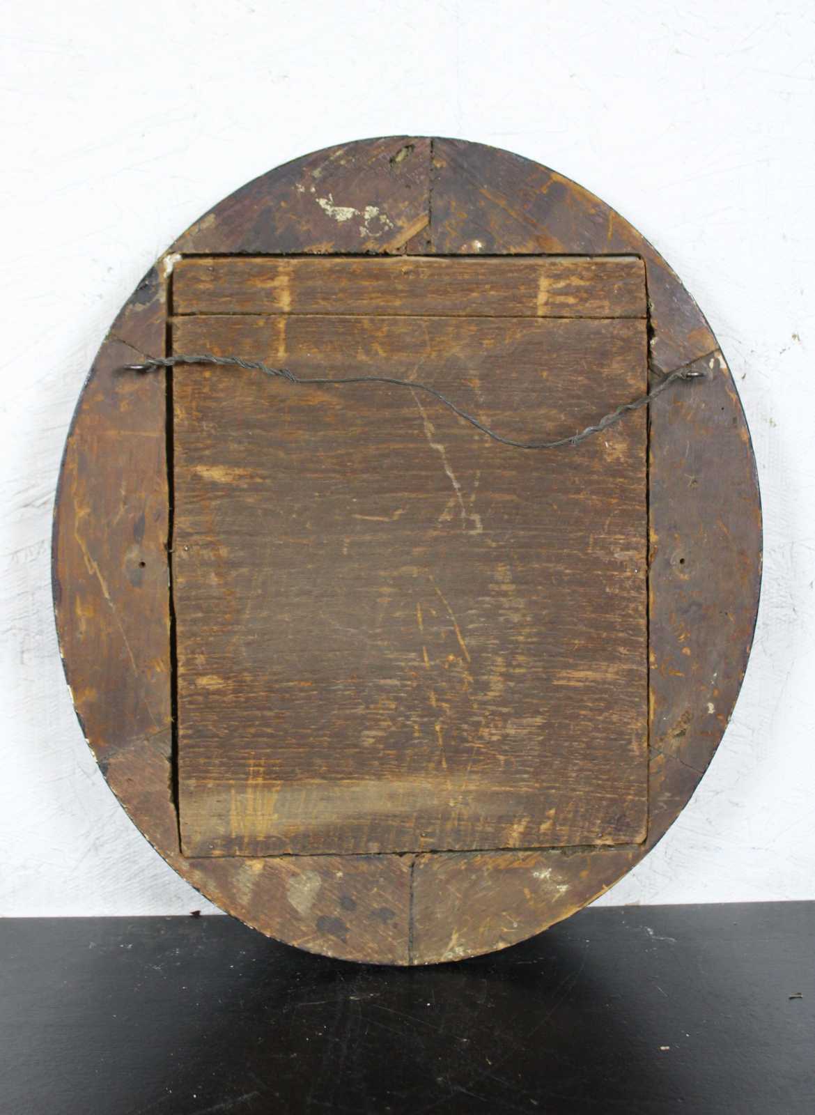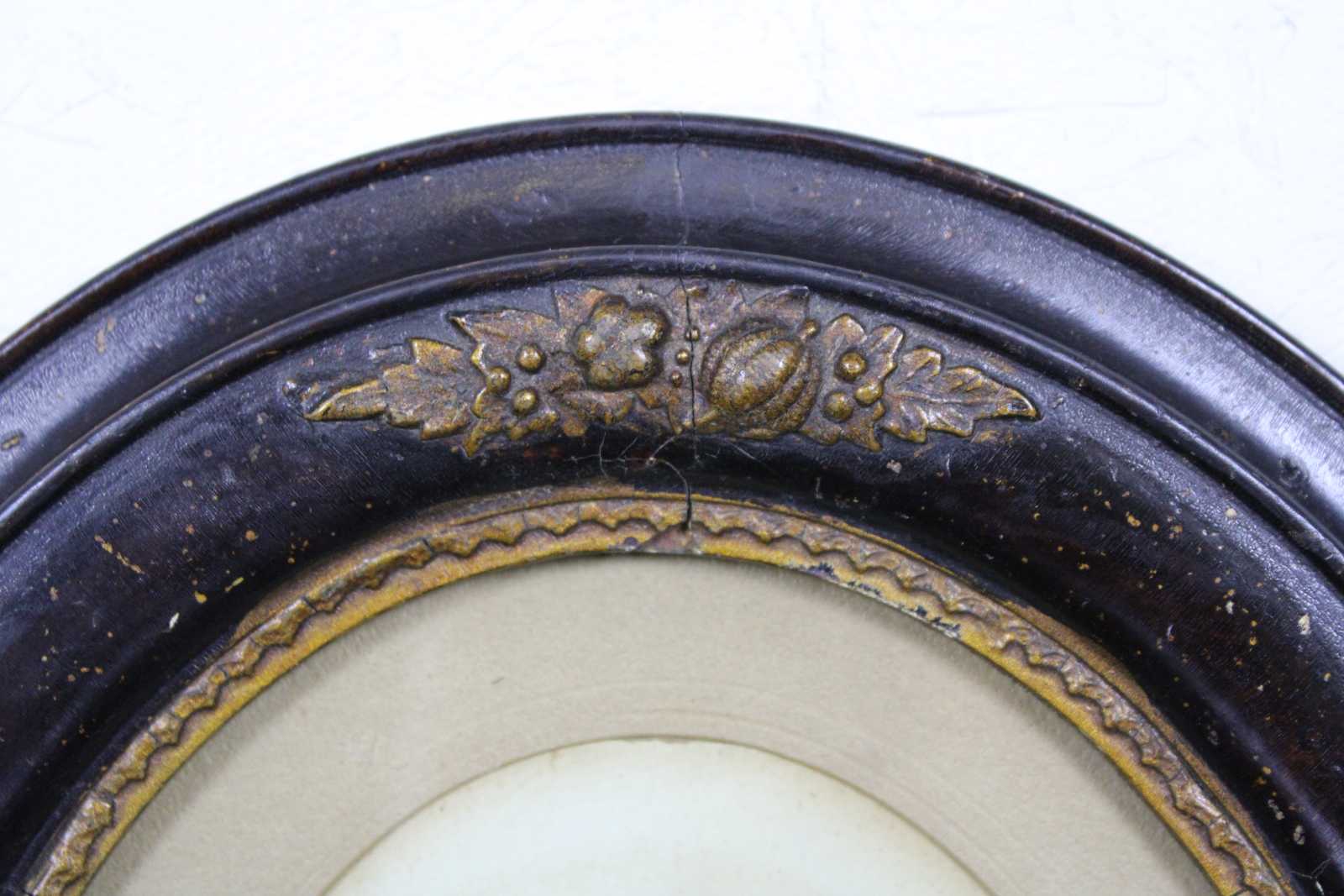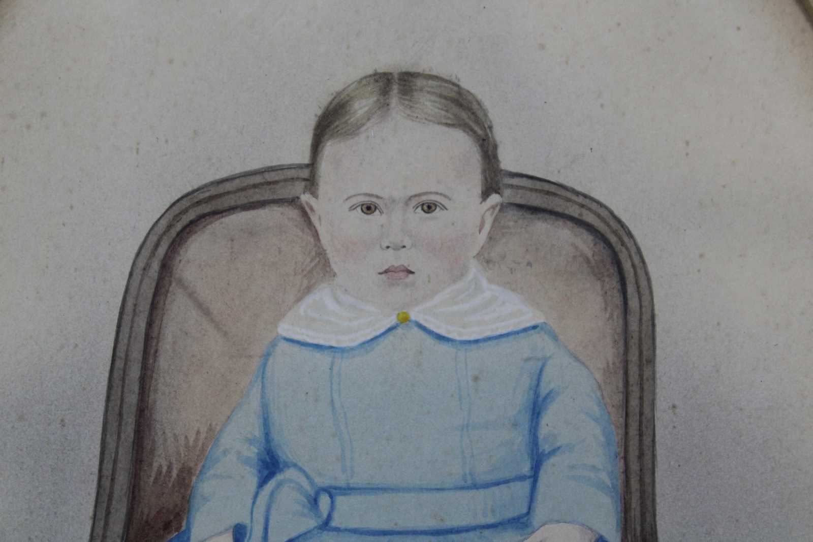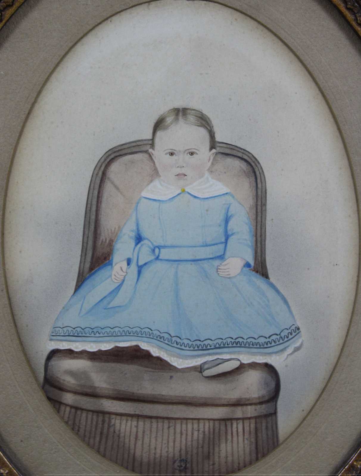 Antique Victorian watercolor portrait painting of an infant in a blue dress seated on a chair, circa 19th cenutry. Framed in an oval setting with a darkwood frame with gold trim.