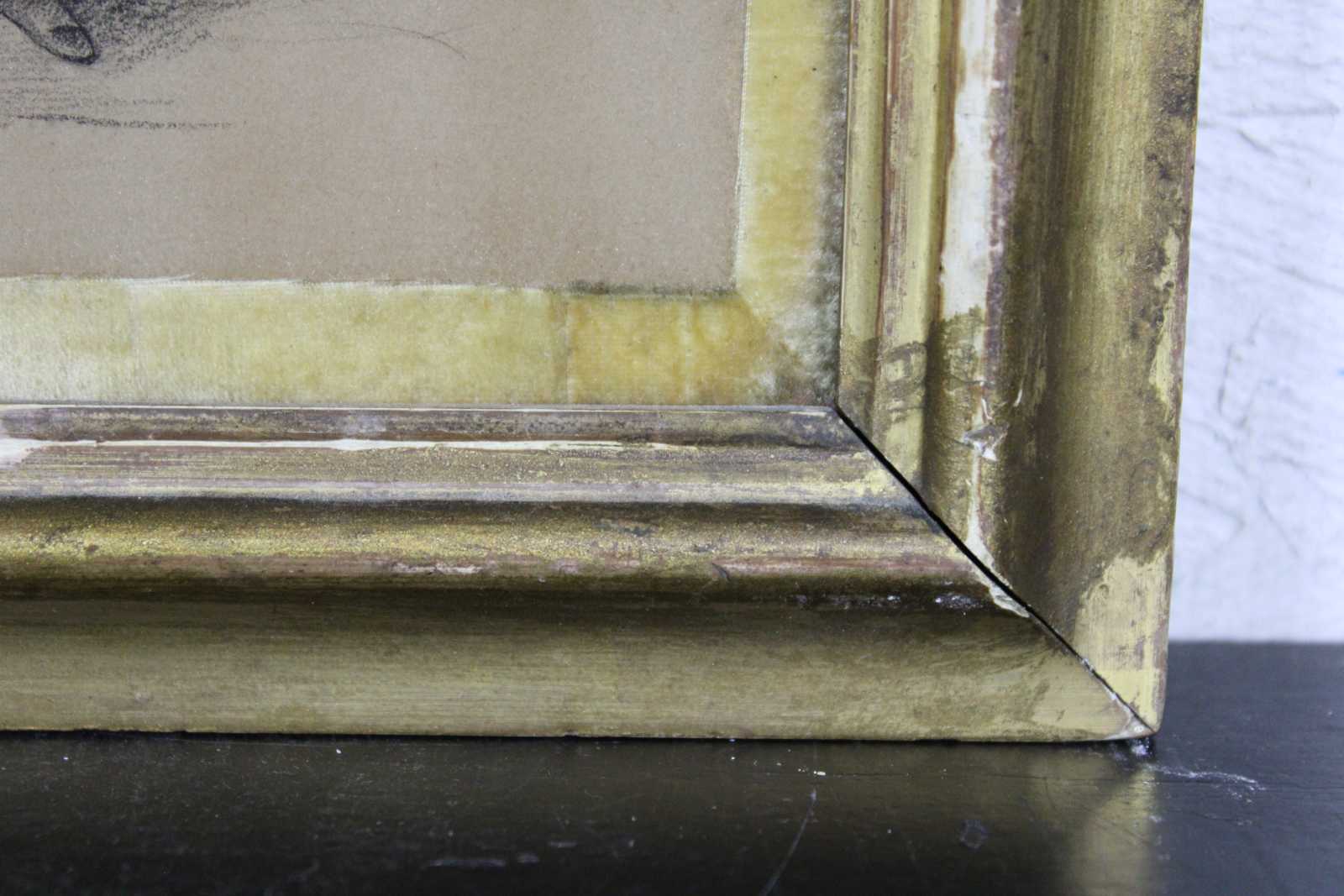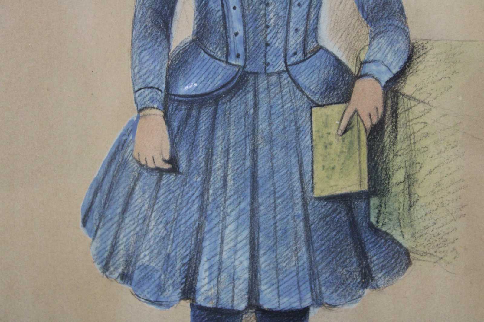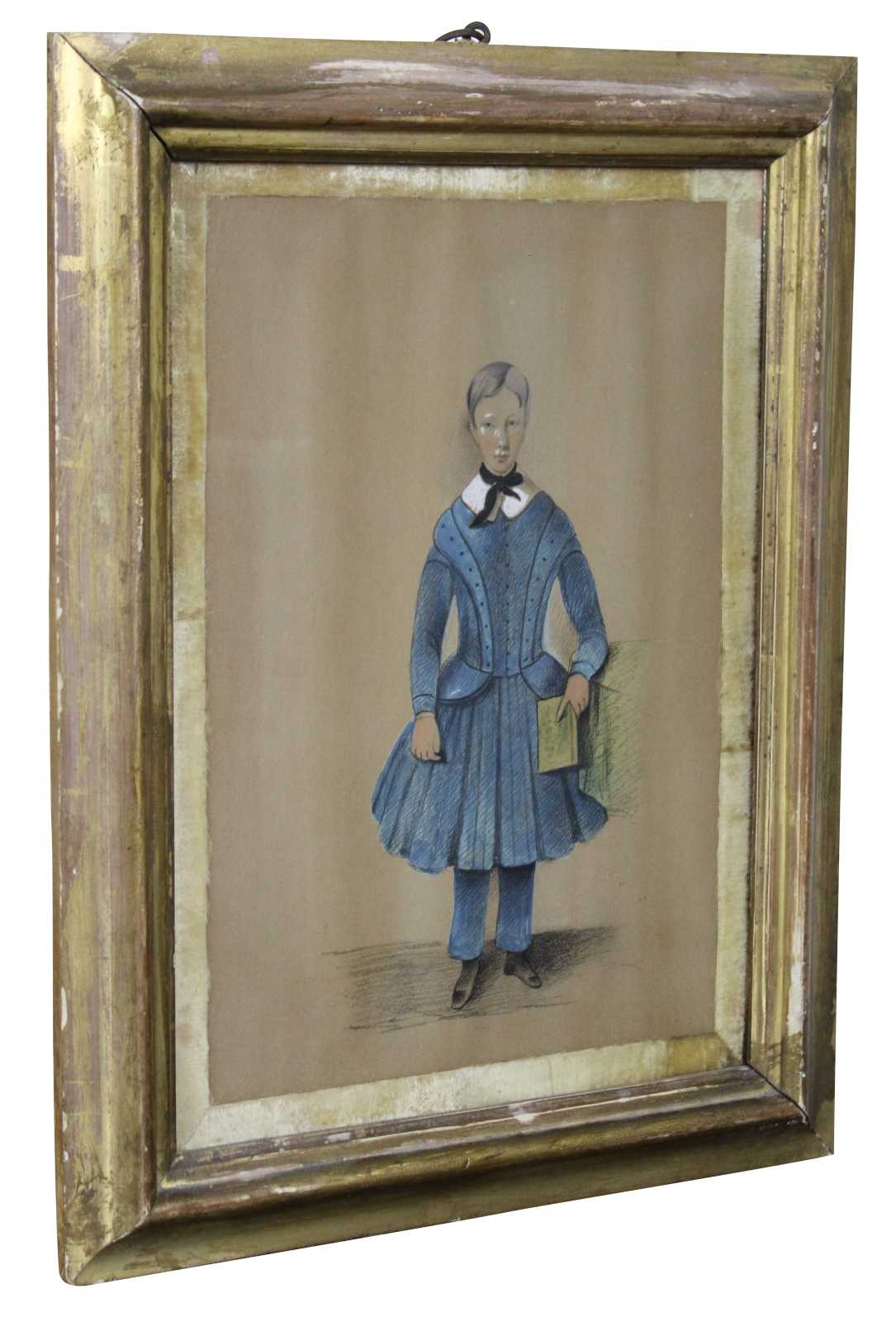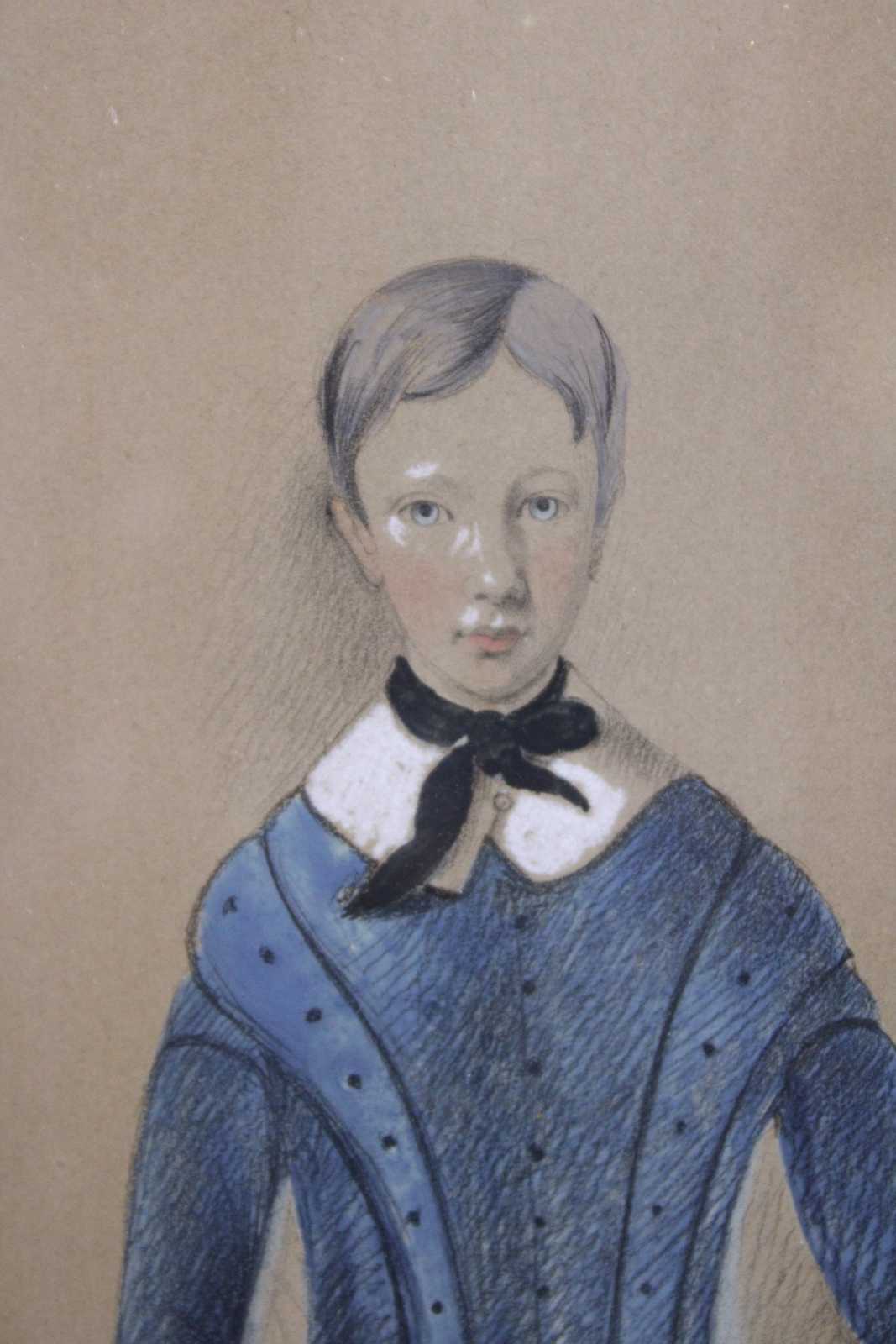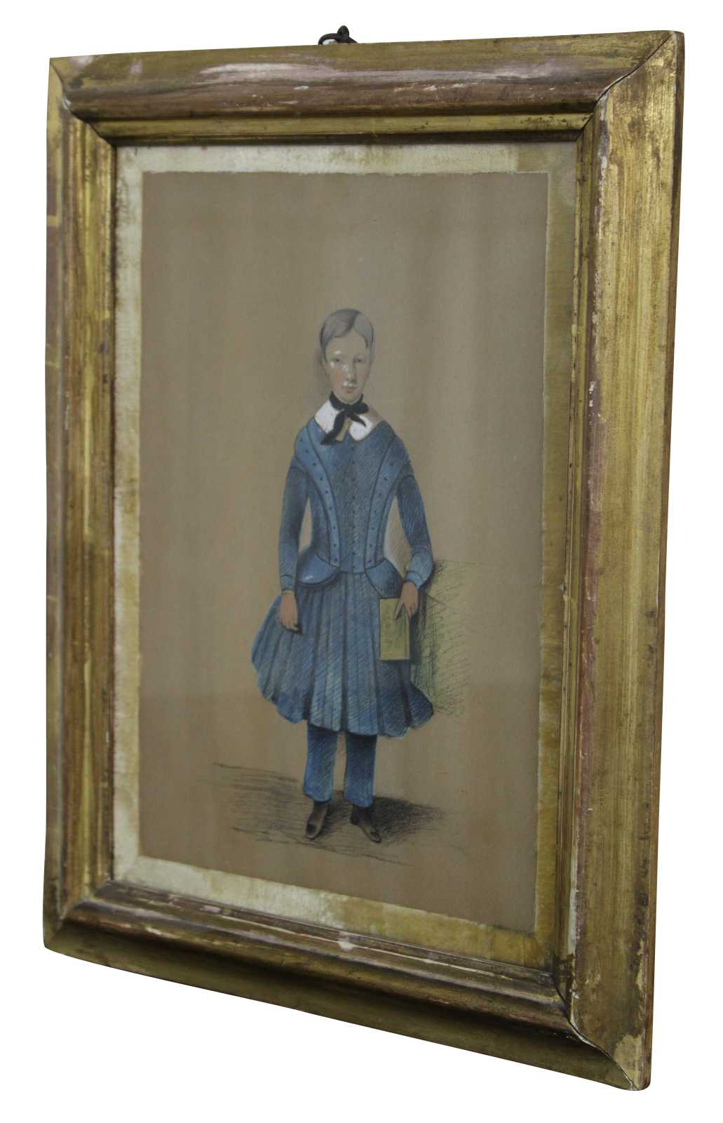 Antique pencil and watercolor portrait painting of a young boy in a blue dress and pants standing by a table with book in hand.