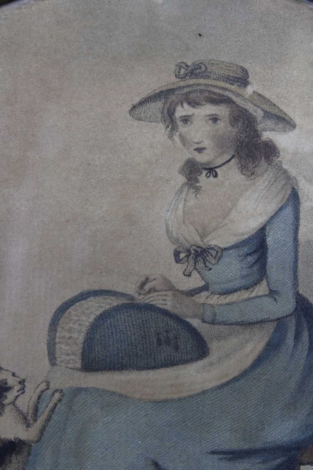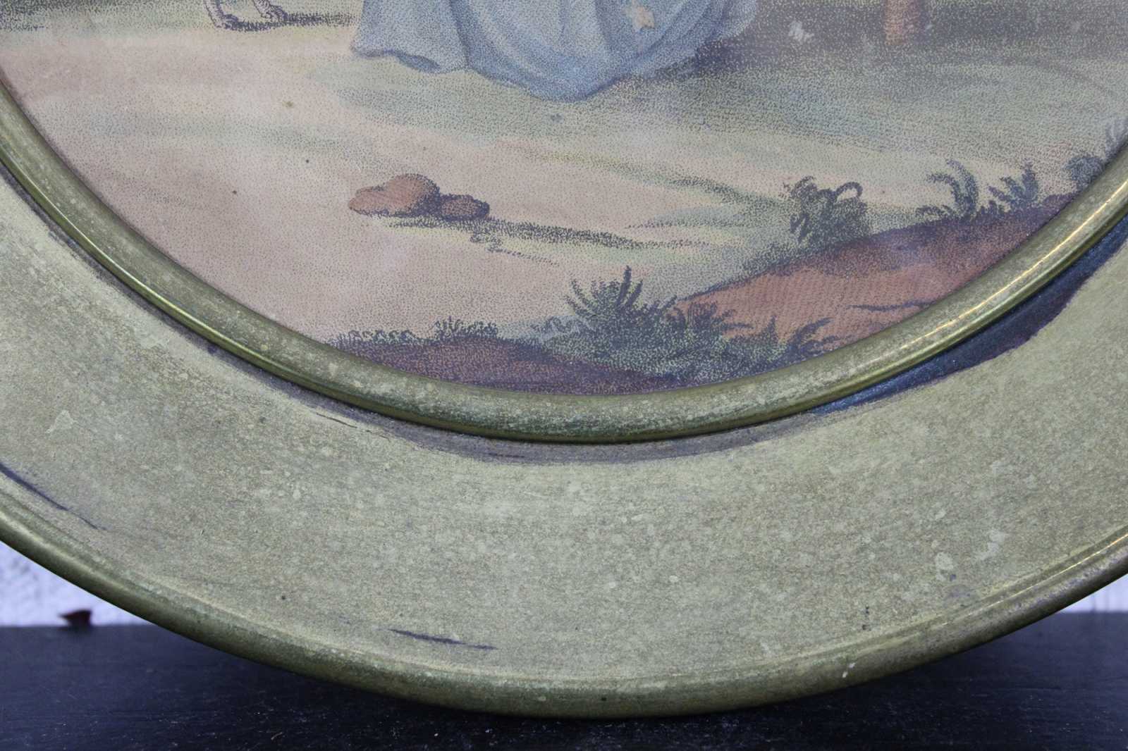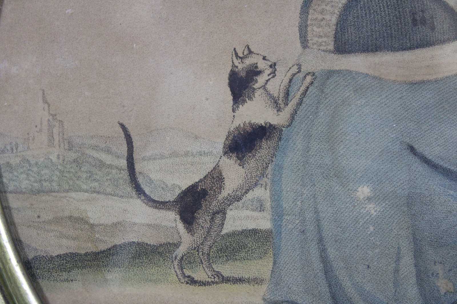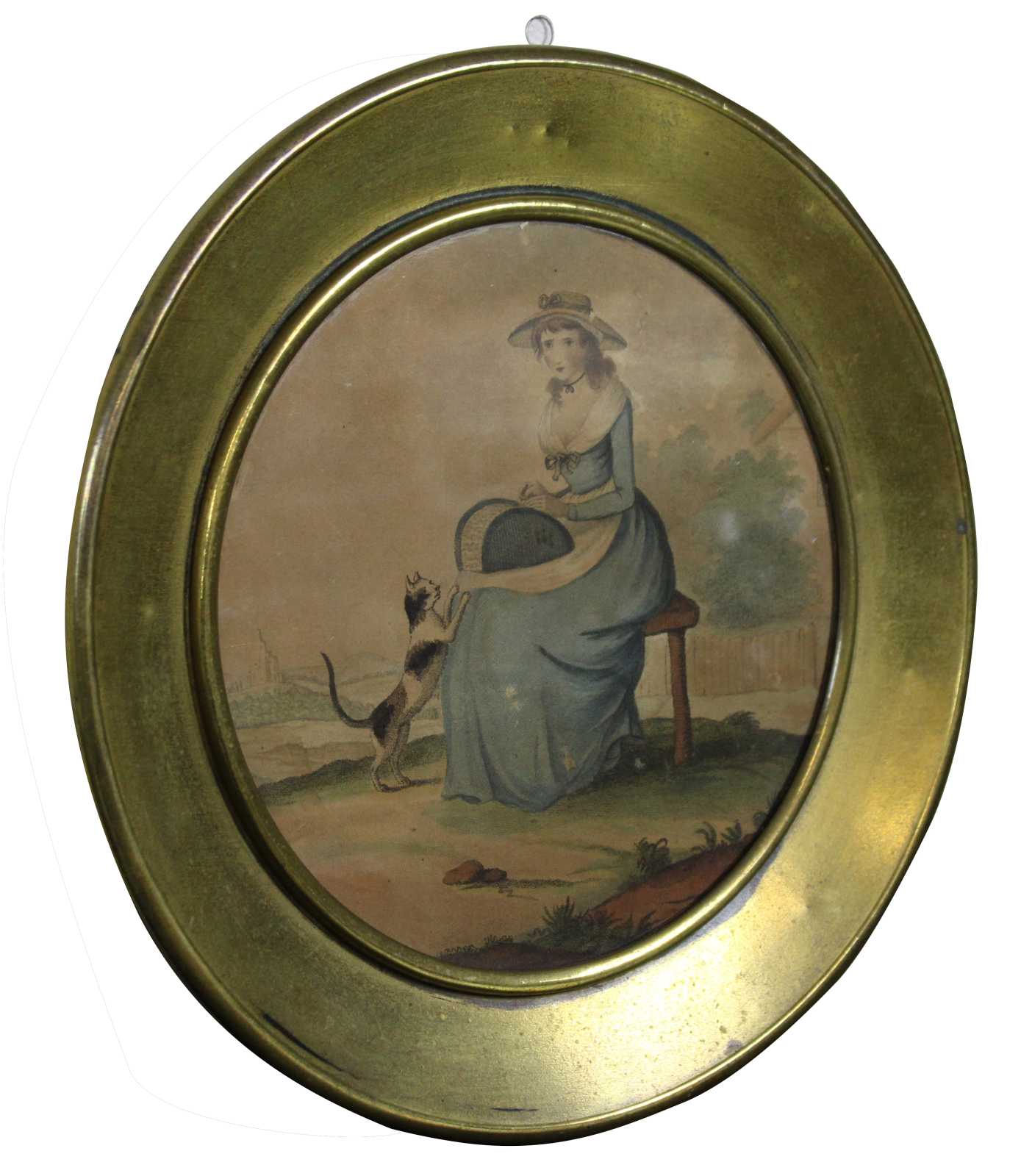 Antique colored lithograph print of an 18th century woman in a blue dress seated in a garden with a calico cat, displayed in a round brass frame.