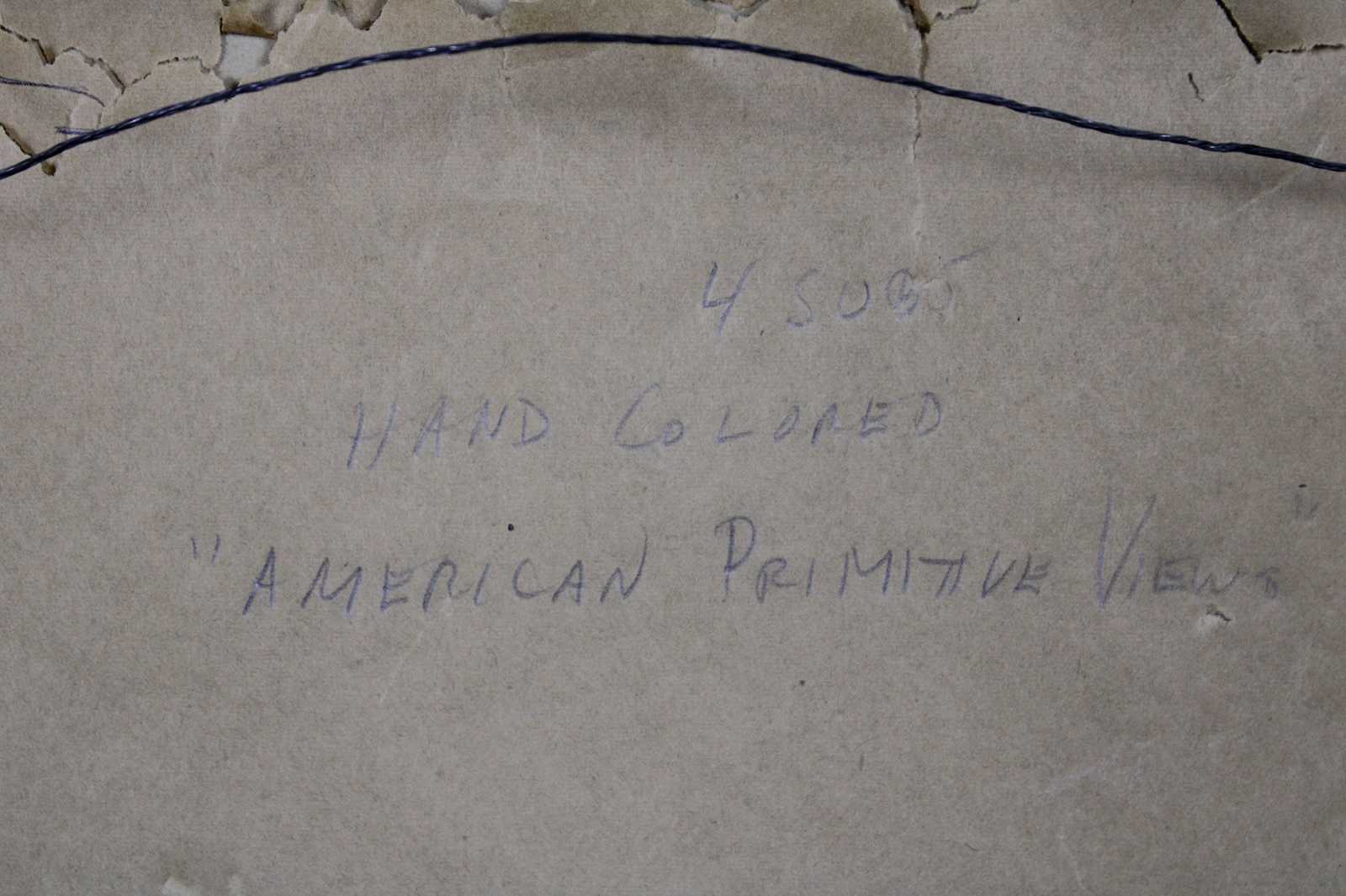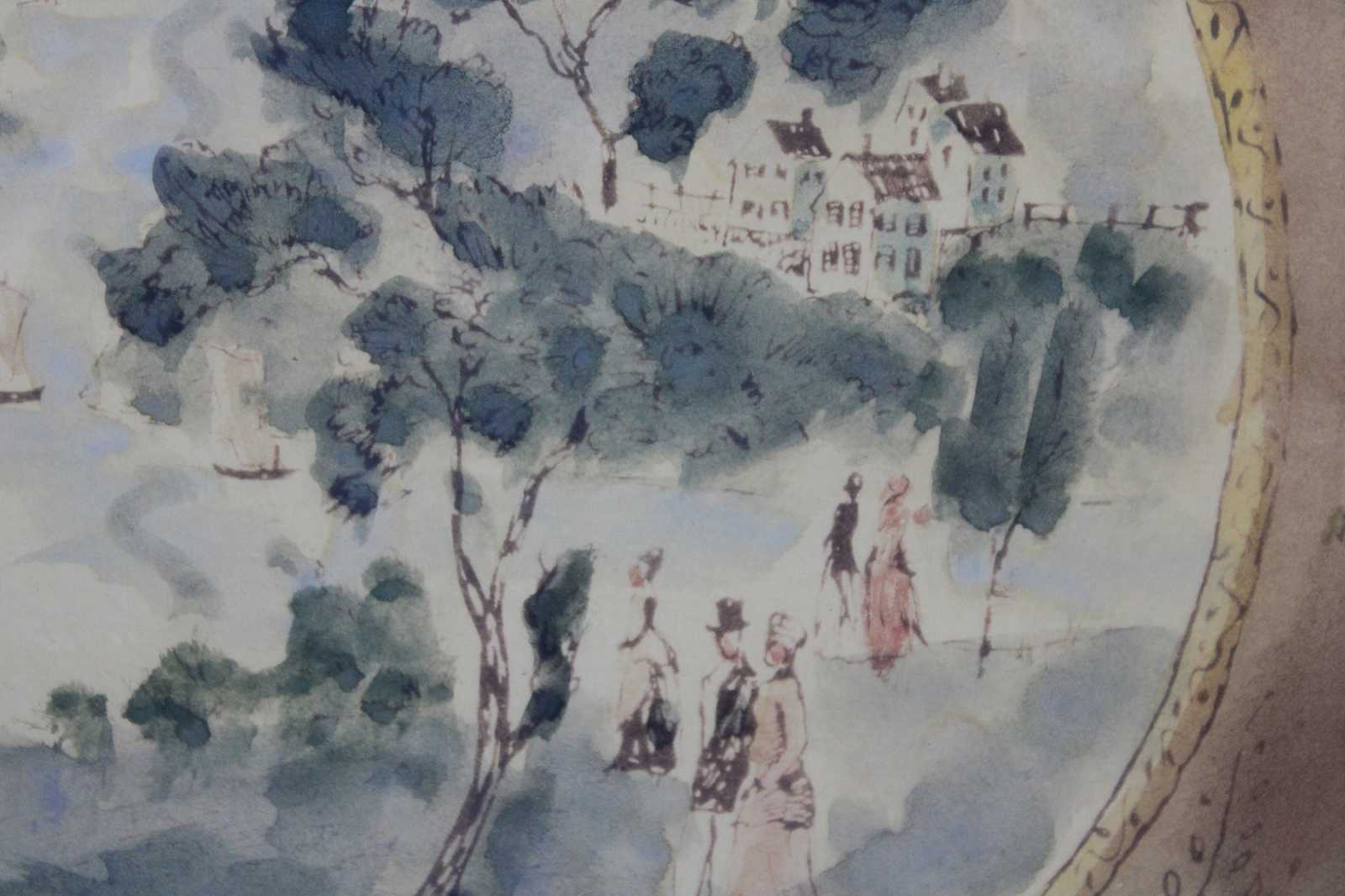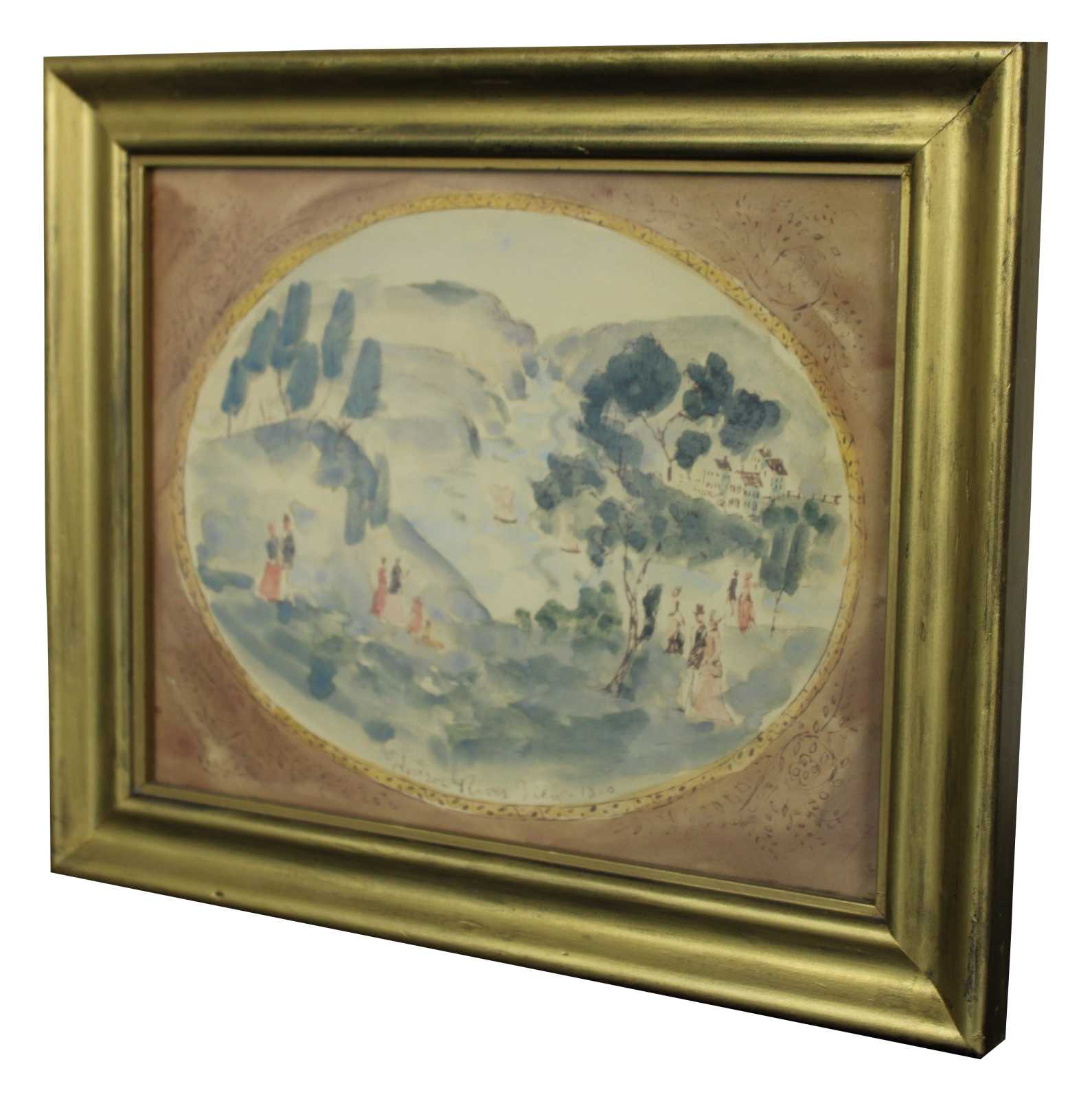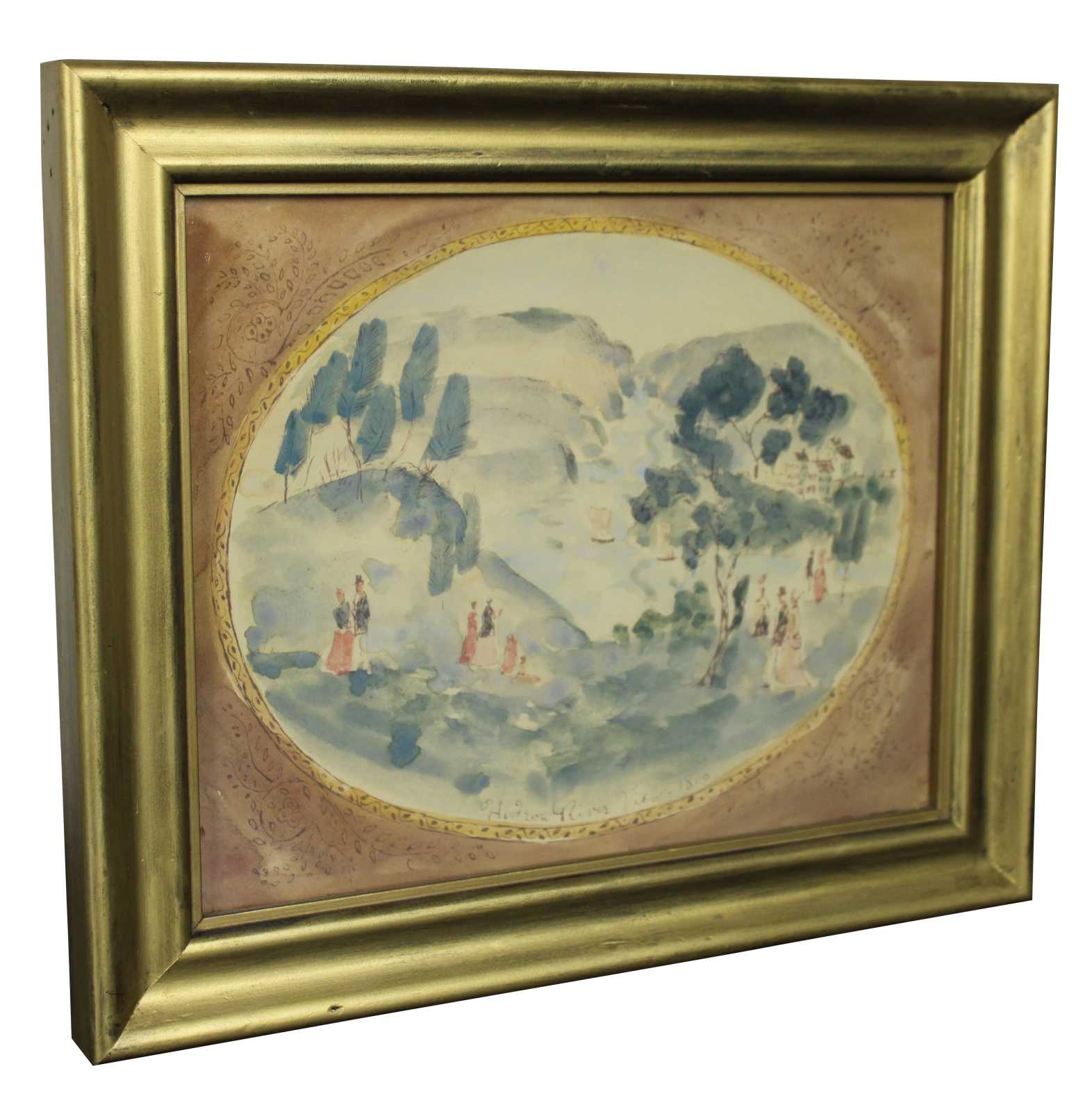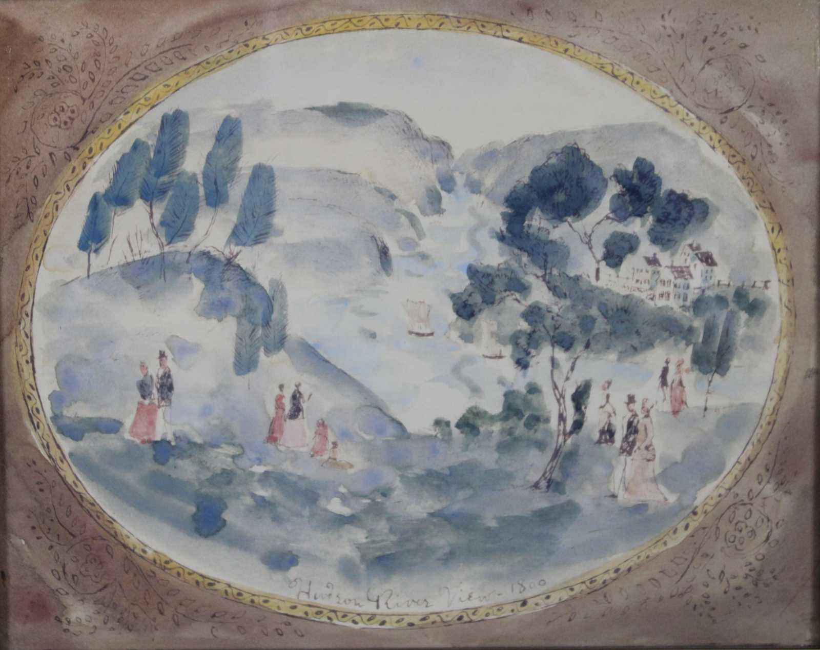 Antique hand colored print titled “Hudson River View – 1800,” showing a river valley landscape with many figures walking, and buildings and boats in the background.