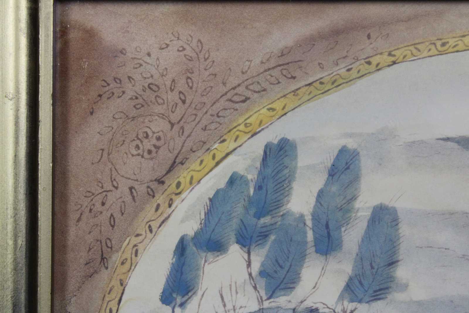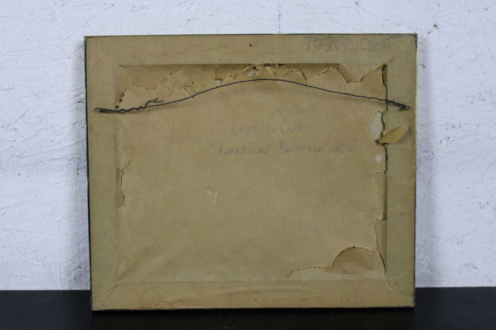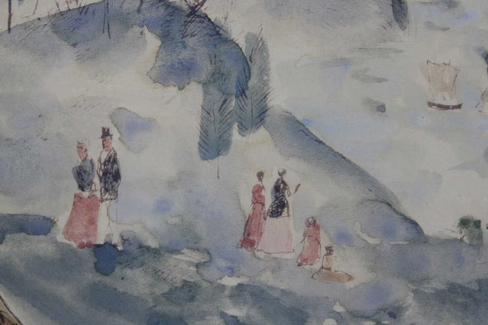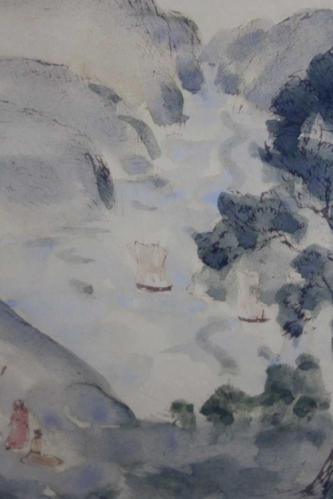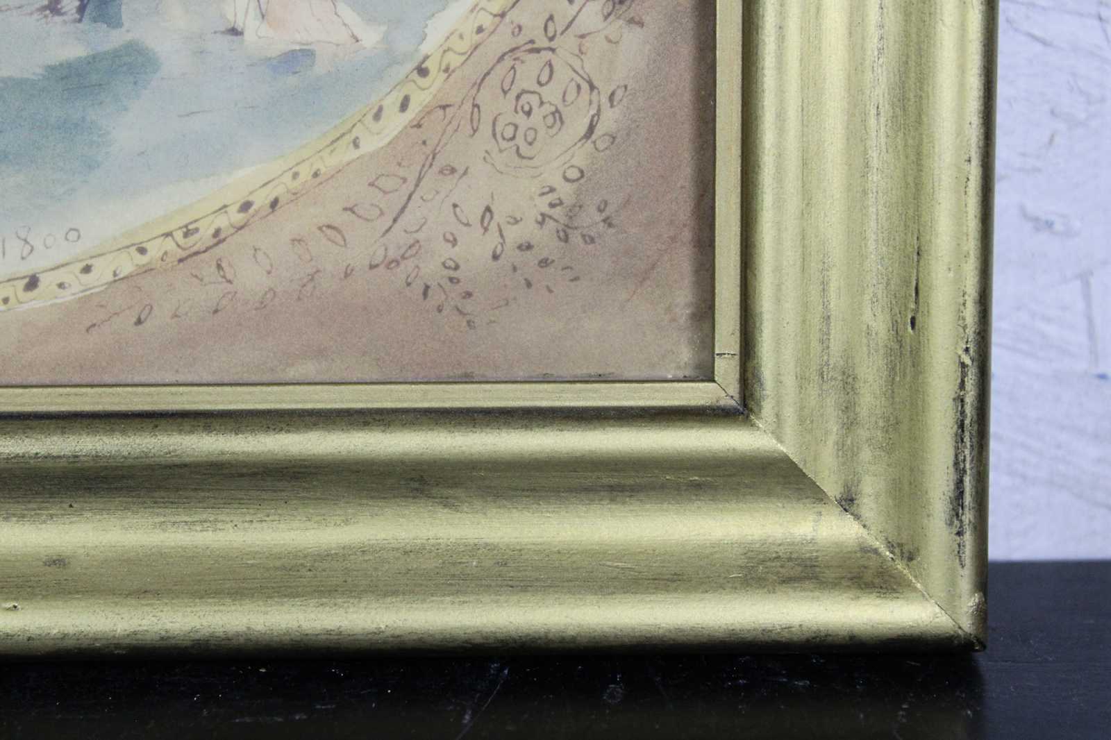 Antique hand colored print titled “Hudson River View – 1800,” showing a river valley landscape with many figures walking, and buildings and boats in the background.