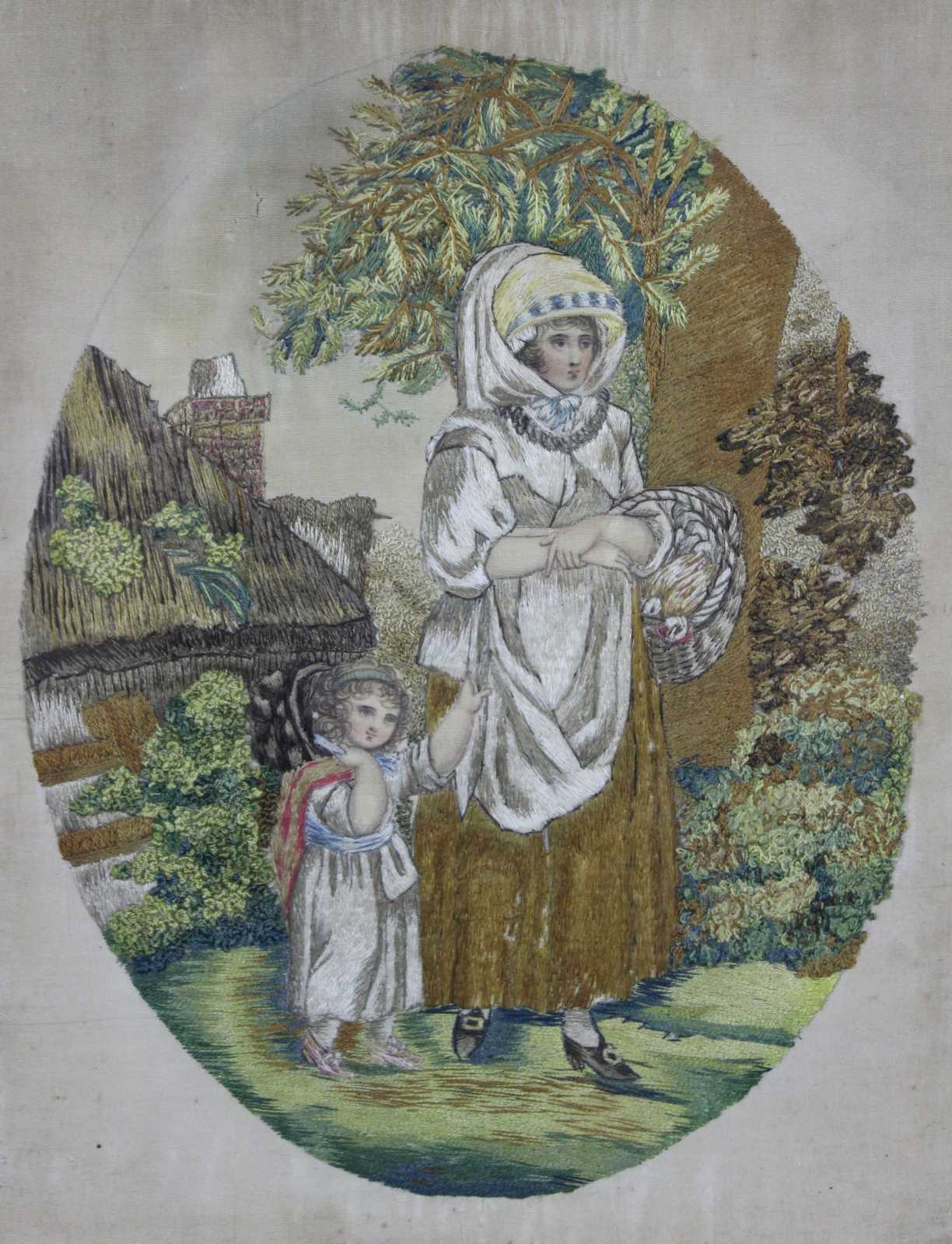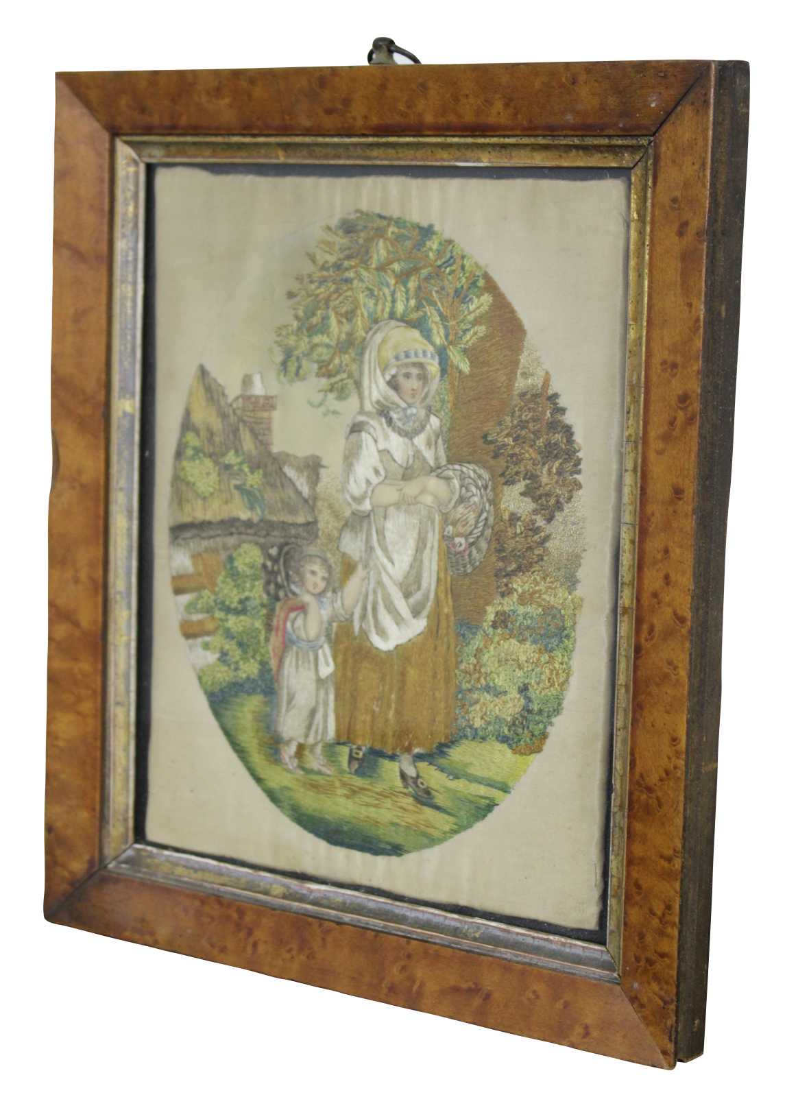Antique silk embroidered French pastoral scene of a woman and child in front of a cottage. Beautifully framed in a burlwood setting.