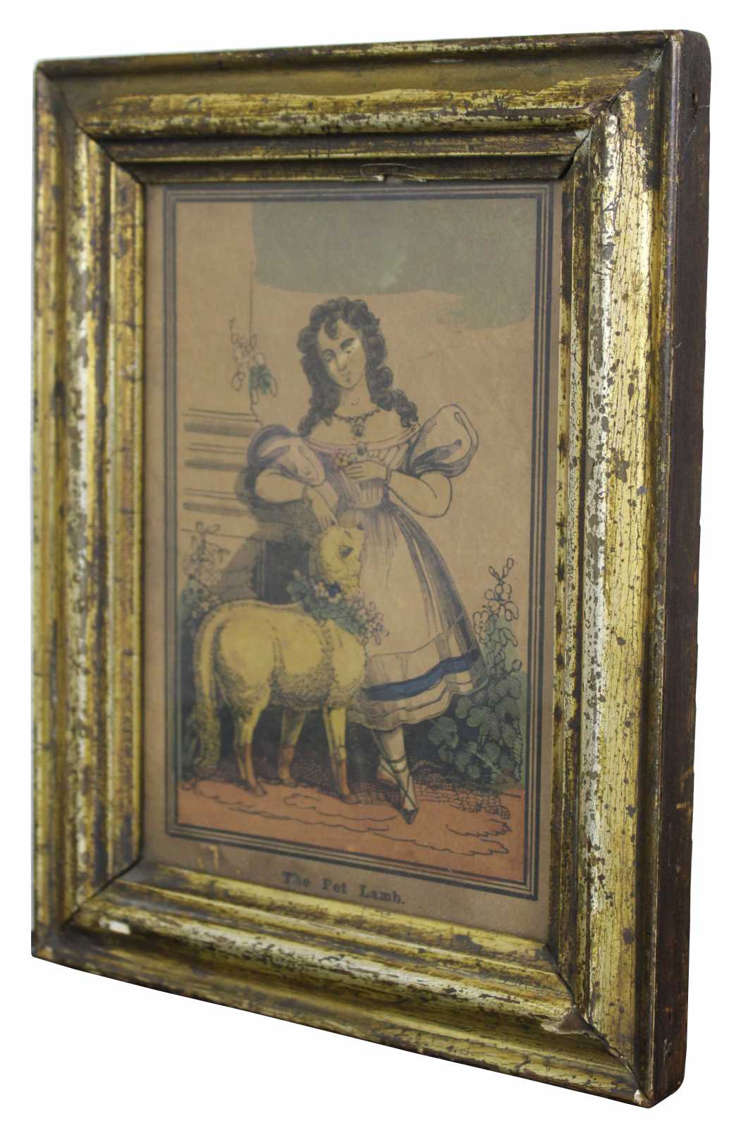 Early 19th century hand colored engraving titled “The Pet Lamb” showing a young girl in a party dress with a lamb wearing a wreath of flowers.