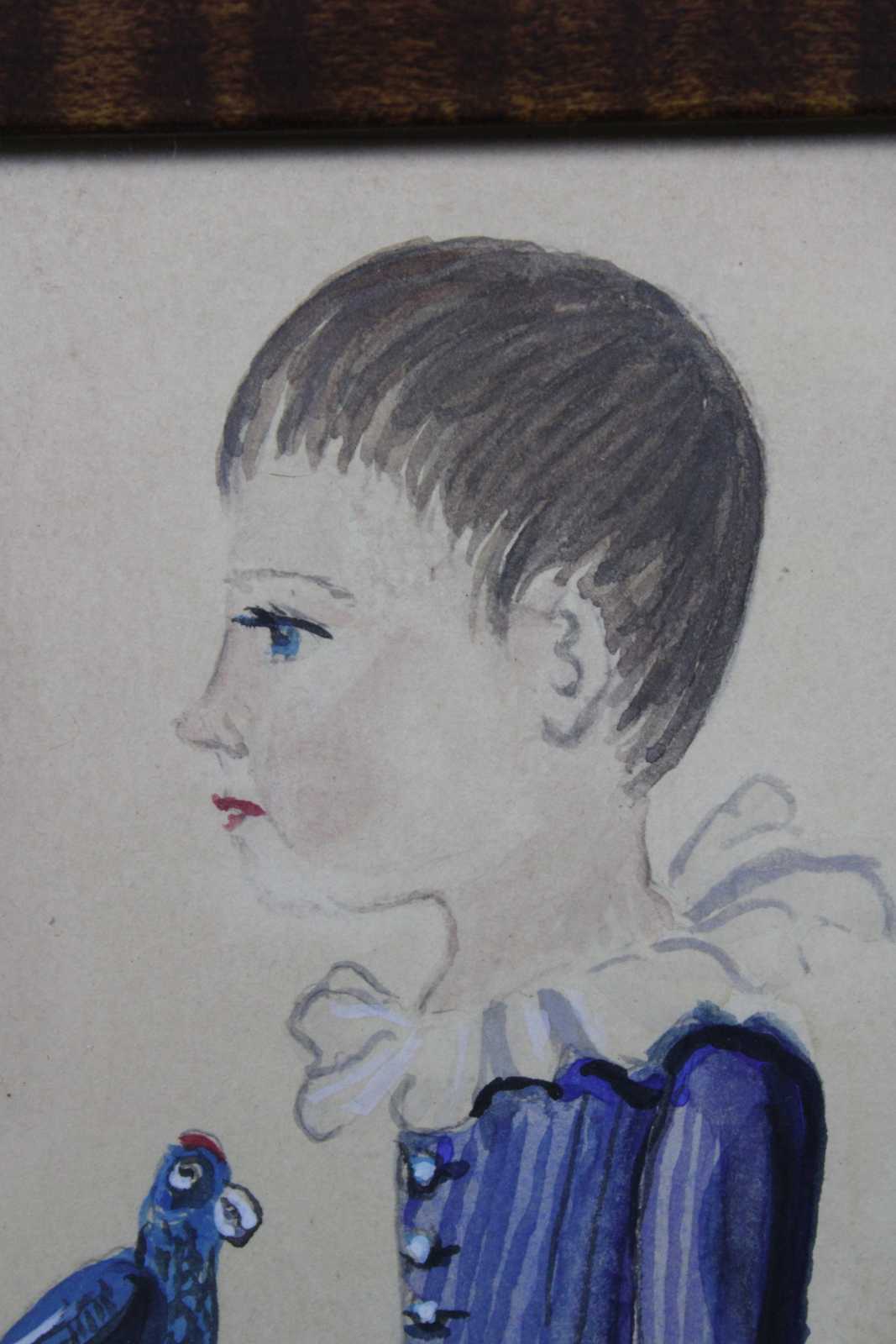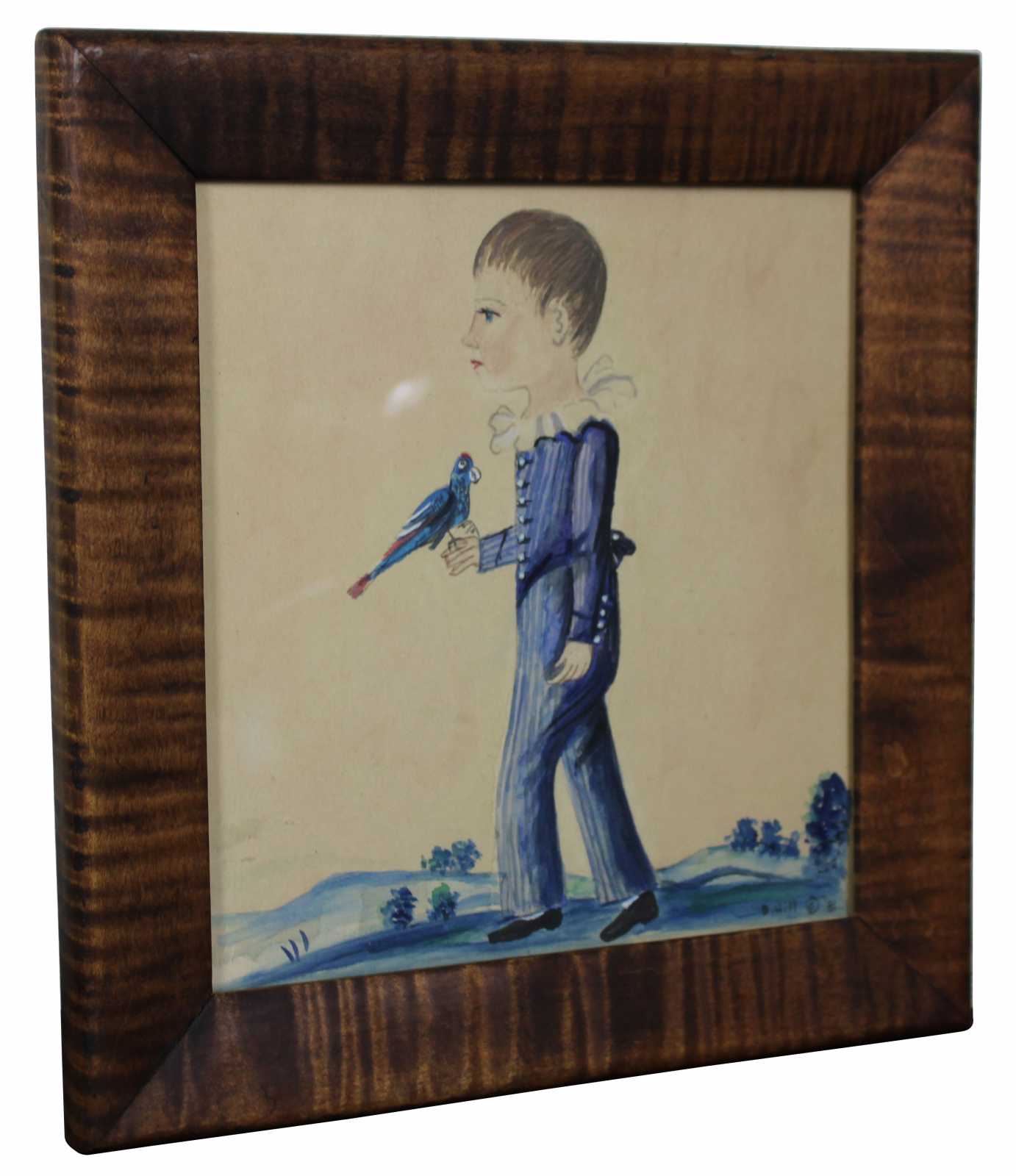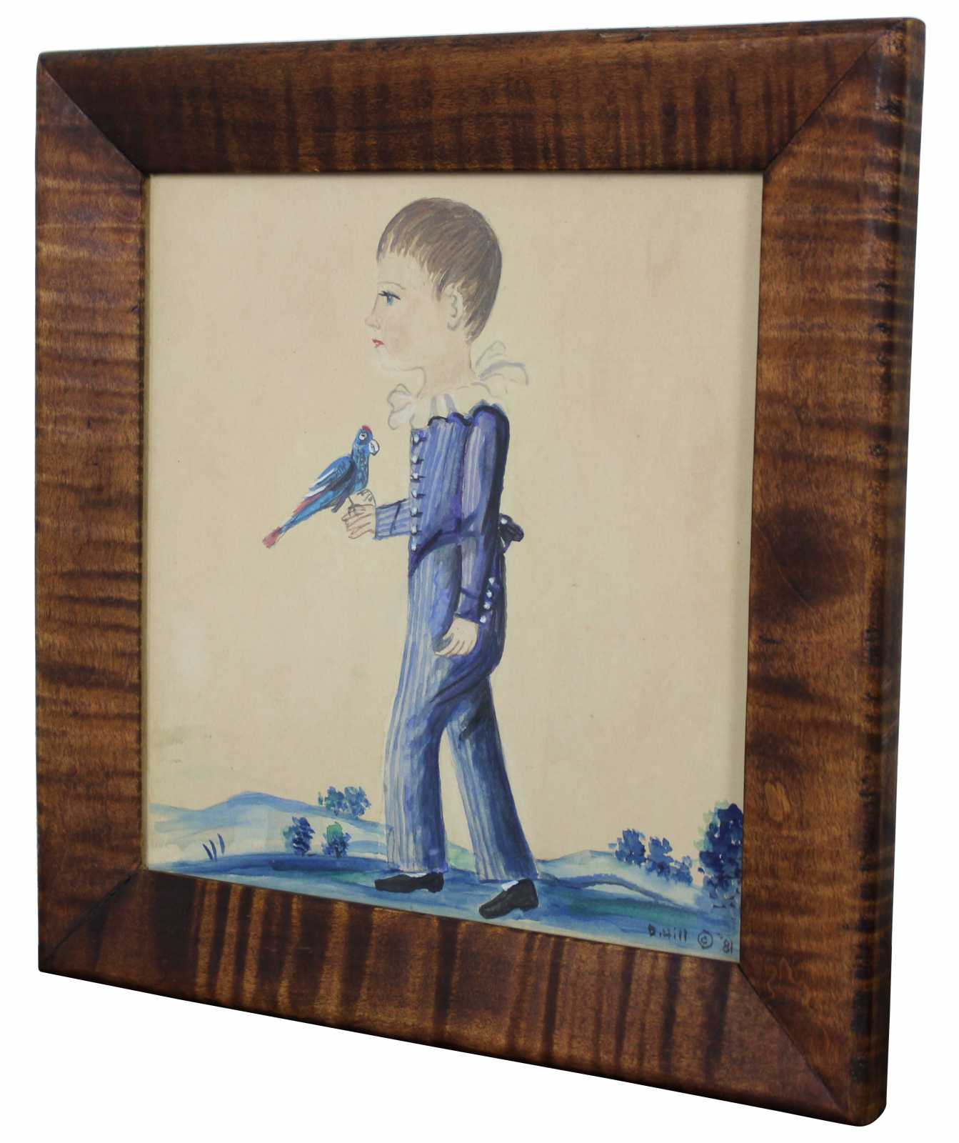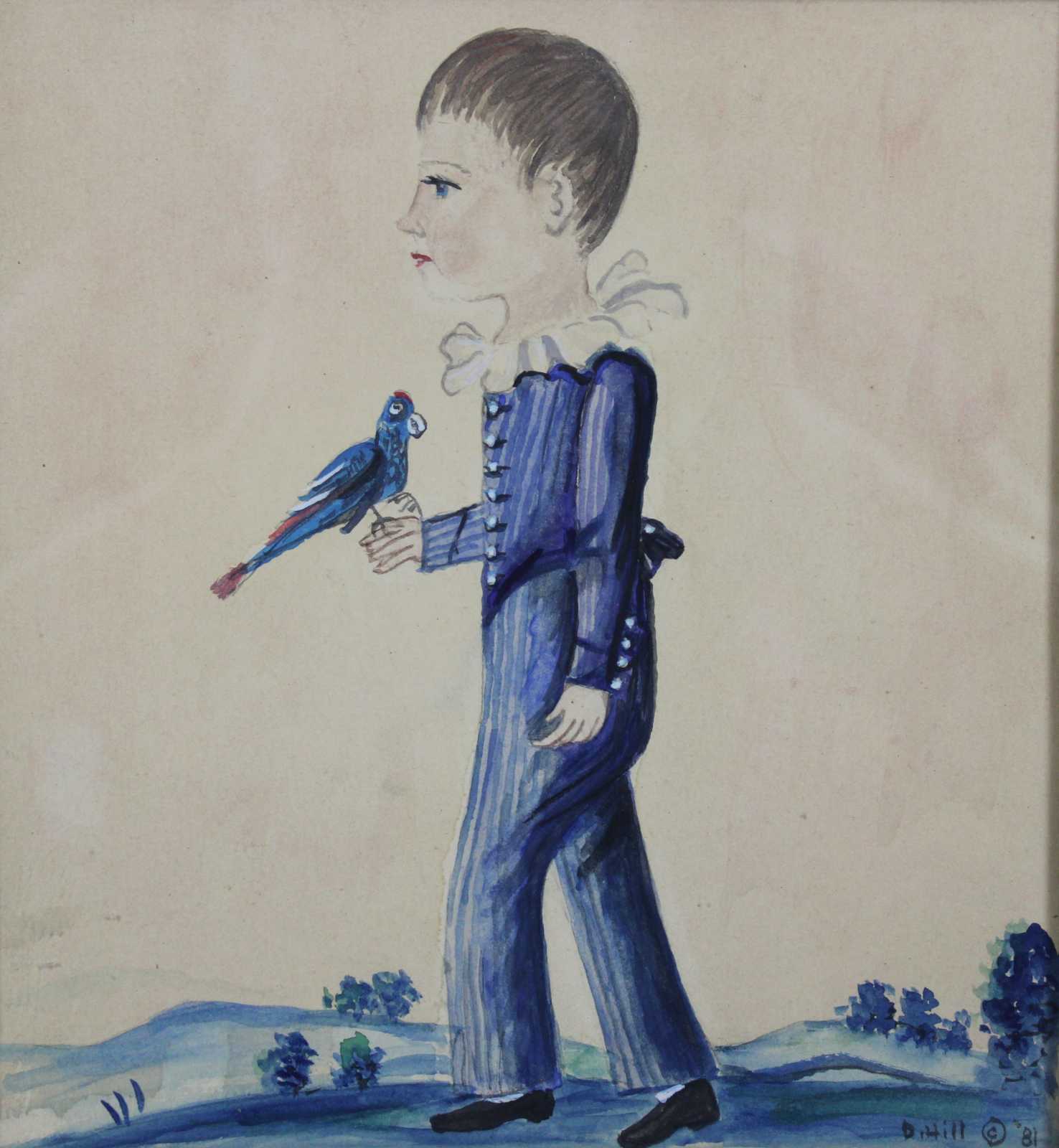Vintage 1981 folk art style watercolor portrait painting of a young boy in blue holding a blue bird or parrot. Signed D. Hill in lower right corner.