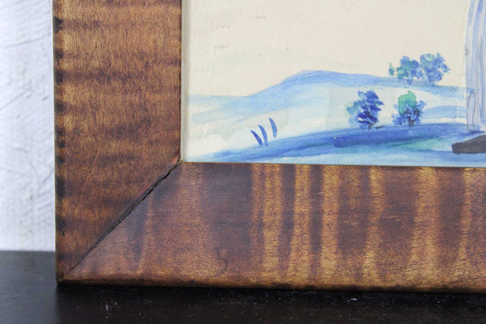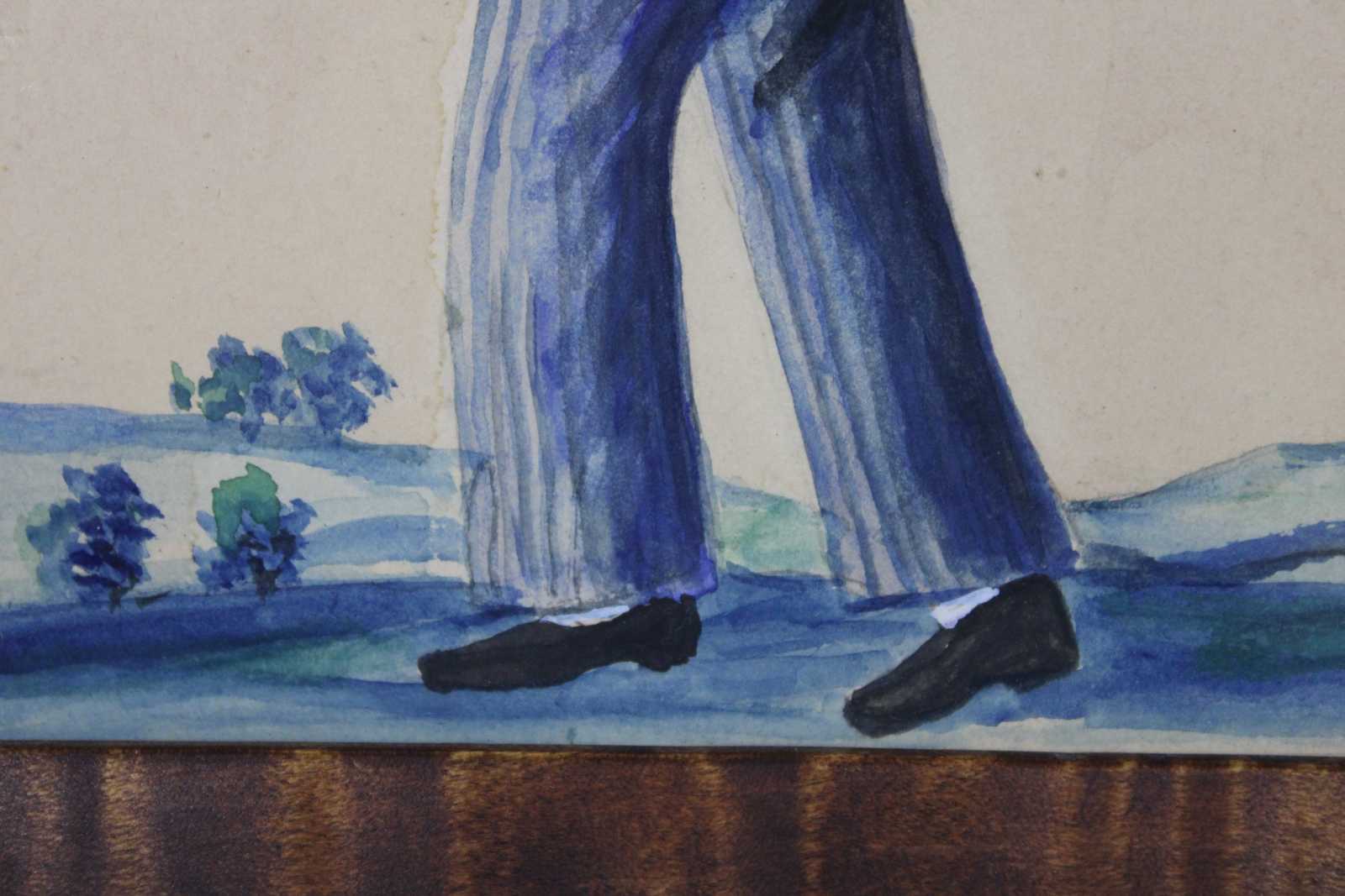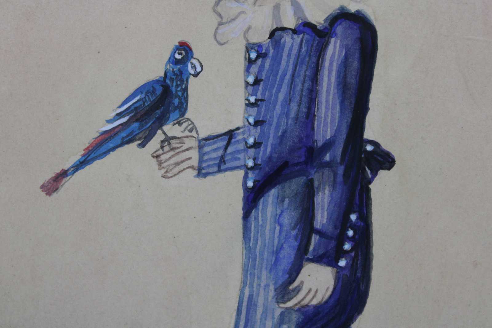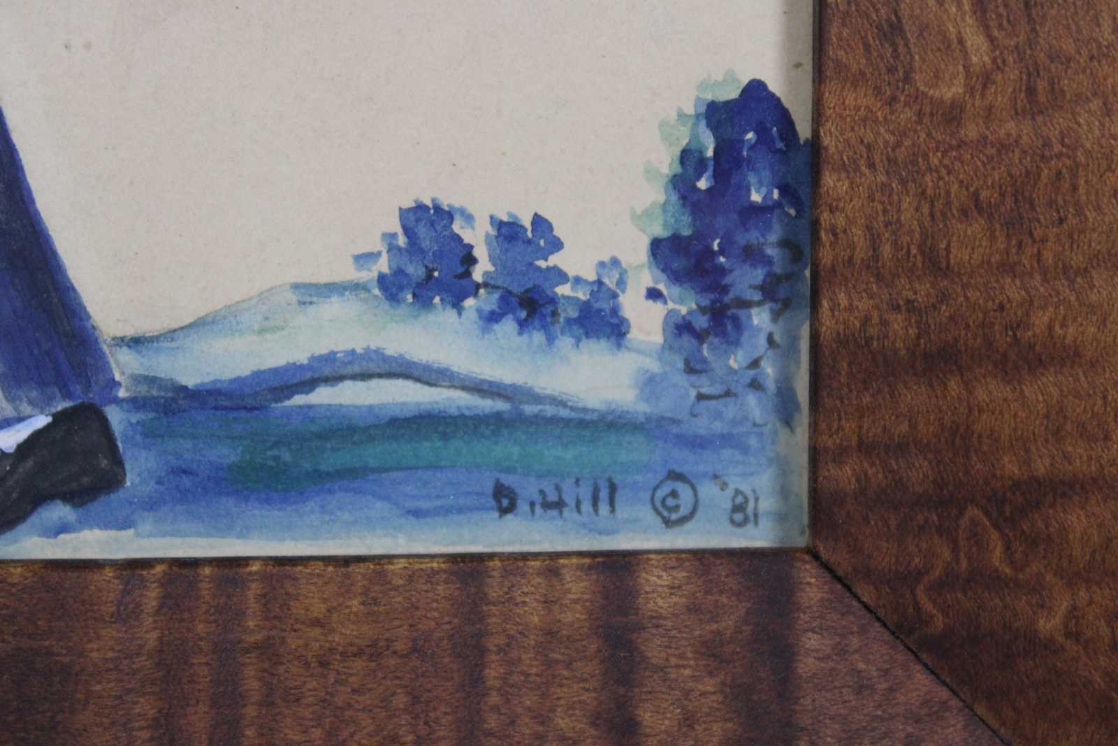 Vintage 1981 folk art style watercolor portrait painting of a young boy in blue holding a blue bird or parrot. Signed D. Hill in lower right corner.