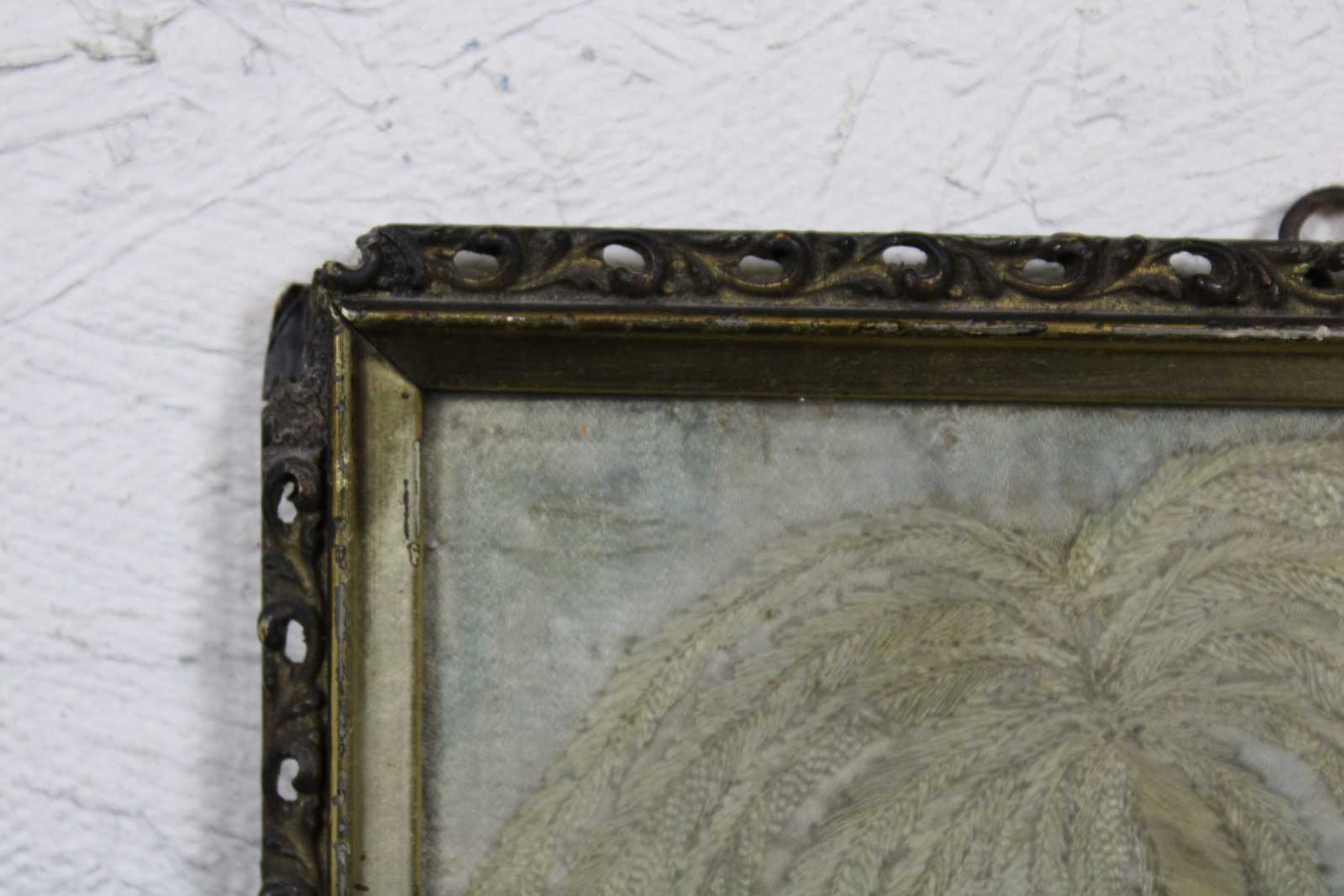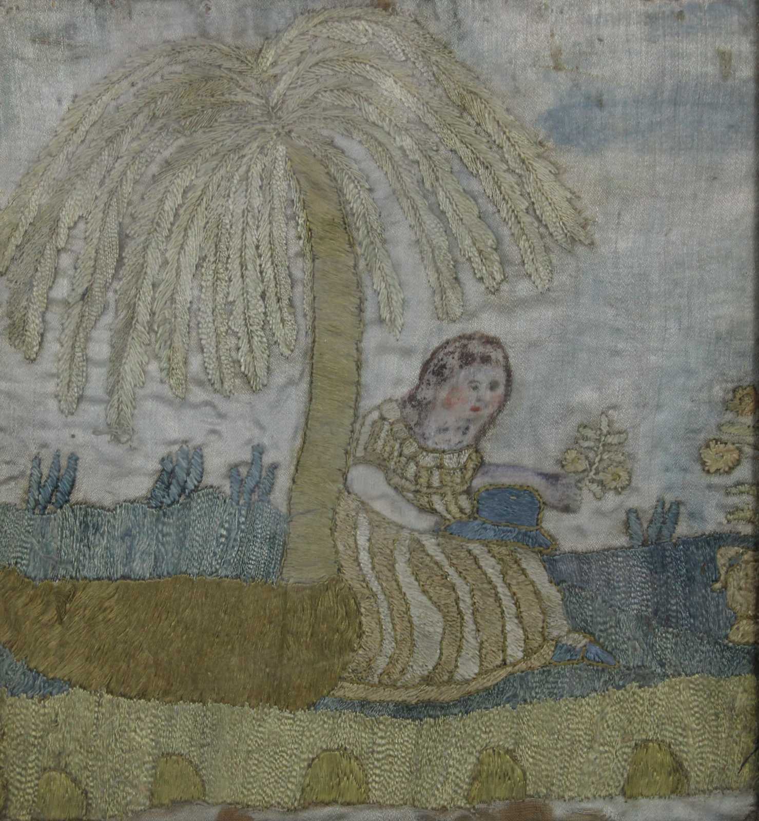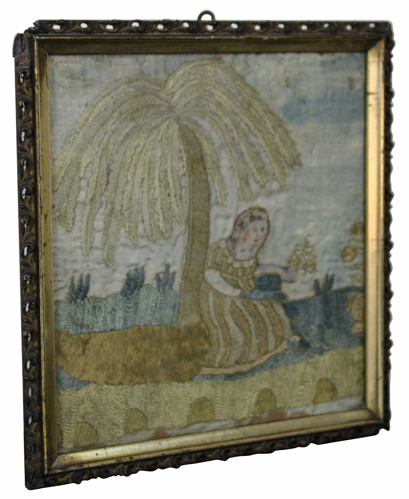 Antique Victorian needlepoint folk art embroidered scene showing a girl seated beneath a willow or palm tree with a hat in her lap. Framed in an ornate gold gilded French reticulated frame.