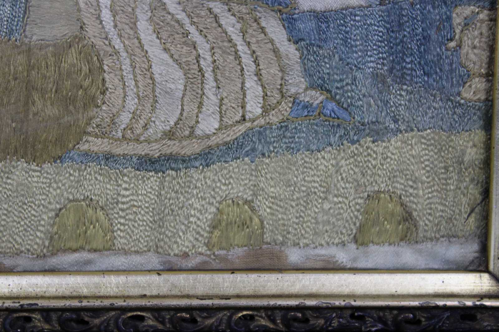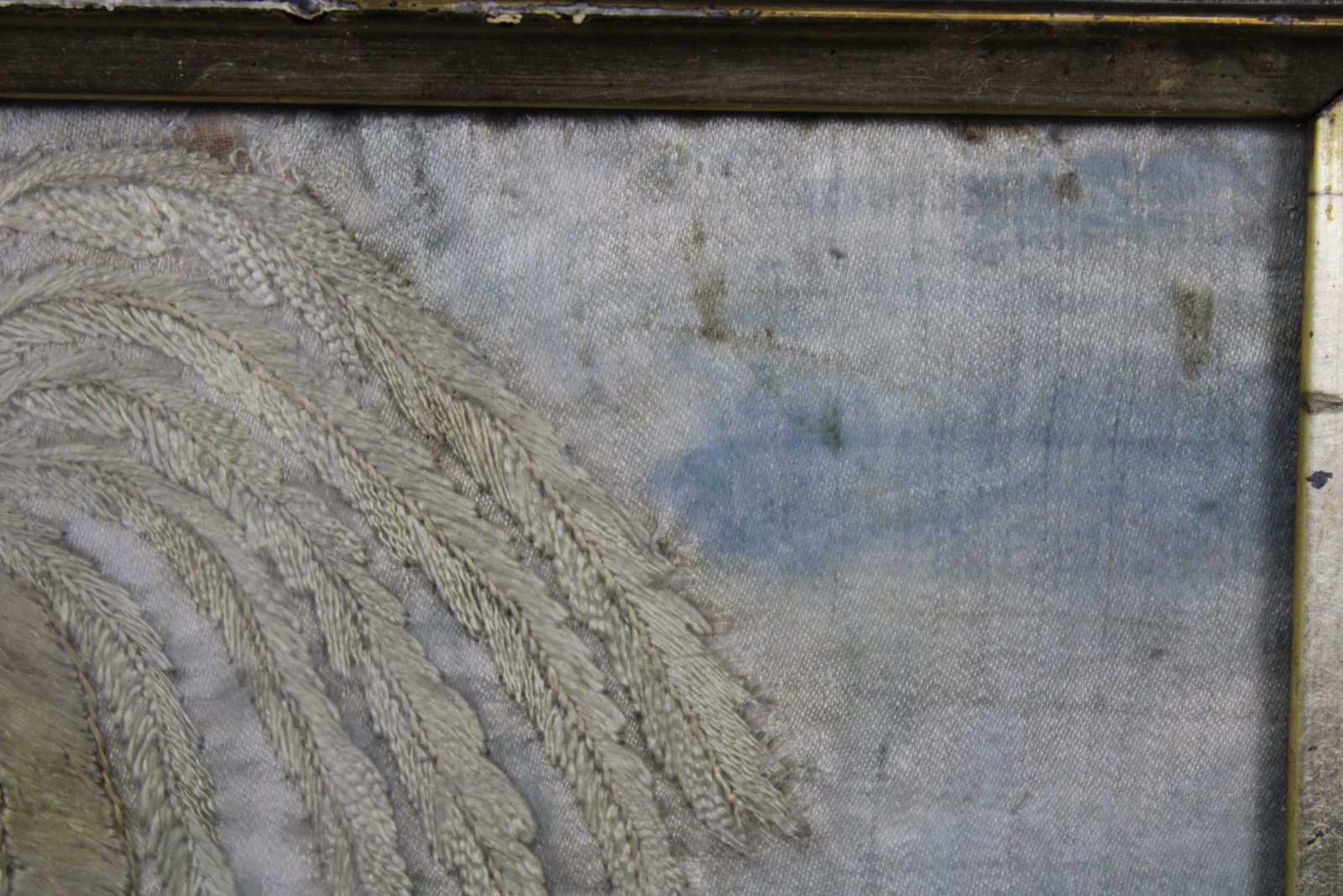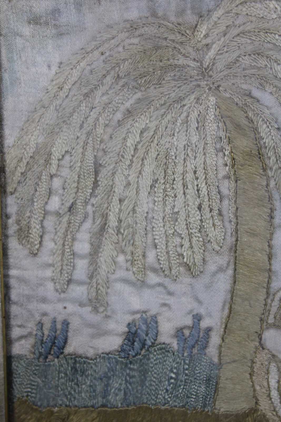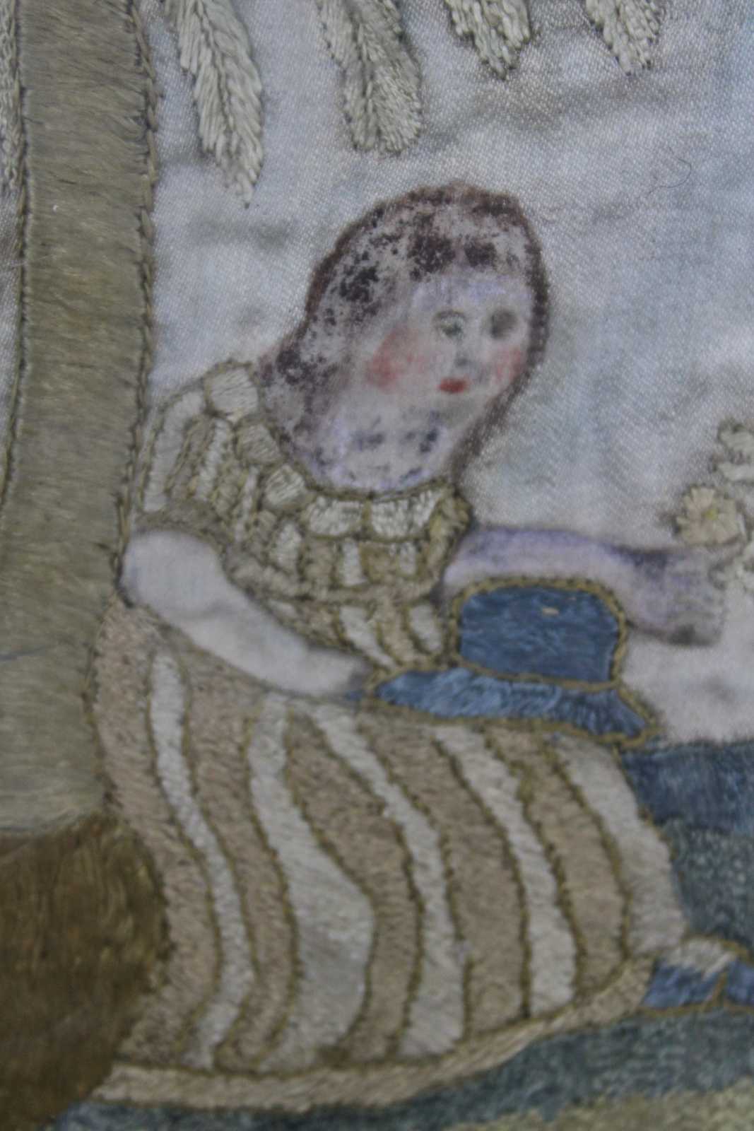 Antique Victorian needlepoint folk art embroidered scene showing a girl seated beneath a willow or palm tree with a hat in her lap. Framed in an ornate gold gilded French reticulated frame.
