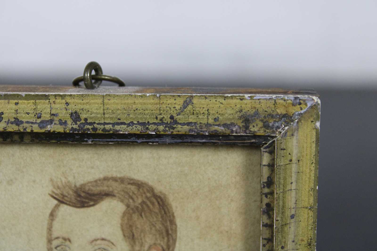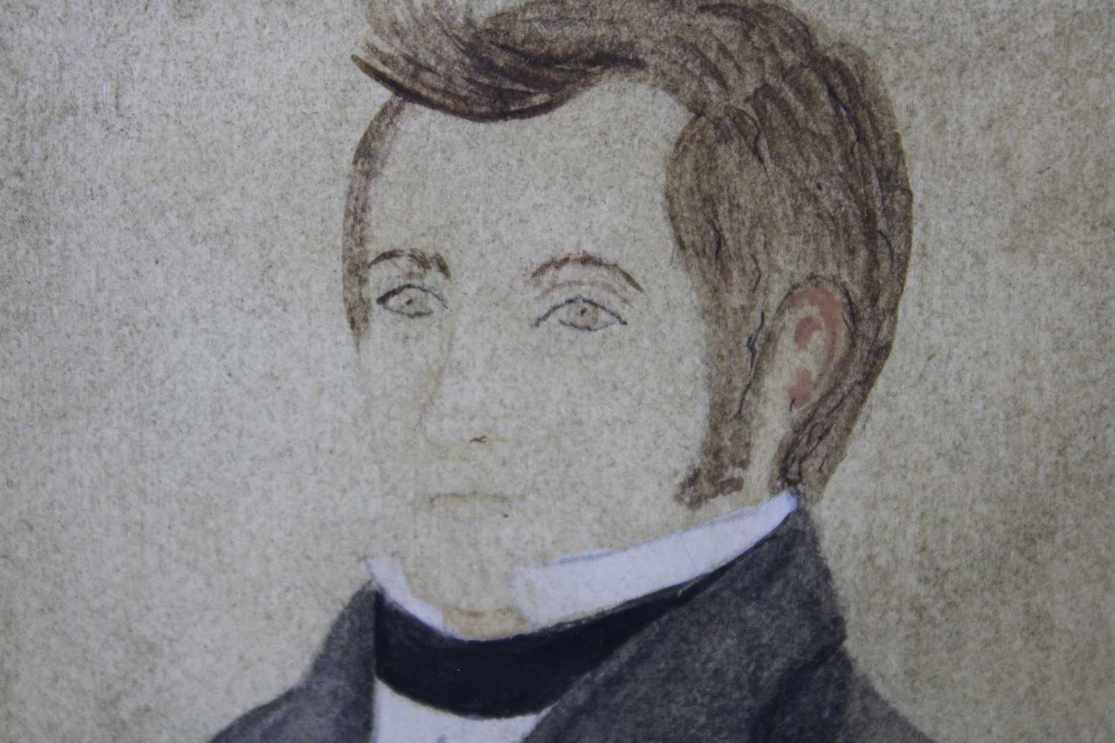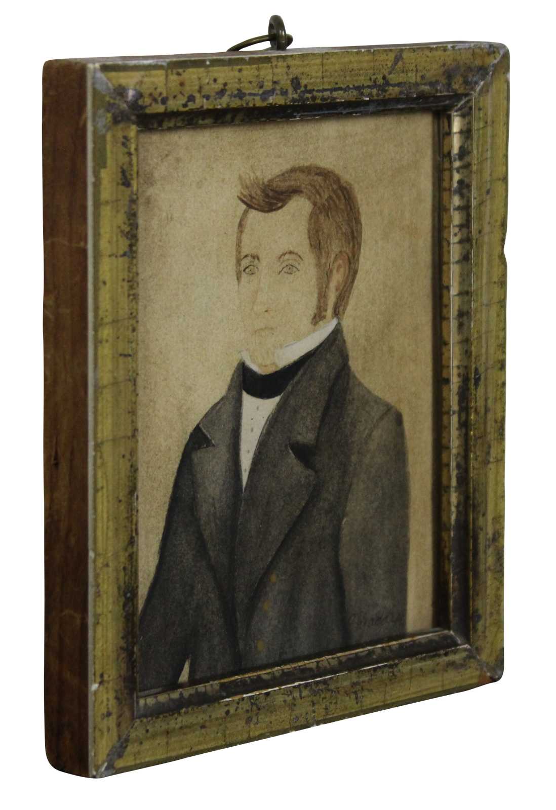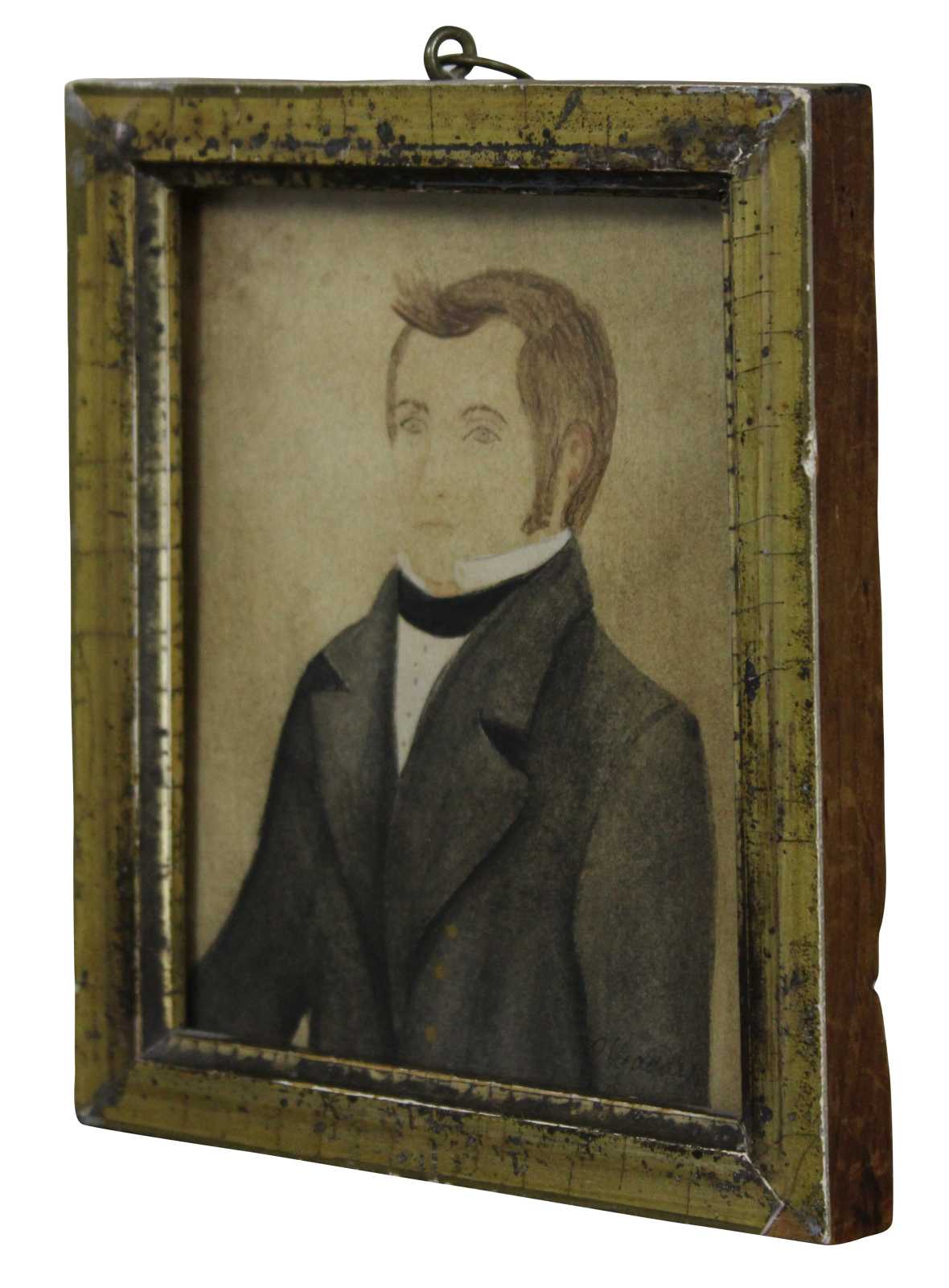 Fine antique American Victorian miniature watercolor portrait painting of a young man / gentleman in formal attire, framed, signed in the lower right corner.