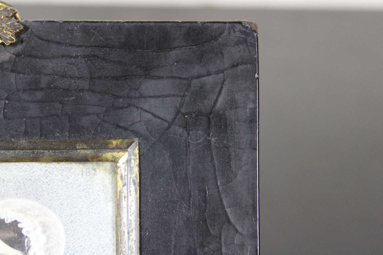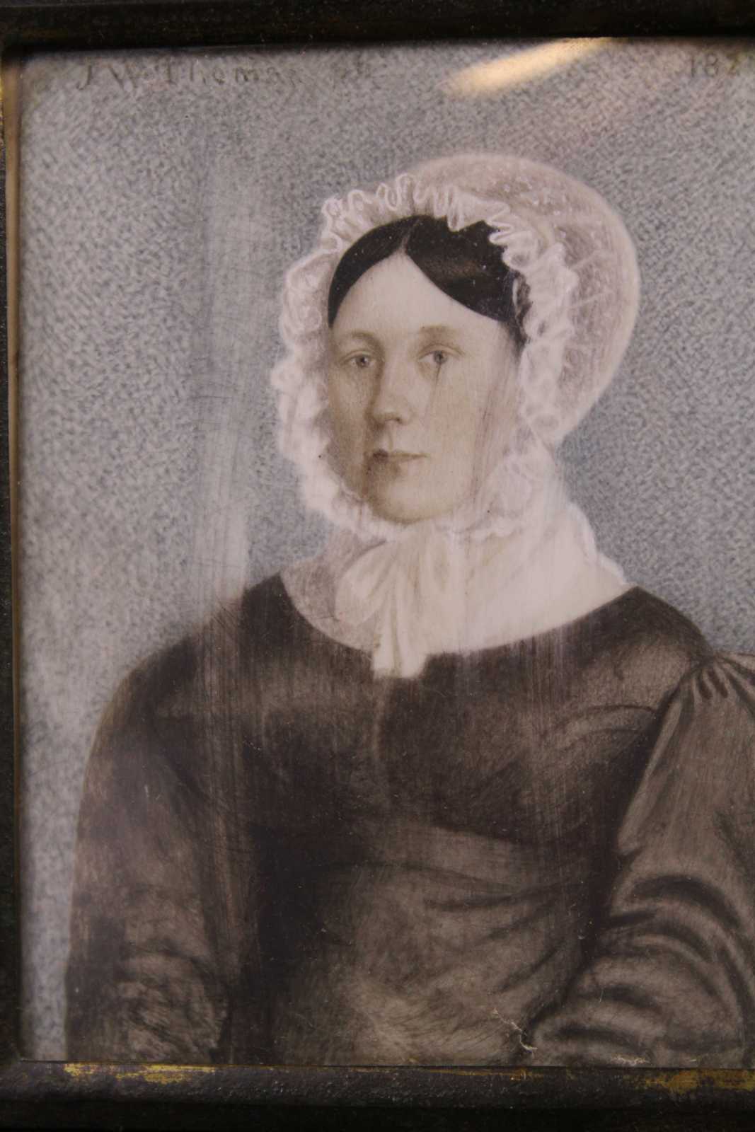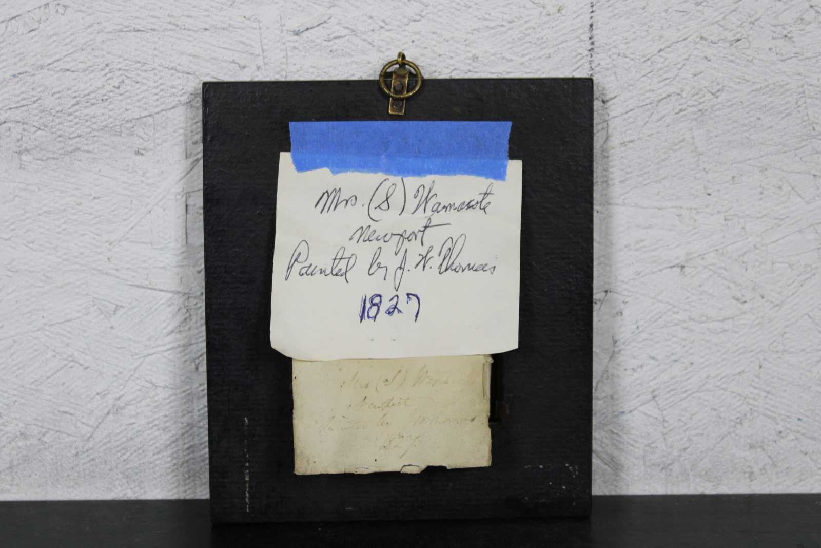 Antique miniature portrait painting showing a woman in a modest black dress and white lace bonnet, a Mrs. S. Wamacote of Newport, painted by J.W. Thomas, 1827.