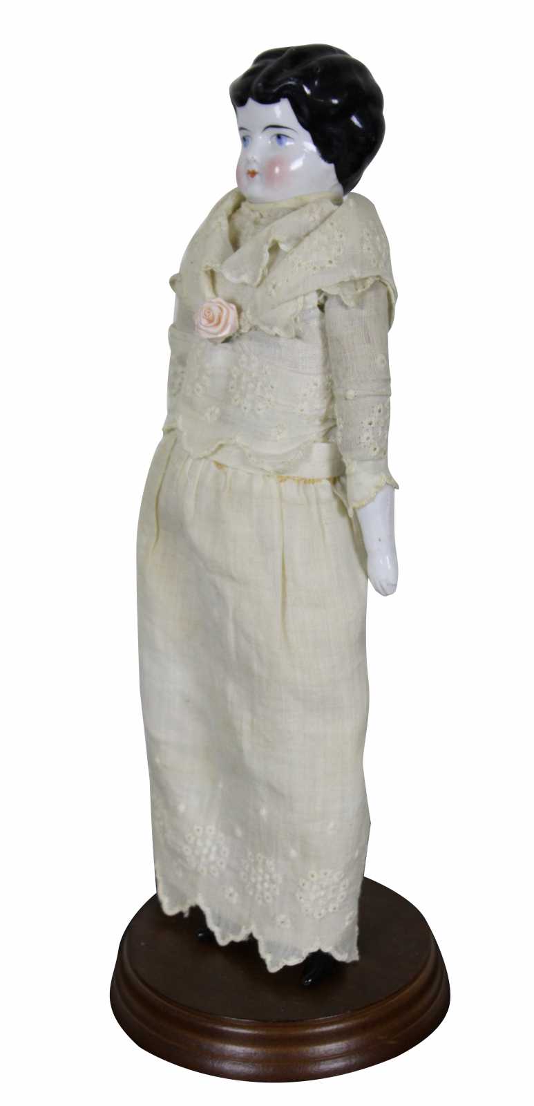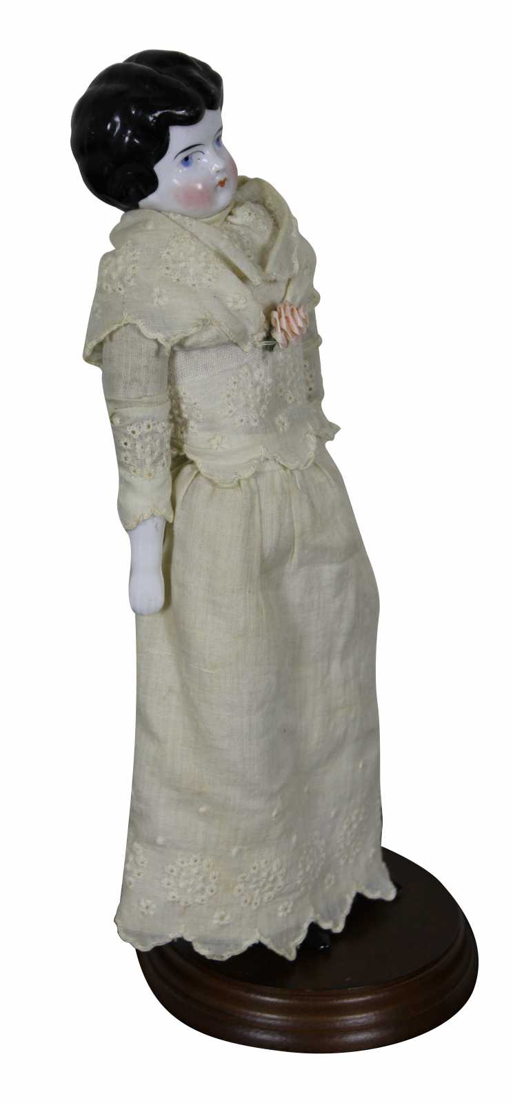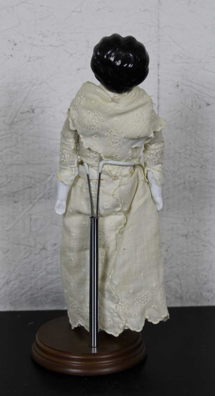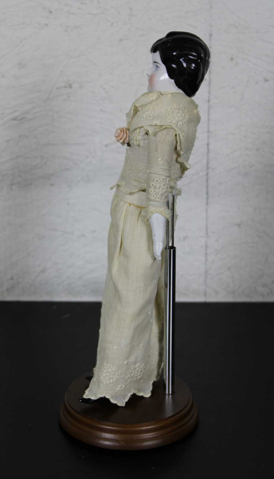Antique 19th century German china head doll with black hair and blue eyes, dressed in a well kept lace dress with rose; displayed on a contemporary doll stand.