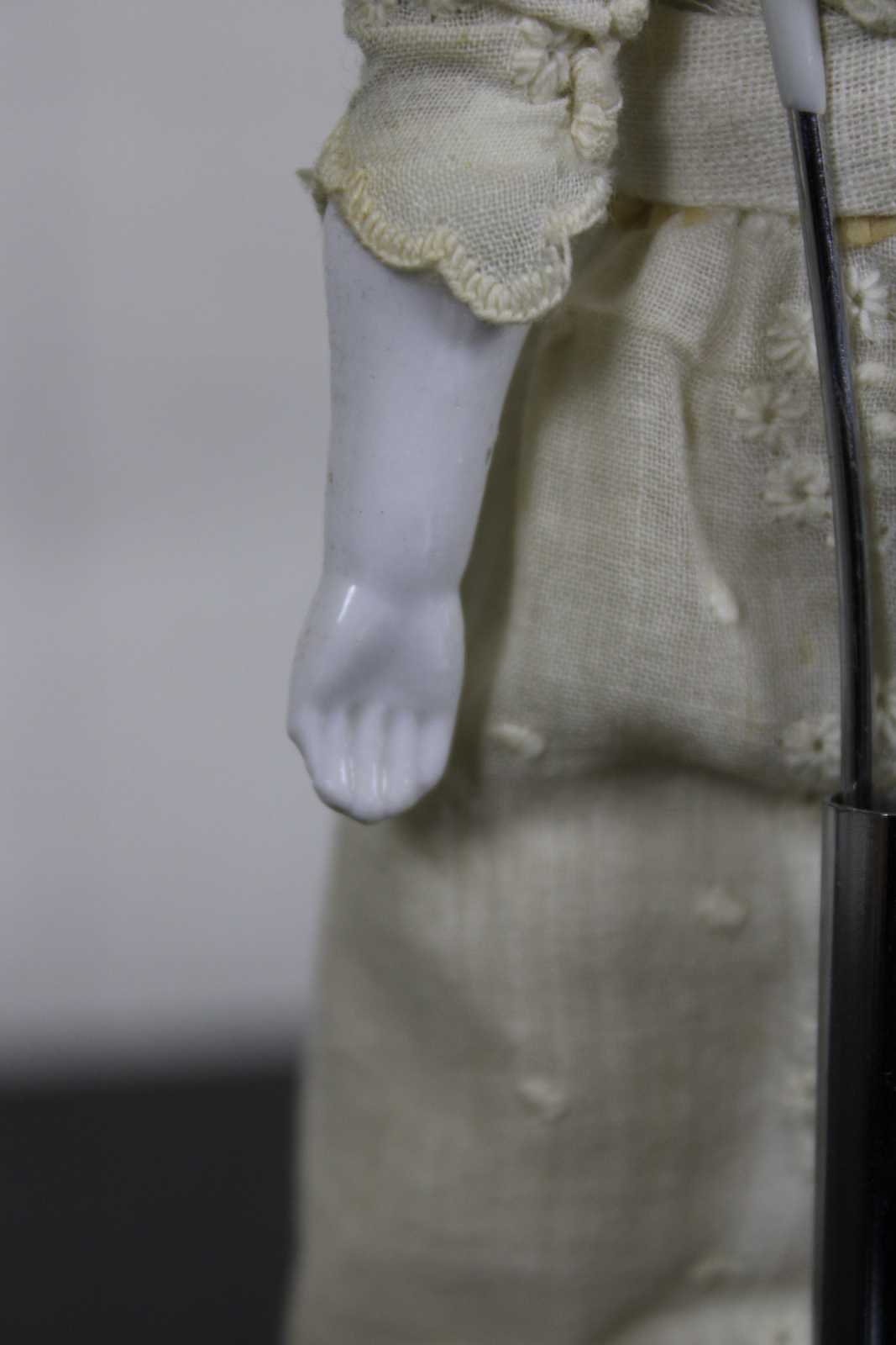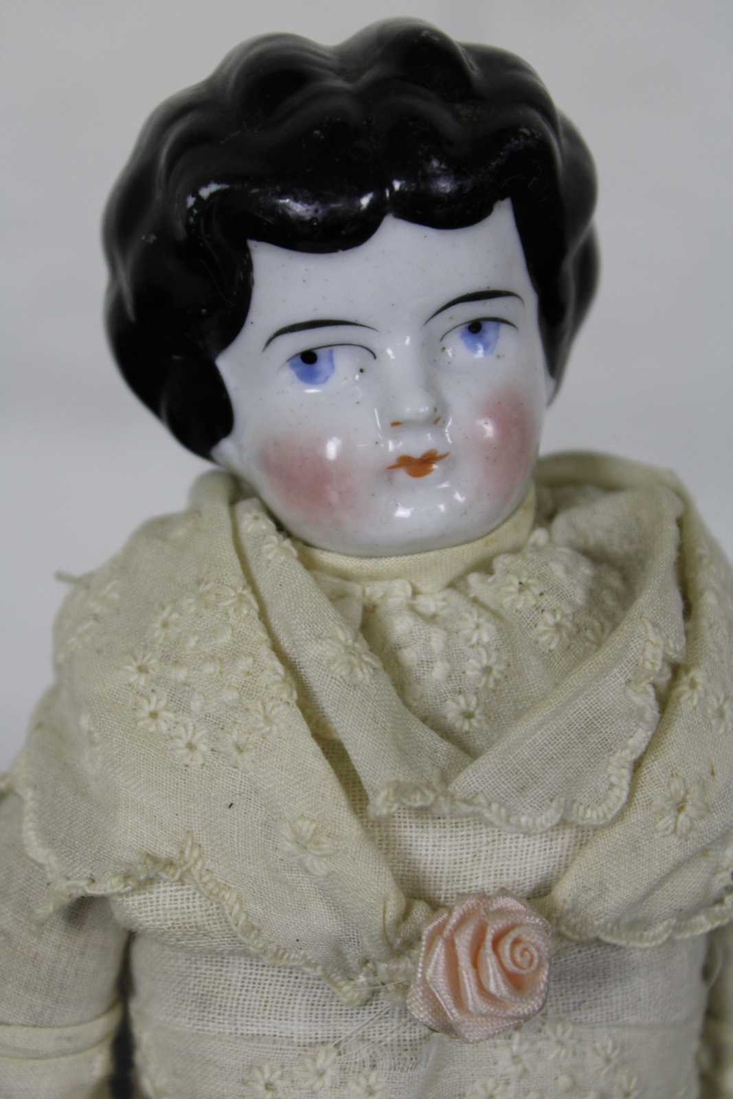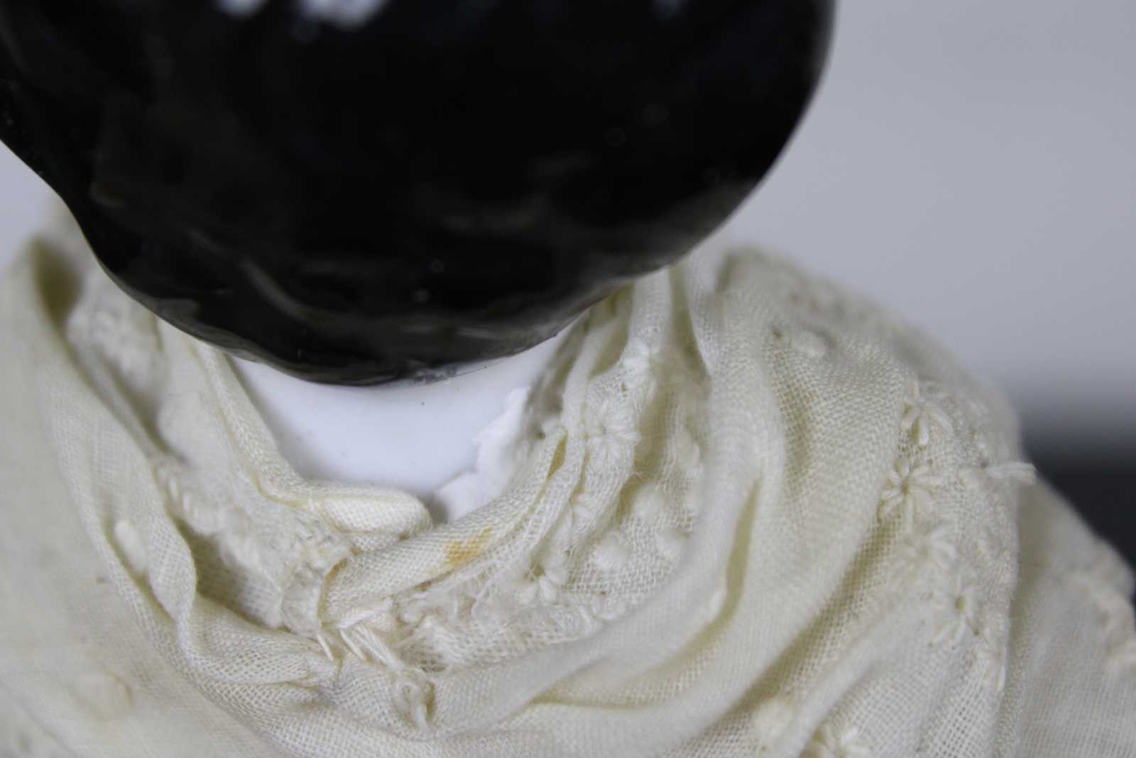 Antique 19th century German china head doll with black hair and blue eyes, dressed in a well kept lace dress with rose; displayed on a contemporary doll stand.