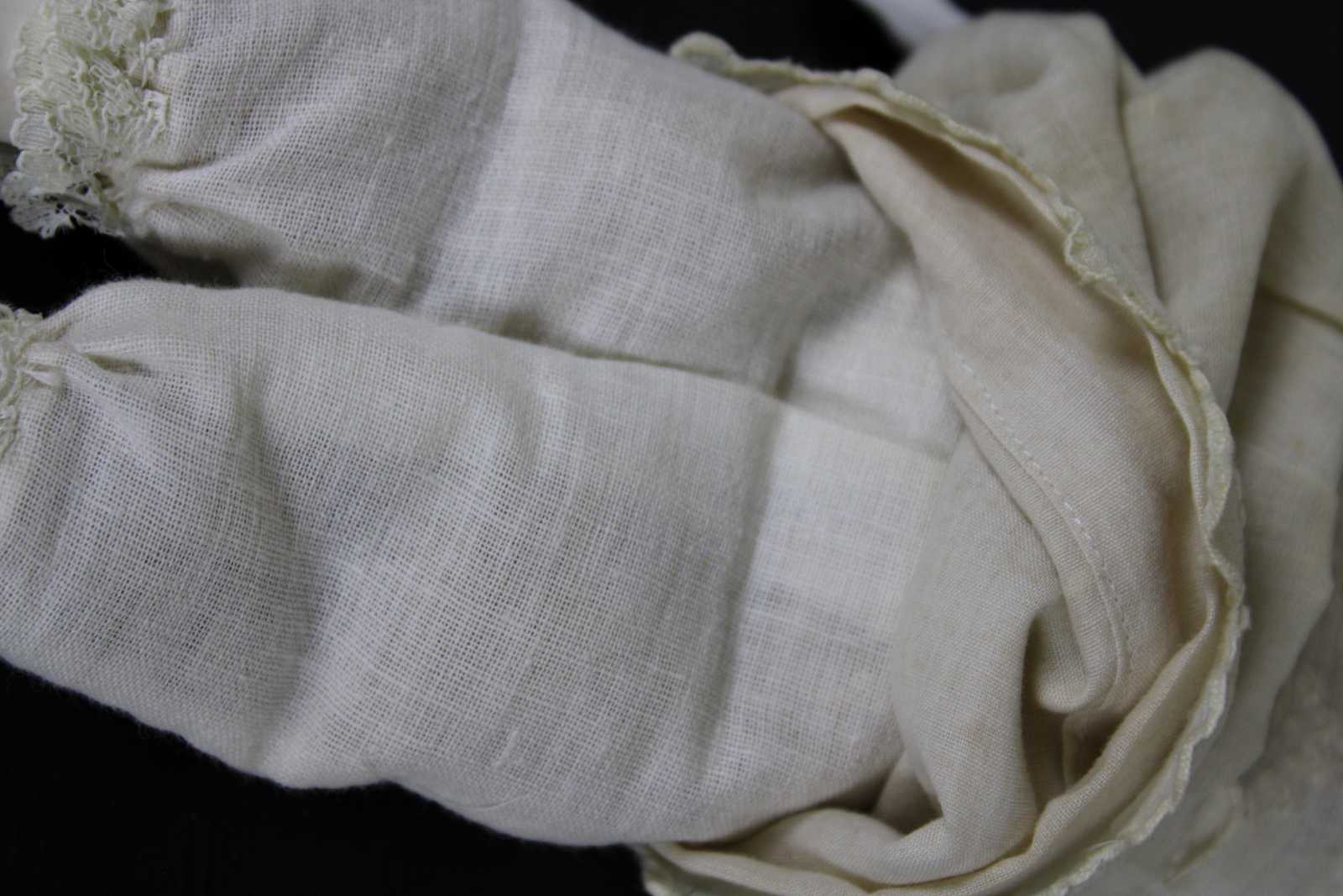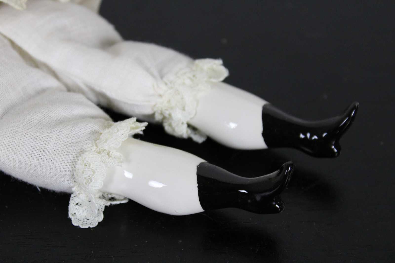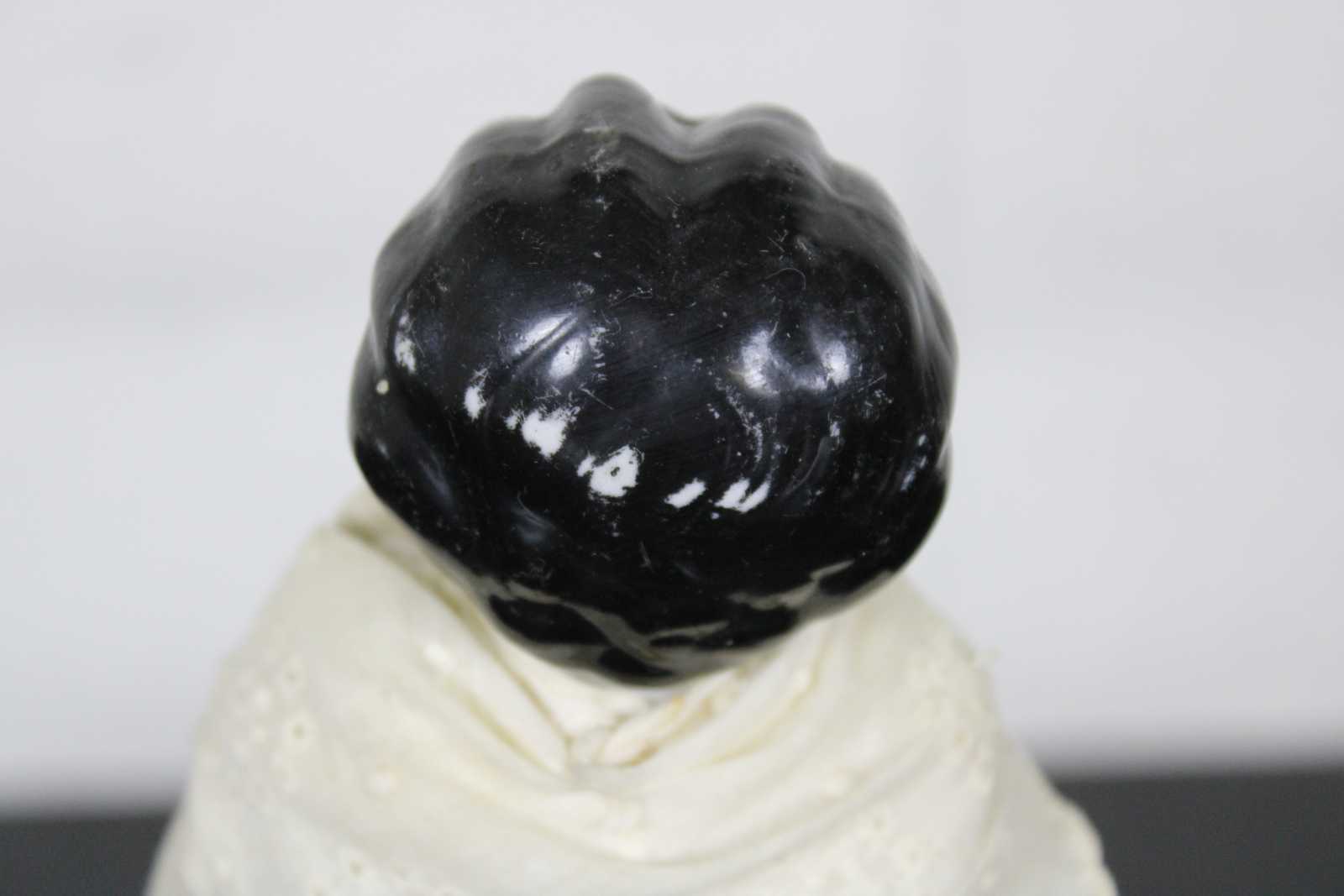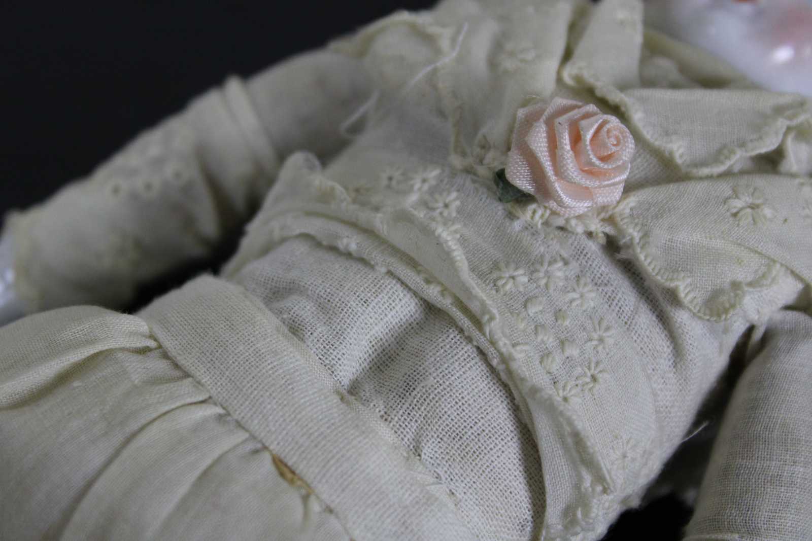 Antique 19th century German china head doll with black hair and blue eyes, dressed in a well kept lace dress with rose; displayed on a contemporary doll stand.