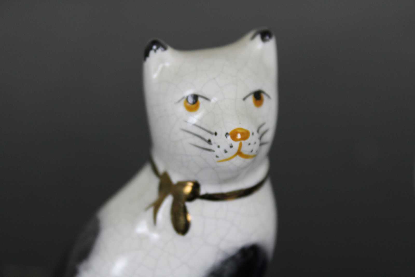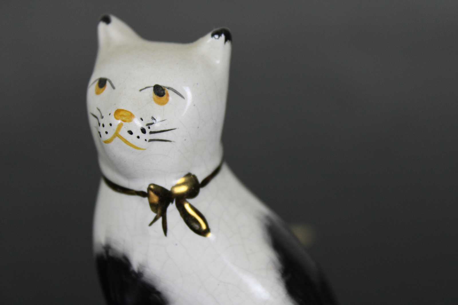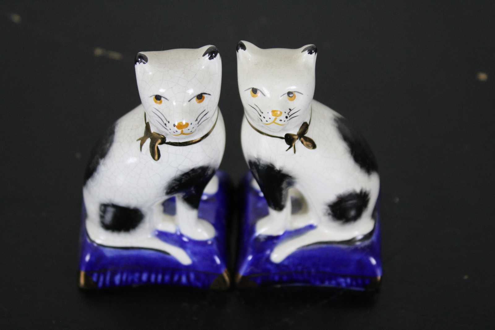 Pair of antique Staffordshire porcelain miniature black and white spotted cat figurines.