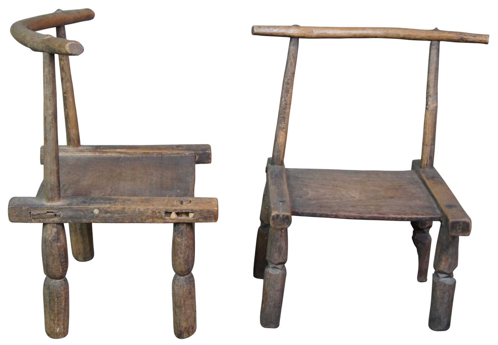 Two primitive carved African Baule chairs. Made from indigenous local woods featuring yoke back, short legs and flat seat.