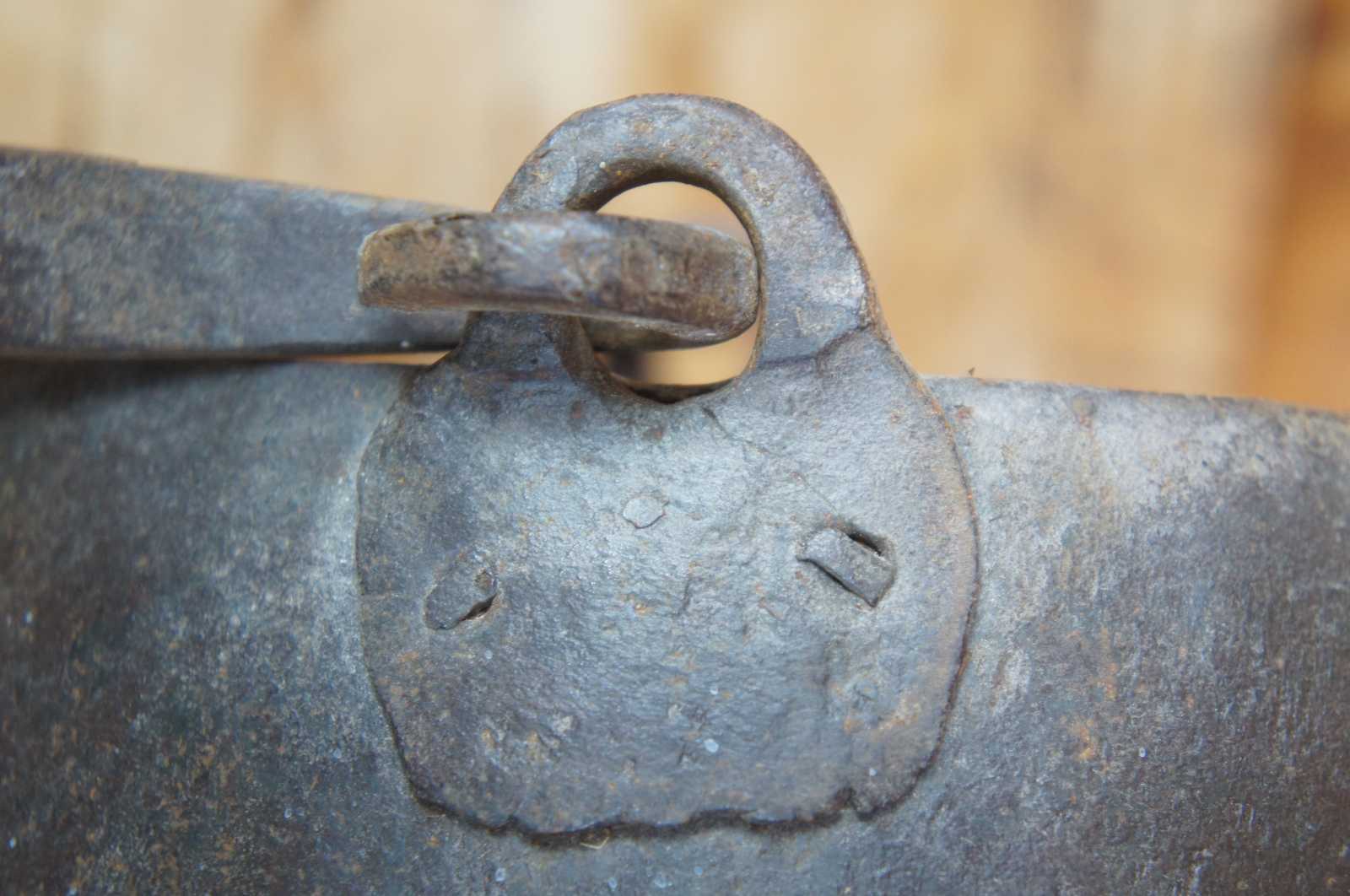 Antique primitive Tibetan / Nepal cast iron hanging fireplace hearthware cauldron featuring rounded form with hammered and forged accents.