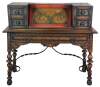 20th century Jacobean / Spanish Revival secretary desk. Made from walnut with hand carved and painted detail. Features five drawers and interior cubbies for storage. Attributed to Berkey and Gay Furniture Co of Grand Rapids Michigan.