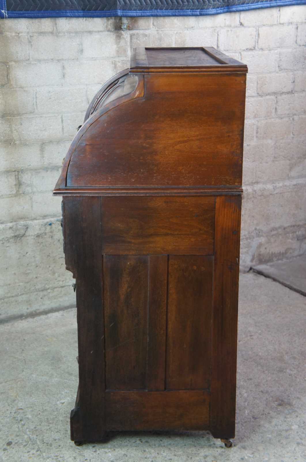 Antique Victorain period Eastlake cylinder roll top secretary writing desk, circa 1880s. Made of walnut featuring lower chest with three drawers, a half cylinder roll top that opens to pullout writing surface with multiple drawers and cubbies, and aesthetic period brass hardware. Includes a key.