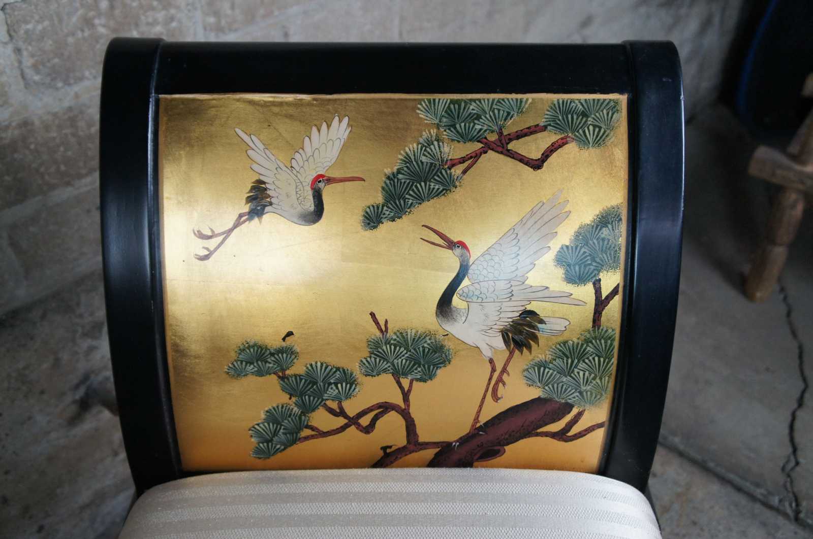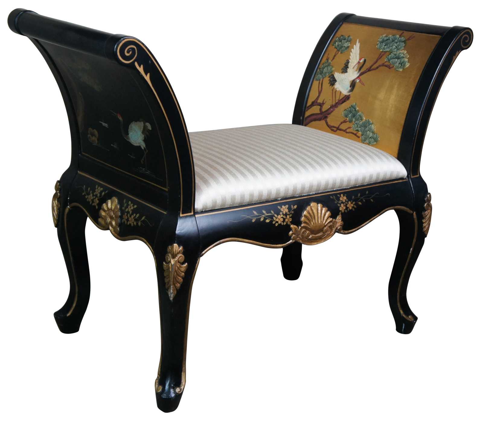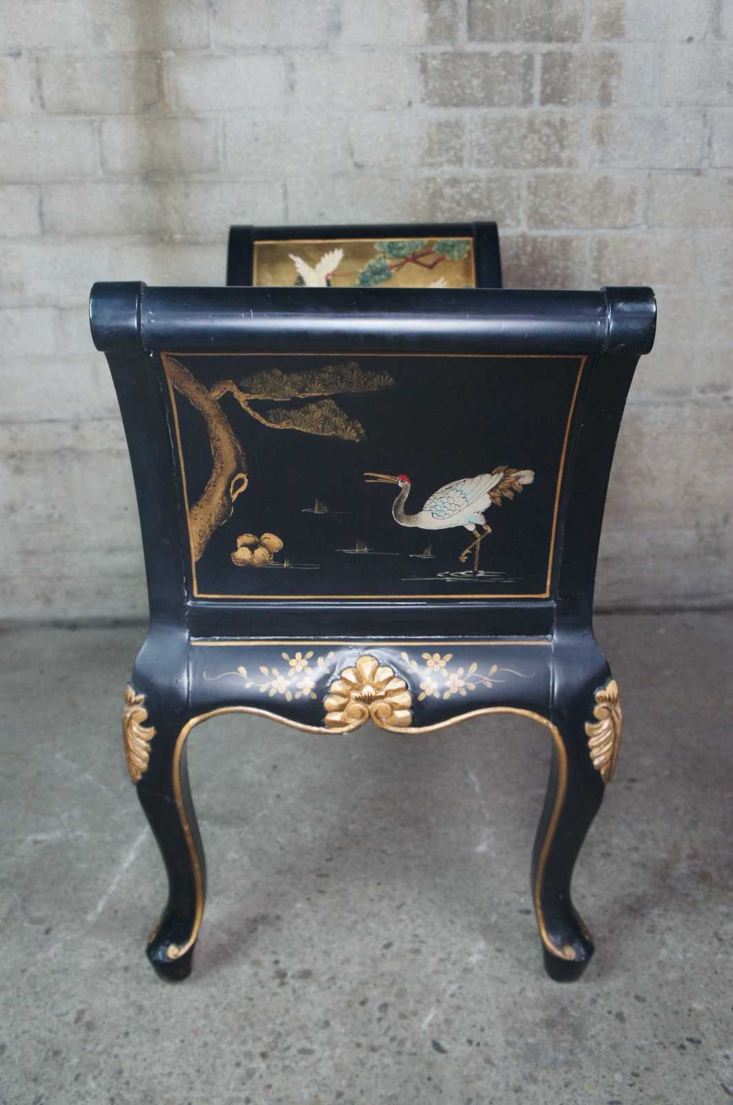 Vintage Oriental or Chinese Chippendale Chinoiserie black lacquer and gold leaf bench seat featuring French scalloped form with shells and painted scenes of cranes flying in the trees.