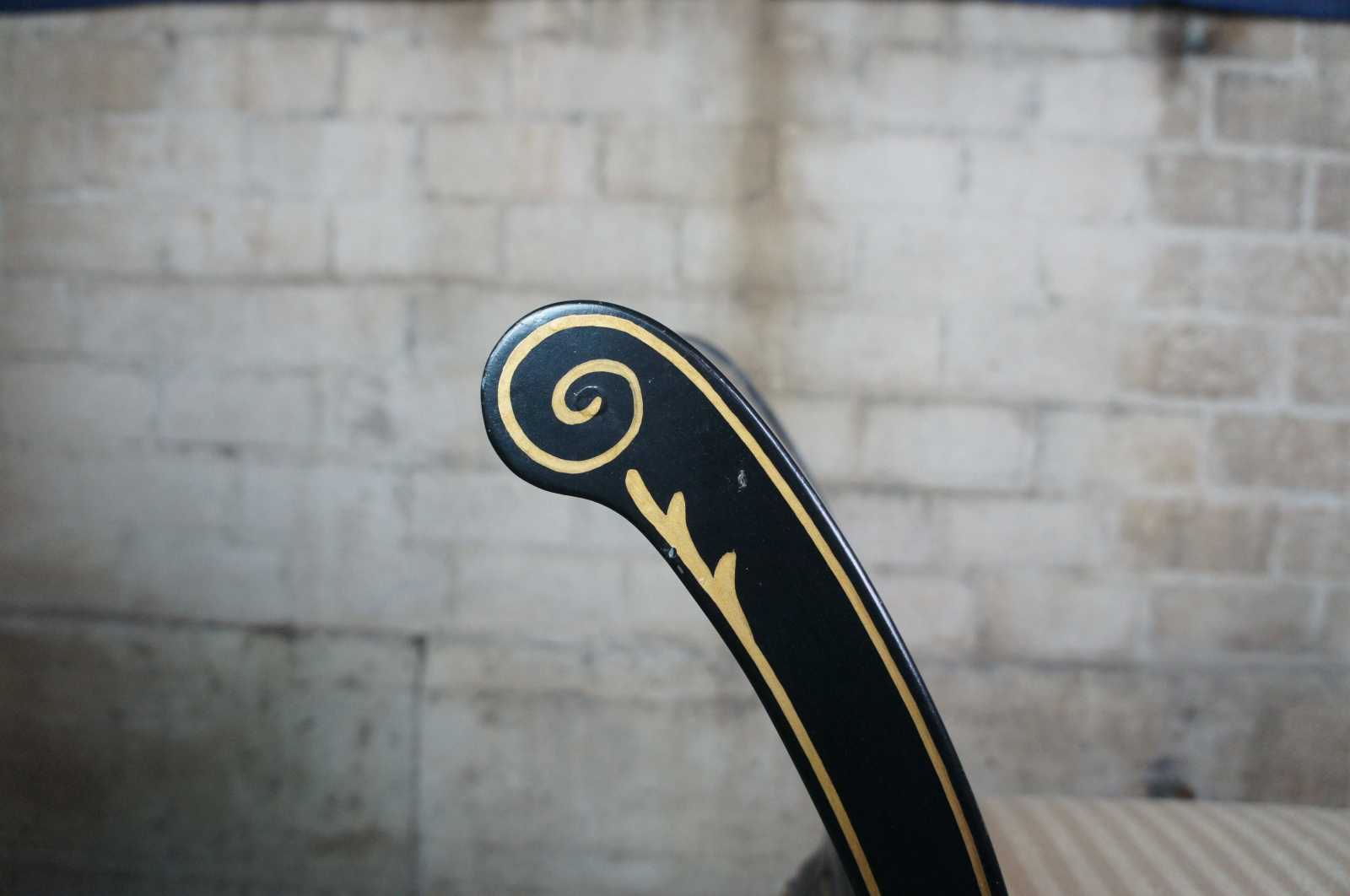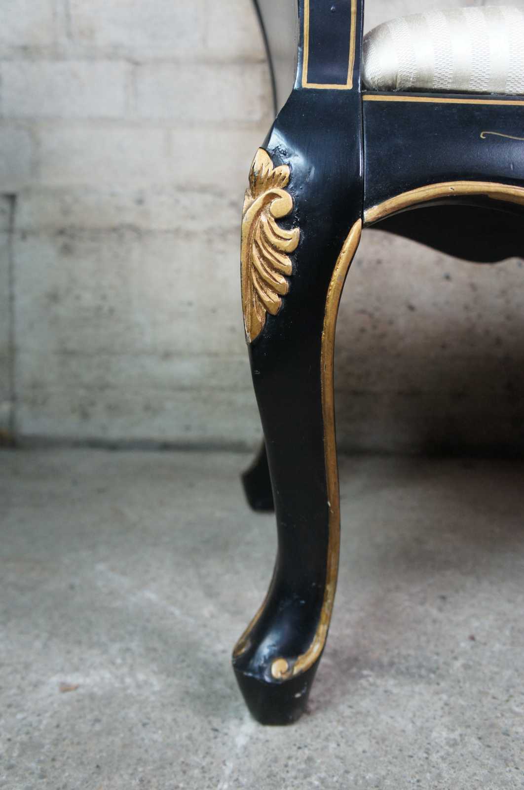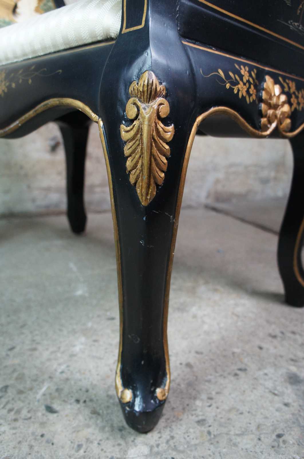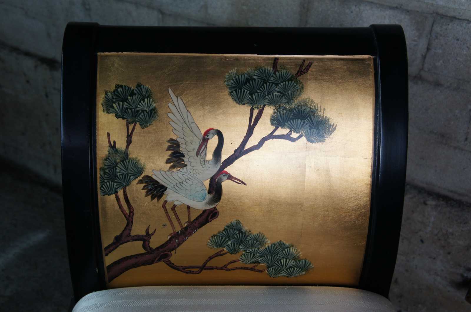 Vintage Oriental or Chinese Chippendale Chinoiserie black lacquer and gold leaf bench seat featuring French scalloped form with shells and painted scenes of cranes flying in the trees.
