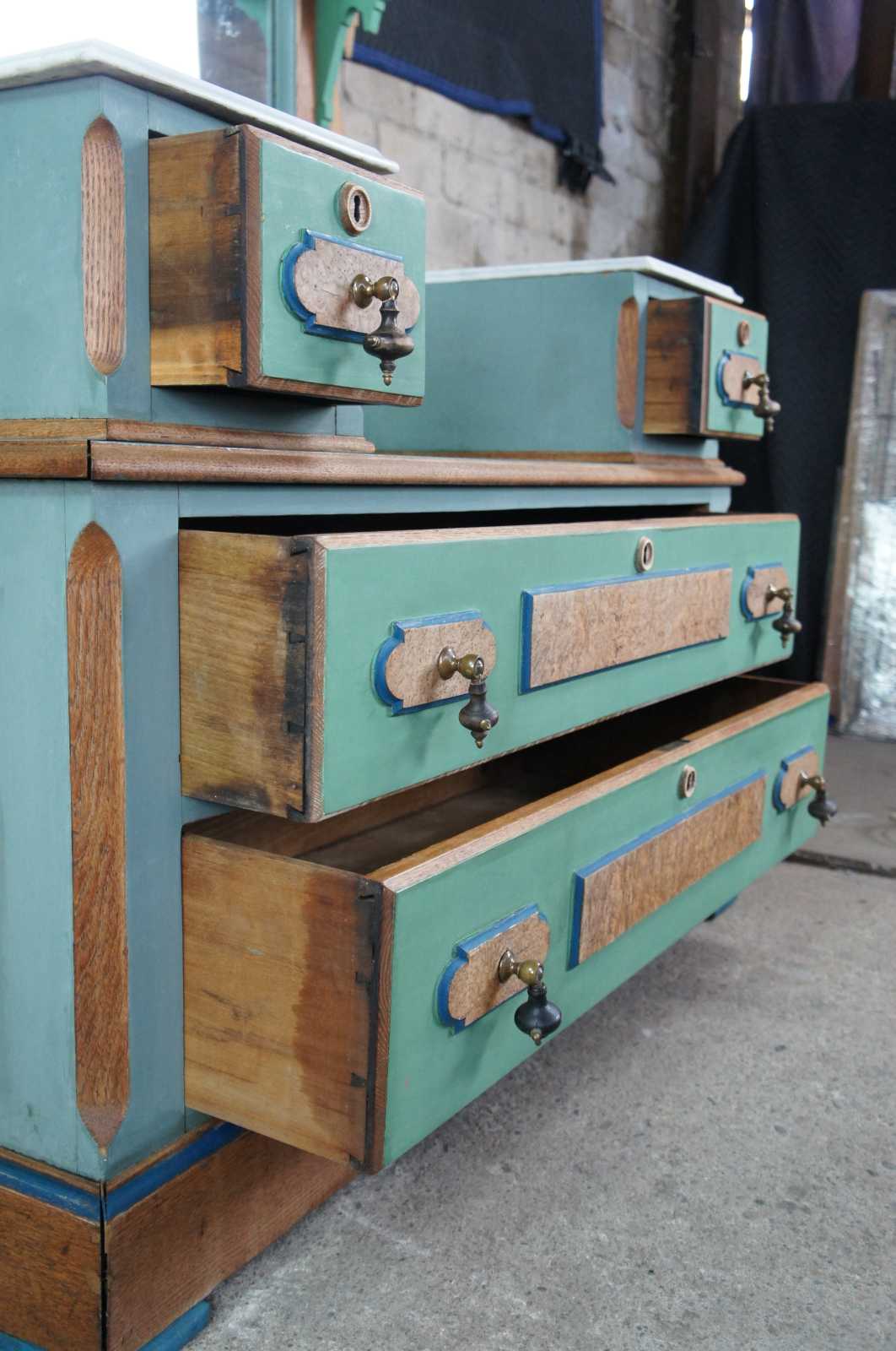 Antique Victorian Eastlake gentlemans dropwell mirrored vanity dresser or shaving / wash stand. Made of oak featuring birdseye maple panels with painted accents, marble tops, and multiple drawers with brutalist tear drop pulls.